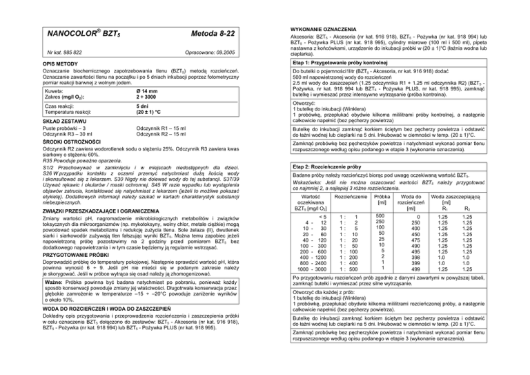 NANOCOLOR® BZT5 Metoda 8-22 Nr kat. 985 822 Opracowano: 09.2005 OPIS METODY Oznaczanie biochemicznego zapotrzebowania tlenu (BZT5) metodą rozcieńczeń. Oznaczanie zawartości tlenu na początku i po 5 dniach inkubacji poprzez fotometryczny pomiar reakcji barwnej z wolnym jodem. Kuweta: Zakres (mg/l O2): Ø 14 mm 2 ÷ 3000 Czas reakcji: Temperatura reakcji: 5 dni (20 ± 1) °C SKŁAD ZESTAWU Puste probówki – 3 Odczynnik R3 – 30 ml Odczynnik R1 – 15 ml Odczynnik R2 – 15 ml ŚRODKI OSTROŻNOŚCI Odczynnik R2 zawiera wodorotlenek sodu o stężeniu 25%. Odczynnik R3 zawiera kwas siarkowy o stężeniu 60%. R35 Powoduje poważne oparzenia. S1/2 Przechowywać w zamknięciu i w miejscach niedostępnych dla dzieci. S26 W przypadku kontaktu z oczami przemyć natychmiast dużą ilością wody i skonsultować się z lekarzem. S30 Nigdy nie dolewać wody do tej substancji. S37/39 Używać rękawic i okularów / maski ochronnej. S45 W razie wypadku lub wystąpienia objawów zatrucia, kontaktować się natychmiast z lekarzem (jeżeli to możliwe pokazać etykietę). Dodatkowych informacji należy szukać w kartach charakterystyk substancji niebezpiecznych. ZWIĄZKI PRZESZKADZAJĄCE I OGRANICZENIA Zmiany wartości pH, nagromadzenie mikrobiologicznych metabolitów i związków toksycznych dla mikroorganizmów (np. mykotoksyny, wolny chlor, metale ciężkie) mogą powodować spadek metabolizmu i redukcję zużycia tlenu. Sole żelaza (II), dwutlenek siarki i siarkowodór zużywają tlen fałszując wyniki BZT5. Można temu zapobiec jeżeli napowietrzoną próbę pozostawimy na 2 godziny przed pomiarem BZT5 bez dodatkowego napowietrzania i w tym czasie będziemy ją regularnie wstrząsać. PRZYGOTOWANIE PRÓBKI Doprowadzić próbkę do temperatury pokojowej. Następnie sprawdzić wartość pH, która powinna wynosić 6 ÷ 9. Jeśli pH nie mieści się w podanym zakresie należy je skorygować. Jeśli w próbce wytrąca się osad należy ją zhomogenizować. Ważne: Próbka powinna być badana natychmiast po pobraniu, ponieważ każdy sposób konserwacji powoduje zmiany jej właściwości. Długotrwała konserwacja przez głębokie zamrożenie w temperaturze –15 ÷ –20°C powoduje zaniżenie wyników o około 10%. WODA DO ROZCIEŃCZEŃ I WODA DO ZASZCZEPIEŃ Dokładny opis przygotowania i przeprowadzenia rozcieńczenia i zaszczepienia próbki w celu oznaczenia BZT5 dołączono do zestawów: BZT5 - Akcesoria (nr kat. 916 918), BZT5 - Pożywka (nr kat. 918 994) lub BZT5 - Pożywka PLUS (nr kat. 918 995). WYKONANIE OZNACZENIA Akcesoria: BZT5 - Akcesoria (nr kat. 916 918), BZT5 - Pożywka (nr kat. 918 994) lub BZT5 - Pożywka PLUS (nr kat. 918 995), cylindry miarowe (100 ml i 500 ml), pipeta nastawna z końcówkami, urządzenie do inkubacji próbki w (20 ± 1)°C (łaźnia wodna lub cieplarka). Etap 1: Przygotowanie próby kontrolnej Do butelki o pojemności1litr (BZT5 - Akcesoria, nr kat. 916 918) dodać 500 ml napowietrzonej wody do rozcieńczeń 2.5 ml wody do zaszczepień (1.25 odczynnika R1 + 1.25 ml odczynnika R2) (BZT5 Pożywka, nr kat. 918 994 lub BZT5 - Pożywka PLUS, nr kat. 918 995), zamknąć butelkę i wymieszać przez intensywne wytrząsanie (próba kontrolna). Otworzyć: 1 butelkę do inkubacji (Winklera) 1 probówkę, przepłukać obydwie kilkoma mililitrami próby kontrolnej, a następnie całkowicie napełnić (bez pęcherzy powietrza) Butelkę do inkubacji zamknąć korkiem ściętym bez pęcherzy powietrza i odstawić do łaźni wodnej lub cieplarki na 5 dni. Inkubować w ciemności w temp. (20 ± 1)°C. Zamknąć probówkę bez pęcherzyków powietrza i natychmiast wykonać pomiar tlenu rozpuszczonego według opisu podanego w etapie 3 (wykonanie oznaczenia). Etap 2: Rozcieńczenie próby Badane próby należy rozcieńczyć biorąc pod uwagę oczekiwaną wartość BZT5. Wskazówka: Jeśli nie można oszacować wartości BZT5 należy przygotować co najmniej 2, a najlepiej 3 różne rozcieńczenia. Wartość oczekiwana BZT5 [mg/l O2] 4 10 20 40 100 200 400 800 1000 - <5 12 30 60 120 300 600 1200 2400 3000 Rozcieńczenie 1 1 1 1 1 1 1 1 1 1 : : : : : : : : : : 1 2 5 10 20 50 100 200 400 500 Próbka [ml] 500 250 100 50 25 10 5 2 1 1 Woda do rozcieńczeń [ml] 0 250 400 450 475 490 495 398 399 499 Woda zaszczepiającą [ml] R1 R2 1.25 1.25 1.25 1.25 1.25 1.25 1.25 1.0 1.0 1.25 1.25 1.25 1.25 1.25 1.25 1.25 1.25 1.0 1.0 1.25 Po przygotowaniu rozcieńczeń prób zgodnie z danymi zawartymi w powyższej tabeli, zamknąć butelki i wymieszać przez silne wytrząsanie. Otworzyć dla każdej z prób: 1 butelkę do inkubacji (Winklera) 1 probówkę, przepłukać obydwie kilkoma mililitrami rozcieńczonej próby, a następnie całkowicie napełnić (bez pęcherzy powietrza). Butelkę do inkubacji zamknąć korkiem ściętym bez pęcherzy powietrza i odstawić do łaźni wodnej lub cieplarki na 5 dni. Inkubować w ciemności w temp. (20 ± 1)°C. Zamknąć probówkę bez pęcherzyków powietrza i natychmiast wykonać pomiar tlenu rozpuszczonego według opisu podanego w etapie 3 (wykonanie oznaczenia). NANOCOLOR® BZT5 Nr kat. 985 822 Metoda 8-22 Opracowano: 09.2005 (ciąg dalszy) Etap 3: Pomiar tlenu rozpuszczonego Uwaga: Następujący opis wykonania pomiaru tlenu dotyczy metody manualnej z wykorzystaniem zebranych danych do wykonania obliczeń. Automatyczny ® pomiar BZT5 za pomocą fotometru NANOCOLOR 300D opisuje oddzielna instrukcja. Probówki okrągłe mogą być wykorzystywane wielokrotnie (zawsze po dokładnym oczyszczeniu). Można też zamówić dodatkowy zestaw pustych probówek okrągłych (nr kat. 916 80). Oznaczenie zawartości tlenu w próbie na początku inkubacji. Wykonać oznaczenie natychmiast po napełnieniu probówki okrągłej badaną próbą. Oznaczenie zawartości tlenu w próbie po 5 dniach inkubacji. Wykonać oznaczenie natychmiast po napełnieniu probówki okrągłej próbą z butelki do inkubacji (Winklera). Wykonanie oznaczenia: Wytrzeć zewnętrzną powierzchnię