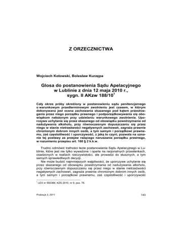 Glosa do postanowienia SA w Lublinie z dnia 12.V.2010 r. Z ORZECZNICTWA Wojciech Kotowski, Bolesław Kurzępa Glosa do postanowienia Sądu Apelacyjnego w Lublinie z dnia 12 maja 2010 r., sygn. II AKzw 188/101 Cały okres próby określony w postanowieniu sądu penitencjarnego o warunkowym przedterminowym zwolnieniu jest czasem, w którym dokonywana jest ocena zachowania skazanego pod kątem przestrzegania przez niego porządku prawnego i podporządkowywania się obowiązkom nałoŜonym przy udzielaniu warunkowego zwolnienia. Uporczywe uchylanie się przez skazanego od obowiązku powstrzymania od naduŜywania alkoholu, przy równoczesnym dopuszczaniu się przez niego w stanie nietrzeźwości negatywnych zachowań, zagraŜa prawnie chronionym dobrom innych osób, a tym samym i porządkowi prawnemu, zaś częstotliwość i uporczywość, z jaką to czyni, pozwala na uznanie tej postawy za przejaw raŜącego naruszania porządku prawnego, w rozumieniu przepisu art. 160 § 2 k.k.w. Trudno odmówić trafności tezie postanowienia Sądu Apelacyjnego w Lublinie, które jest nie tylko wywaŜone i oparte na racjonalnych przesłankach, osadzonych w realiach rzeczywistości, ale prowadzi do słusznych, a tym samych sprawiedliwych decyzji. Nie moŜe budzić najmniejszych wątpliwości, Ŝe uporczywe uchylanie się przez skazanego od obowiązku powstrzymania od naduŜywania alkoholu, przy równoczesnym dopuszczaniu się przez niego w stanie nietrzeźwości negatywnych zachowań, zagraŜa prawnie chronionym dobrom innych osób, a tym samym i porządkowi prawnemu, zaś częstotliwość i uporczywość 1 LEX nr 593384, KZS 2010, nr 9, poz. 76. Probacja 3, 2011 143 W. Kotowski, B. Kurzępa z jaką to czyni, pozwala na uznanie tej postawy za przejaw raŜącego naruszania porządku prawnego, w rozumieniu przepisu art. 160 § 2 k.k.w. Terapia, na którą zdecydował się skazany pod przymusem (rzecz jasna w obliczu realnej groźby odbycia pozostałej części kary), gwarantuje nikłe, a w zasadzie prawie Ŝadne, szanse na powodzenie. Leczenie z uzaleŜnienia moŜe dać bowiem pozytywne efekty jedynie w sytuacji istnienia silnego postanowienia zerwania z nałogiem i wytrwania w abstynencji osoby dotkniętej chorobą alkoholową. Stan faktyczny Postanowieniem z dnia 3 lutego 2010 r. Sąd Okręgowy w Lublinie, przyjmując za podstawę przepis art. 160 § 2 k.k.w., odwołał warunkowe przedterminowe zwolnienie z kary roku pozbawienia wolności wymierzonej wyrokiem Sądu Rejonowego w R. P. z dnia 29 czerwca 2005 r., udzielone R. K. postanowieniem Sądu Okręgowego w Ł. z dnia 14 lipca 2009 r. Na podstawie art. 624 § 1 k.p.k. w zw. z art. 1 § 2 k.k.w. zwolnił skazanego od poniesionych wydatków i określił, Ŝe ponosi je Skarb Państwa. ZaŜalenie na powyŜsze postanowienie wniósł skazany. ZaskarŜając przedmiotowe orzeczenie, R. K. argumentował, Ŝe obecnie przebywa on na leczeniu odwykowym, którego wcześniej podjąć nie mógł z uwagi na brak miejsc na właściwym oddziale. Pracy zarobkowej nie podjął, poniewaŜ posiada gospodarstwo rolne, które prowadzi wraz z Ŝoną. Z kolei jego Ŝona w 2008 r. uległa wypadkowi i w związku z powikłaniami, które w trakcie leczenia wystąpiły, nadal się leczy i korzysta ze zwolnienia lekarskiego. Stan prawny Stanowisko Sądu Apelacyjnego uznającego, Ŝe zaŜalenie skazanego jest niezasadne, a zatem na uwzględnienie nie zasługuje, zostało oparte na wnikliwej analizie zachowania ocenianego. Przede wszystkim naleŜy wskazać, co zresztą Sąd miał w polu widzenia, Ŝe cały okres próby określony w postanowieniu sądu penitencjarnego o warunkowym przedterminowym zwolnieniu jest czasem, w którym dokonywana jest ocena zachowania skazanego pod kątem przestrzegania przez niego porządku prawnego i podporządkowywania się obowiązkom nałoŜonym przy udzielaniu warunkowego zwolnienia. Zatem oceniając postawę R. K., w kontekście przesłanek wskazanych w art. 160 § 2 k.k.w., Sąd Okręgowy doszedł do słusznego przekonania, Ŝe zachodzą podstawy do odwołania mu warunkowego przedterminowego 144 Probacja 3, 2011 Glosa do postanowienia SA w Lublinie z dnia 12.V.2010 r. zwolnienia. Stanowisko to nie mogło zostać obalone argumentami podniesionymi przez skarŜącego, wszak było w ocenie glosatorów par excellence prawidłowo uzasadnione. Analiza akt sprawy nie pozostawia bowiem Ŝadnych wątpliwości, Ŝe skazany R. K. w okresie próby – bezpośrednio od momentu opuszczenia zakładu karnego – notorycznie naduŜywał alkoholu, pijąc wielodniowymi ciągami. Nie realizował on zatem nałoŜonego nań w momencie warunkowego zwolnienia obowiązku powstrzymania się od naduŜywania alkoholu. W takiej sytuacji truizmem jest twierdzenie, Ŝe alkohol powoduje degradację społeczną kaŜdej osoby, a więc i skazanego, i skutkuje sprzecznymi z prawem zachowaniami. Pod jego wpływem wszczynał on bowiem awantury domowe, podczas których dopuszczał się aktów agresji słownej i fizycznej wobec swoich – będących w podeszłym wieku – rodziców oraz niszczył wyposaŜenie gospodarstwa domowego, w związku z czym wielokrotnie miały miejsce interwencje Policji. PowyŜsze okoliczności nie są przez skarŜącego kwestionowane. Na dodatek R. K. wraz ze swoją Ŝoną zakłócali spokój i spoczynek nocny pozostałym domownikom, często urządzając głośne libacje alkoholowe. Motywowany wielokrotnie przez kuratora, nie przejawiał on Ŝadnej woli zerwania z nałogiem i chęci zmiany dotychczasowego stylu Ŝycia. Zobowiązał się wobec kuratora do podjęcia terapii dla osób uzaleŜnionych od alkoholu, jednakŜe na ustalony na dzień 16 grudnia 2009 r. termin jej rozpoczęcia nie stawił się, zaś 20 stycznia 2010 r., wprawdzie zgłosił się w Oddziale Odwykowym SP ZOZ w R. celem odbycia tej terapii, jednakŜe nie został przyjęty, gdyŜ znajdował się pod silnym wpływem alkoholu. Do wskazanej wyŜej placówki zgłosił się ponownie i podjął leczenie 