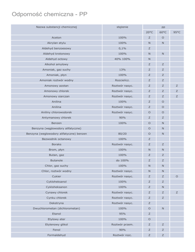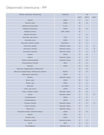 Odporność chemiczna - PP Nazwa substancji chemicznej stężenie pp 20°C 60°C Aceton 100% Z O Akrylan etylu 100% N N Aldehyd benzoesowy 0,1% Z Aldehyd krotonowy 100% N Aldehyd octowy 40% 100% N Alkohol amylowy 95°C N Z Z Amoniak, gaz suchy 13% Z Z Amoniak, płyn 100% Z Z Amoniak roztwór wodny Rozcieńcz. Z Z Amonowy azotan Roztwór nasyc. Z Z Z Amonowy chlorek Roztwór nasyc. Z Z Z Amonowy siarczan Roztwór nasyc. Z Z Z Anilina 100% Z O Anilina Roztwór nasyc. Z O Aniliny chlorowodorek Roztwór nasyc. O O Antymanowy chlorek 90% Z Z Benzen 100% O N O N N Benzyna (węglowodory alifatyczne) Benzyna (weglowodory alifatyczne) benzen 80/20 O Bezwodnik octanowy 100% Z Boraks Roztwór nasyc. Z Z Brom, płyn 100% N N Butan, gaz 100% Z Z Butanole do 100% Z Z Chlor, gaz suchy 100% N N Chlor, roztwór wodny Roztwór nasyc. N N Cukier Roztwór nasyc. Z Z Cykloheksanol 100% Z Z Cykloheksanon 100% Z N Cynawy chlorek Roztwór nasyc. Z Z Cynku chlorek Roztwór nasyc. Z Z Dekstryna Roztwór nasyc. Z Dwuchlorometan (dichlorometan) 100% O Etanol 95% Z Etylowy eter 100% O Etylenowy glikol Roztwór przem. Z Z Fenol 90% Z Z Formaldehyd Roztwór rozc. Z Z N O Z Formaldehyd 40% Z Z Gliceryna 100% Z Z Heksan 100% Z O Ksylen 100% O N Kwas azotowy do 45% Z Z Kwas azotowy 50 do 98% O N Kwas benzoesowy Roztwór nasyc. Z Z Kwas borowy Roztwór rozc. Z Z Kwas chlorosulfonowy 100% N N Kwas chlorowodorowy (solny) 20% Z Z Kwas chlorowodorowy (solny) > 30% Z Z Kwas chromowy 1÷50% Z O Kwas cytrynowy Roztwór nasyc. Z Z Z Kwas cytrynowy Roztwór nasyc. Z Z Z Kwas fluorowodorowy 40% Z Z Kwas fluorowodorowy 60% Z Z Kwas fluorowodorowy, gaz 100% Z Z Kwas glikolowy 30% Z Z Kwas mlekowy 10% Z Z Kwas mlekowy 10÷90% Z Z Kwas mrówkowy 1÷50% Z Z Kwas octowy 25% Z Z Kwas octowy 60% Z Z Kwas octowy Lodowaty Z O Kwas oleinowy 100% Z Kwas siarkowy 96% Z O Kwas siarkowy 40÷90% Z Z Kwas siarkowy dymiacy (oleum) 10% S03 N Z Kwas szczawiowy Roztwór nasyc. Z Z Kwas szczawiowy Roztwór rozc. Z Z Kwas taninowy Roztwór nienasyc. Z Z Kwas winowy do 10% Z Z Magnezowy chlorek Roztwór nasyc. Z Z Magnezowy siarczan Roztwór nasyc. Z Z Metanol 100% Z Z Miedziowy chlorek Roztwór nasyc. Z Z Miedziowy fluorek 2% Z Z Miedziowy siarczan Roztwór nasyc. Z Z Mleko Z Z Mocz Z Z Mocznik 10% Z Z Mydło Roztwór nienasyc. Z Z Niklawy siarczan Roztwór nasyc. Z Z Z Z Z Z O Ocet do 8% Z Z Octan butylu 100% Z O Octan etylu 100% O O Oleje i tłuszcze Z Ozon 100% Z O Pirydyna do 100% Z O Piwo Z Potasowy azotan Roztwór nasyc. Z Z Potasowy bromek Roztwór nasyc. Z Z Potasowy chlorek Roztwór nasyc. Z Z Z Potasowy chromian 40% Z Z Z Potasowy cyjanek Roztwór nienas. Z Z Potasowy dwuchromian 40% Z Z Potasowy nad/dwutleno/siarczan Roztwór nasyc. Z Potasowy nadmanganian 20% Z Potasowy wodorotlenek Roztwór nienasyc. Z Potasowy żelazicyjanek Roztwór nasyc. Z Potasowy żelazocyjanek Roztwór nasyc. Z Propan ciekły 100% Z Siarki dwutlenek, ciecz 100% Z Z Siarki dwutlenek, suchy 100% Z Z Siarkowodór, gaz 100% Z Z Sodowy benzoensan 35% Z Sodowy chloran Roztwór nasyc. Z Z Sodowy chlorek Roztwór nasyc. Z Z Sodowy podchloryn (13% chloru) 100% Z Z Sodowy siarczyn Roztwór nasyc. Z Z Sodowy wodorosiarczek Roztwór nasyc. Z Z Sodowy wodorotlenek Roztwór nasyc. Z Z Sodowy zelazicyjanek Roztwór nasyc. Z Sodowy żelazocyjanek Roztwór nasyc. Z Srebra azotan Roztwór nasyc. Z Tlen 100% Z Z Toluen 100% O N Trójchloroetylen (TRI) 100% O N Wapniowy azotan 50% Z Z Węgla dwusiarczek 100% O N Wino Z Z Woda morska Z Z O Wodoru nadtlenek 30% Z O Wywoływacze fotograficzne Roztwór przem. Z Z Legenda: Z – odporność zadowalająca; O – odporność ograniczona; N – niezadowalająca odporność Z Z Z
