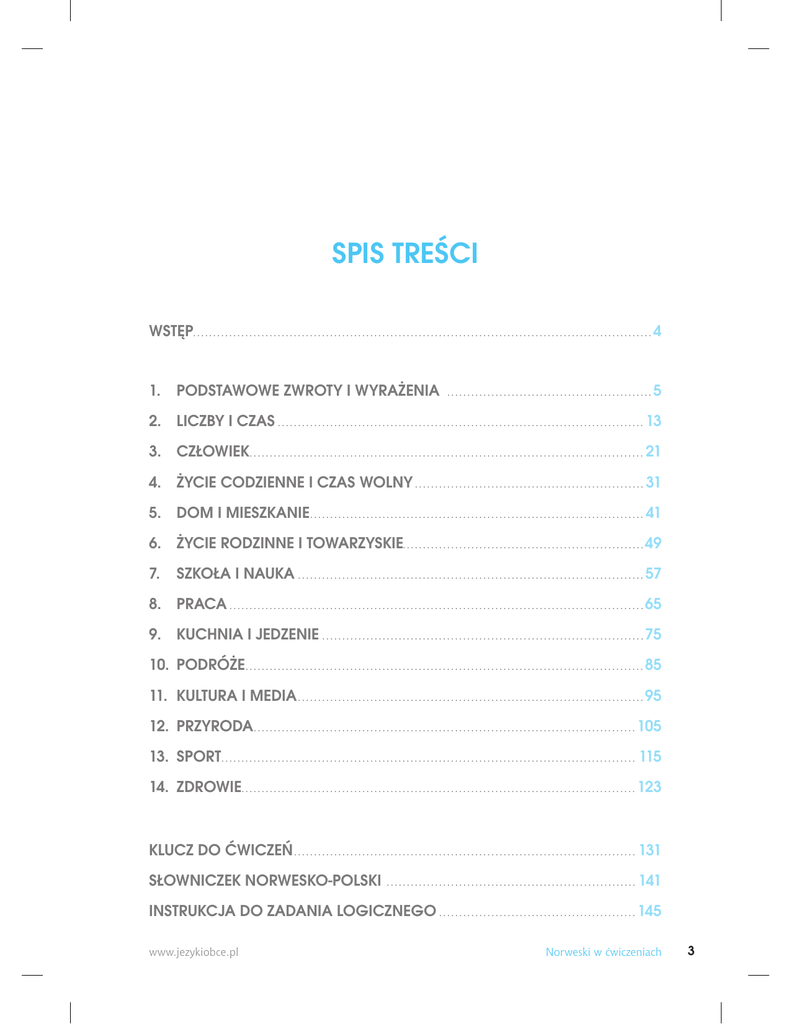 SPIS TREŚCI WSTĘP. . . . . . . . . . . . . . . . . . . . . . . . . . . . . . . . . . . . . . . . . . . . . . . . . . . . . . . . . . . . . . . . . . . . . . . . . . . . . . . . . . . . . . . . . . . . . . . . . . . . . . . . . . . . . . . . . . 4 1. PODSTAWOWE ZWROTY I WYRAŻENIA ................................................... 5 2. LICZBY I CZAS . . . . . . . . . . . . . . . . . . . . . . . . . . . . . . . . . . . . . . . . . . . . . . . . . . . . . . . . . . . . . . . . . . . . . . . . . . . . . . . . . . . . . . . . . . . 13 3. CZŁOWIEK . . . . . . . . . . . . . . . . . . . . . . . . . . . . . . . . . . . . . . . . . . . . . . . . . . . . . . . . . . . . . . . . . . . . . . . . . . . . . . . . . . . . . . . . . . . . . . . . . . 21 4. ŻYCIE CODZIENNE I CZAS WOLNY . . . . . . . . . . . . . . . . . . . . . . . . . . . . . . . . . . . . . . . . . . . . . . . . . . . . . . . . . 31 5. DOM I MIESZKANIE . . . . . . . . . . . . . . . . . . . . . . . . . . . . . . . . . . . . . . . . . . . . . . . . . . . . . . . . . . . . . . . . . . . . . . . . . . . . . . . . . . . 41 6. ŻYCIE RODZINNE I TOWARZYSKIE. . . . . . . . . . . . . . . . . . . . . . . . . . . . . . . . . . . . . . . . . . . . . . . . . . . . . . . . . . . . 49 7. SZKOŁA I NAUKA . . . . . . . . . . . . . . . . . . . . . . . . . . . . . . . . . . . . . . . . . . . . . . . . . . . . . . . . . . . . . . . . . . . . . . . . . . . . . . . . . . . . . . 57 8. PRACA . . . . . . . . . . . . . . . . . . . . . . . . . . . . . . . . . . . . . . . . . . . . . . . . . . . . . . . . . . . . . . . . . . . . . . . . . . . . . . . . . . . . . . . . . . . . . . . . . . . . . . . 65 9. KUCHNIA I JEDZENIE . . . . . . . . . . . . . . . . . . . . . . . . . . . . . . . . . . . . . . . . . . . . . . . . . . . . . . . . . . . . . . . . . . . . . . . . . . . . . . . . 75 10. PODRÓŻE . . . . . . . . . . . . . . . . . . . . . . . . . . . . . . . . . . . . . . . . . . . . . . . . . . . . . . . . . . . . . . . . . . . . . . . . . . . . . . . . . . . . . . . . . . . . . . . . . . . 85 11. KULTURA I MEDIA . . . . . . . . . . . . . . . . . . . . . . . . . . . . . . . . . . . . . . . . . . . . . . . . . . . . . . . . . . . . . . . . . . . . . . . . . . . . . . . . . . . . . . 95 12. PRZYRODA . . . . . . . . . . . . . . . . . . . . . . . . . . . . . . . . . . . . . . . . . . . . . . . . . . . . . . . . . . . . . . . . . . . . . . . . . . . . . . . . . . . . . . . . . . . . . . . 105 13. SPORT. . . . . . . . . . . . . . . . . . . . . . . . . . . . . . . . . . . . . . . . . . . . . . . . . . . . . . . . . . . . . . . . . . . . . . . . . . . . . . . . . . . . . . . . . . . . . . . . . . . . . . . 115 14. ZDROWIE. . . . . . . . . . . . . . . . . . . . . . . . . . . . . . . . . . . . . . . . . . . . . . . . . . . . . . . . . . . . . . . . . . . . . . . . . . . . . . . . . . . . . . . . . . . . . . . . . . 123 KLUCZ DO ĆWICZEŃ . . . . . . . . . . . . . . . . . . . . . . . . . . . . . . . . . . . . . . . . . . . . . . . . . . . . . . . . . . . . . . . . . . . . . . . . . . . . . . . . . . . . . 131 SŁOWNICZEK NORWESKO-POLSKI .............................................................. 141 INSTRUKCJA DO ZADANIA LOGICZNEGO . . . . . . . . . . . . . . . . . . . . . . . . . . . . . . . . . . . . . . . . . . . . . . . . . 145 www.jezykiobce.pl Norweski w ćwiczeniach 3 3 CZŁOWIEK 3.1 Przeczytaj poniższe opisy i zapoznaj się z nowymi słówkami. Kim Wang er 20 år gammel. Hun kommer fra Kina, men bor nå i Oslo. Der studerer hun psykologi. Hun er interessert i design og mote. Daniel Falk er en norsk gutt på 5 år. Han bor i Tromsø. Neste år skal han begynne på skolen. Han er svært interessert i fly og drømmer om å bli flyver. Barbara Tomaszewska kommer fra Polen. Hun er 28 år gammel og bor i Bergen. Hun jobber som tolk. Hun liker å lese krimbøker, spille tennis og gå turer i skogen. Carlos Paz er fra Mexico. Han er 30 år og bor innen Drammen. Han har utdannelse i økonomi og markedsføring, og jobber som eiendomsmegler. Han elsker å være ute i naturen, høre på rockemusikk og spille golf. www.jezykiobce.pl Norweski w ćwiczeniach 21 CZŁOWIEK 3.2 Po przeczytaniu opisów z ćwiczenia 3.1 zdecyduj, czy poniższe zdania są prawdziwe (R) czy fałszywe (G). 1. Alle personene kommer fra Norge. R/G 2. To av dem er under utdanning. R/G 3. Både Barbara og Carlos bruker tid på friluftsliv. R/G 4. En av personene bor i Nord-Norge. R/G 5. Bare en av dem kommer fra Europa. R/G 6. Carlos og Kim bor ikke langt fra hverandre. R/G 7. Barbaras jobb er å oversette muntlig fra et språk til et annet. R/G 8. Kims store interesse er mat. R/G Po przeczytaniu opisów z ćwiczenia 3.1 odpowiedz na pytania. 9. Hvem liker ballspill? ........................................................................................................................................................... 10. Hvem bor på Østlandet, og hvem bor på Vestlandet? ........................................................................................................................................................... 3.3 Na podstawie opisów z ćwiczenia 3.1 ułóż opis, używając danych z ramki. 25 år / Aleksander Gundersen / Norge / Stavanger / journalist / å reise ................................................................................................................................................................. ................................................................................................................................................................. ................................................................................................................................................................. ................................................................................................................................................................. 22 Norweski w ćwiczeniach LICZBY I CZAS 2.6 Przeczytaj dialogi, a następnie połąc