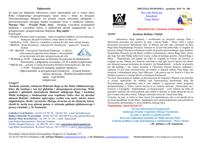 Ogłoszenia Za nami już Skupienie Adwentowe, które wprowadziło nas w ważny okres Roku Liturgicznego przygotowujący nasze serca i domy na przyjęcie Nowonarodzonego Mesjasza. Na przekór wszem obecnemu zabieganiu i powierzchowności chciejmy bardzo świadomie trwać w modlitwie tęsknoty: Marana Tha! - Przyjdź Panie Jezu! Dziękuję wszystkim uczestnikom spotkania i wszystkim, którzy w jakikolwiek sposób zaangażowali się w przygotowanie i przeprowadzenie skupienia. Bóg zapłać! Przed nami: * 13.12.14 -Rocznica stanu wojennego – dzień szczególnej modlitwy za nasza Ojczyznę. Zachęcam, aby jeśli to możliwe, wziąć udział we Mszy św. * 14.12.14, g. 18.00 – Msza św. w katedrze w intencji Ks. Bp. Jana z okazji imienin. * 18.12.14 – Dzień Przymierza - Adoracja NS i Eucharystia – oprawa lit; - Związek Rodzin * 25 – 26.12.14 – Uroczystość Narodzenia Pańskiego – w obliczu wielu realnych zagrożeń wiary dbajmy o chrześcijański styl przeżywania tych dni i przygotowania do nich. * 31.12.14, g. 24.00 – Zapraszamy na Pasterkę Noworoczna do Sanktuarium Zawierzenia, a półgodziny wcześniej o 23.30 wspólne kolędowanie. * 4.01.15, ndz., - gościmy w naszej diecezjalnej Rodzinie Szensztackiej Ks. Bp. Jana. o 16.00 – Eucharystia następnie spotkanie opłatkowe. Odpowiedzialni: za przygotowanie Eucharystii - Związek Rodzin; oprawa muzyczna – Rodzina Szczeblewskiech agapa – Liga Rodzin kolędowanie Uwaga!!! Kochani, jesteśmy wdzięczni Dobremu Bogu za dar Roku Jubileuszowego, który dla każdego z nas był głębokim i ubogacającym przeżyciem. Wiele spotkań i głębokich doświadczeń bliskości miłującego Boga i kochanej Matki królującej z Sanktuarium oraz wspólnoty, która chce się określać mianem Rodziny. Jednakże upływający szybko czas może zatrzeć nawet najpiękniejsze chwile i przeżycia. Dlatego zwracam się do chętnych, którzy chcieli by myślą oraz piórem pomóc w zebraniu pokłosia jubileuszowego i proszę o kontakt. s. M. Emanuela. Ludwika i Lech Bodzek - tel.(52) 373-50- 69, 720 263 766 , e-mail [email protected] Halina i Sławomir Przewoźniak - tel.661 925 587, 602 609 916,e-mail [email protected] Bożena i Piotr Kruczkowscy - tel. 503 141 165 , e-mail [email protected] Liga Rodzin Szensztackich - Diecezja Toruńska: Wanda i Bogdan Pniewscy:- tel. 609 789 441, e-mail [email protected] Liga Matek Szensztackich:: Krystyna Turczyn - 661 57 02 37, e-mail [email protected] DIECEZJA BYDGOSKA – grudzień 2014 Nr 186 Nos cum Prole pia benedicat Virgo Maria Nawróćcie się i wierzcie w Ewangelię. NCPP! Kochane Rodziny i Matki! Adwentowe drogi tęsknoty i oczekiwania na przyjście naszego Pana i Zbawiciela prowadzą nas również do Jego i naszej Matki – Maryi. Dziś z całym Kościołem uroczyście obchodzimy fakt, że Maryja, jak nikt inny, otrzymała od Pana Boga łaskę Niepokalanego Poczęcia. Oznacza to, że jest Ona pełna łaski, ze względu na przyszłe zasługi Chrystusa ochroniona została od grzechu pierworodnego i jego skutków. Niepokalane Poczęcie jest dla Maryi wielkim wyróżnieniem i darem Boga, który chciał, aby Jego Syn miał Matkę całkowicie czystą, wolną od każdego grzechu. Zamysł Boga o Maryi – Niepokalanej, jest jednak nie tylko ze względu na Jezusa, ale również ze względu na nas. Maryja jest obrazem człowieka z raju, gdy jeszcze grzech nie istniał, jest obrazem naszego powołania do świętości. Jej Niepokalaność – wolność od grzechu, jest dla każdego z nas, którzy jesteśmy w Chrystusie dziećmi Bożymi, zadaniem i radością. To jest nasze przeznaczenie od wieków w planach miłości Pana Boga: być świętymi i nieskalanymi przez Jego Obliczem – jak poucza nas św. Paweł w Liście do Efezjan czytanym w Liturgii Słowa w dzisiejszej Eucharystii. Na czym zatem polega to zadanie, to przeznaczenie do świętości? Właśnie czas Adwentu w swoim zaproszeniu do refleksji nad koniecznością prostowania dróg dla Przychodzącego, przypomina nam o tym zadaniu, a tegoroczne motto programu duszpasterskiego w Polsce wprost nazywa je po imieniu, mówiąc: „Nawracajcie się i wierzcie w Ewangelię”. Niepokalaność, to bezgrzeszność – czyli wolność nie tylko od grzechów ciężkich, ale i powszednich, taka stałość w dobrym, że żadna okazja do zła nie jest w stanie człowieka zwieść. Takiego człowieka stworzył i chciał mieć Bóg. Ćwiczmy się więc, w walce ze złem, nawet tym najmniejszym, aby w ten sposób już tu na ziemi upodabniać się do Maryi. Zapełniajmy tym samym kapitał łask naszej Królowej Zawierzenia i powtarzajmy w sercu modlitwę naszego Ojca: Niepokalana, obym był jak Ty! Na czas adwentowych przygotowań radosnego trwania w tajemnicy Bożego Narodzenia życzymy w sposób szczególny tej łask, która nas najbardziej upodobni do Matki naszego Pana. Z darem modlitwy u stóp Niepokalanej w Sanktuarium – Wasze Siostry s.M. Adriana i s.M. Emanuela ___________________________________________________________________________________________________________________________________________________________ Diecezjalne Centrum Ruchu Szensztackiego: Bydgoszcz ul. Smukalska 113 Tel. (0-52) 340-20-14 Redakcja: s.M. Adriana Majnusz [email protected] i s.M. Emanuela [email protected] Strona internetowa: www.bydgoszcz.szensztat.pl Twoje przymierze - naszą misją Adwentowy Dzień Skupienia - 30.XI.2014 Głębokiej ciszy, pokoju i radości - Niech serca dla Jezusa żłóbkiem się stają... Nabożeństwo Zawierzenia miało ten sam przebieg co zawsze, ale zakończone było uroczystą koronacją MTA pielgrzymującej Magdy i Łukasza Niemczyckich. Ten akt oddania był szczególny, bo samej Królowej w obecności Jezusa w Najświętszym Sakramencie. Nadawało to temu zdarzeniu wielkiej mocy nie tylko dla nich – koordynatorów, ale i dla nas zgromadzonych wewnątrz i wokół Sanktuarium. Na Mszę św. przeszliśmy do auli Św. Jana Pawła II. W ciepłym i m