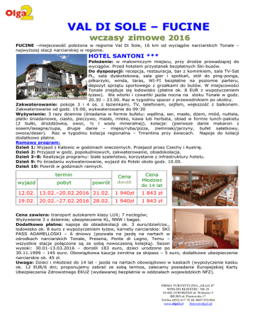 VAL DI SOLE – FUCINE wczasy zimowe 2016 FUCINE –miejscowość położona w regionie Val Di Sole, 16 km od wyciągów narciarskich Tonale – najwyższej stacji narciarskiej w regionie. HOTEL SANTONI *** Położenie: w malowniczym miejscu, przy drodze prowadzącej do wyciągów. Przed hotelem przystanek bezpłatnych Ski-busów. Do dyspozycji: recepcja, restauracja, bar z kominkiem, sala TV-Sat PL, sala dyskotekowa, sala gier i spotkań, stół do ping-ponga, piłkarzyki, winda, taras, WI-FI bezpłatne na poziomie parteru, depozyt sprzętu sportowego z grzałkami do butów. W miejscowości Tonale znajduje się lodowisko (płatne ok. 8 EUR z wypożyczeniem łyżew). We wtorki i czwartki jazda nocna na stoku Tonale w godz. 20.30 – 23.00. Raz w tygodniu spacer z przewodnikiem po okolicy. Zakwaterowanie: pokoje 3 i 4 os. z łazienkami, TV, telefonem, sejfem, większość z balkonem. Zakwaterowanie od godz. 15:00, wykwaterowanie do 09:30 Wyżywienie: 3 razy dziennie (śniadania w formie bufetu: wędlina, ser, masło, dżem, miód, nuttela, płatki śniadaniowe, ciasto, pieczywo, masło, mleko, kawa lub herbata, obiad w formie lunch-pakietu (2 bułki, drożdżówka, owoc, ½ l wody mineralnej), kolacje: (pierwsze danie makaron z sosem/lasagna/zupa, drugie danie – mięso/ryba/pizza, ziemniaki/jarzyny, bufet sałatkowy, owoce/deser). Raz w tygodniu kolacja regionalna – Trnentina przy świecach. Napoje do kolacji dodatkowo płatne. Ramowy program: Dzień 1: Wyjazd z Katowic w godzinach wieczornych. Przejazd przez Czechy i Austrię. Dzień 2: Przyjazd w godz. popołudniowych, zakwaterowanie, obiadokolacja. Dzień 3–8: Realizacja programu: białe szaleństwo, korzystanie z infrastruktury hotelu. Dzień 9: Po śniadaniu wykwaterowanie, wyjazd do Polski około godz. 10.00. Dzień 10: Powrót w godzinach rannych. termin wyjazd pobyt powrót Cena dorośli Cena Młodzież do 14 lat 12.02. 13.02.–20.02.2016 21.02. 1 940zł 1 843 zł 19.02. 20.02.–27.02.2016 28.02. 1 940zł 1 843 zł Cena zawiera: transport autokarem klasy LUX; 7 noclegów; Wyżywienie 3 x dziennie; ubezpieczenie KL, NNW i bagaż. Dodatkowo płatne: napoje do obiadokolacji ok. 3 euro/dzień/os., lodowisko ok. 8 euro z wypożyczeniem łyżew, karnety narciarskie: SKI PASS ADAMELLOSKI – 6 dniowy (pozwala na jazdę na nartach w ośrodkach narciarskich Tonale, Presena, Ponte di Legno, Temu – wszystkie stacje połączone są ze sobą nowoczesną kolejką). Sezon wysoki: 30.01-13.03.2016 – dorośli 183 euro, dzieci urodzone po 30.11.1999 – 145 euro. Obowiązkowa kaucja zwrotna za skipass – 5 euro, dodatkowe ubezpieczenie narciarskie ok. 45 zł. Uwaga: Dzieci i młodzież do 14 lat - jazda na nartach obowiązkowo w kaskach (wypożyczenie kasku ok. 12 EUR/6 dni; proponujemy zabrać ze sobą termos, zalecamy posiadanie Europejskiej Karty Ubezpieczenia Zdrowotnego EKUZ (wydawanej bezpłatnie w oddziałach wojewódzkich NFZ). FIRMA TURYSTYCZNA „OLGA II” WPIS DO REJESTRU NR 28 43-602 JAWORZNO ul: Wolności 5 BIURO ul: Piastowska 17 Tel/fax (032) 617 78 20, 0607 074 864 [email protected] www.olga2.pl