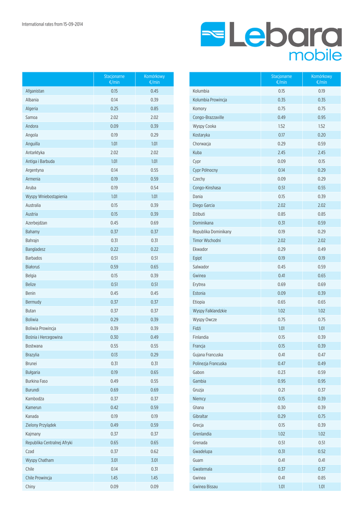 International rates from 15-09-2014 Stacjonarne €/min Komórkowy €/min Stacjonarne €/min Komórkowy €/min Afganistan 0.15 0.45 Kolumbia 0.15 0.19 Albania 0.14 0.39 Kolumbia Prowincja 0.35 0.35 Algeria Samoa 0.25 0.85 Komory 0.75 0.75 2.02 2.02 Congo-Brazzaville 0.49 0.95 Andora Angola 0.09 0.39 Wyspy Cooka 1.52 1.52 0.19 0.29 Kostaryka 0.17 0.20 Anguilla 1.01 1.01 Chorwacja 0.29 0.59 Antarktyka 2.02 2.02 Kuba 2.45 2.45 Antiga i Barbuda 1.01 1.01 Cypr 0.09 0.15 Argentyna 0.14 0.55 Cypr Północny 0.14 0.29 Armenia 0.19 0.59 Czechy 0.09 0.29 Aruba 0.19 0.54 Congo-Kinshasa 0.51 0.55 Wyspy Wniebostąpienia 1.01 1.01 Dania 0.15 0.39 Australia 0.15 0.39 Diego Garcia 2.02 2.02 Austria 0.15 0.39 Dżibuti 0.85 0.85 Azerbejdżan 0.45 0.69 Dominikana 0.31 0.59 Bahamy 0.37 0.37 Republika Dominikany 0.19 0.29 Bahrajn 0.31 0.31 Timor Wschodni 2.02 2.02 Bangladesz 0.22 0.22 Ekwador 0.29 0.49 Barbados 0.51 0.51 Egipt 0.19 0.19 Białoruś 0.59 0.65 Salwador 0.45 0.59 Belgia 0.15 0.39 Gwinea 0.41 0.65 Belize 0.51 0.51 Erytrea 0.69 0.69 Benin 0.45 0.45 Estonia 0.09 0.39 Bermudy 0.37 0.37 Etiopia 0.65 0.65 Butan 0.37 0.37 Wyspy Falklandzkie 1.02 1.02 Boliwia 0.29 0.39 Wyspy Owcze 0.75 0.75 Boliwia Prowincja 0.39 0.39 Fidźi 1.01 1.01 Bośnia i Hercegowina 0.30 0.49 Finlandia 0.15 0.39 Bostwana 0.55 0.55 Francja 0.15 0.39 Brazylia 0.13 0.29 Gujana Francuska 0.41 0.47 Brunei 0.31 0.31 Polinezja Francuska 0.47 0.49 Bułgaria 0.19 0.65 Gabon 0.23 0.59 Burkina Faso 0.49 0.55 Gambia 0.95 0.95 Burundi 0.69 0.69 Gruzja 0.21 0.37 Kambodża 0.37 0.37 Niemcy 0.15 0.39 Kamerun 0.42 0.59 Ghana 0.30 0.39 Kanada 0.19 0.19 Gibraltar 0.29 0.75 Zielony Przylądek 0.49 0.59 Grecja 0.15 0.39 Kajmany 0.37 0.37 Grenlandia 1.02 1.02 Republika Centralnej Afryki 0.65 0.65 Grenada 0.51 0.51 Czad 0.37 0.62 Gwadelupa 0.31 0.52 Wyspy Chatham 3.01 3.01 Guam 0.41 0.41 Chile 0.14 0.31 Gwatemala 0.37 0.37 Chile Prowincja 1.45 1.45 Gwinea 0.41 0.85 Chiny 0.09 0.09 Gwinea Bissau 1.01 1.01 International rates from 15-09-2014 Stacjonarne €/min Komórkowy €/min Gujana 0.69 0.69 Haiti 0.51 0.52 Stacjonarne €/min Komórkowy €/min Mauretania 0.69 0.69 Mauritius 0.41 0.41 Honduras 0.51 0.51 Wyspy Mayotte 0.77 0.77 Hong Kong 0.09 0.09 Meksyk 0.19 0.35 Węgry 0.09 0.39 Mikronezja 1.01 1.01 Islandia 0.15 0.39 Mołdawia 0.31 0.39 Indie 0.09 0.13 Monako 0.15 0.49 Indonezja 0.19 0.29 Mongolia 0.27 0.27 Iran 0.19 0.39 Montenegro 0.39 0.59 Irak 0.09 0.35 Monserat 0.41 0.41 Irlandia 0.15 0.39 Maroko 0.17 0.56 Izrael 0.09 0.22 Maroko WANA 0.56 0.56 Włochy 0.15 0.39 Mozambik 0.31 0.39 Wybrzeże Kości Słoniowej 0.69 0.69 Myanmar 0.75 0.75 Jamajka 0.39 0.55 Namibia 0.35 0.55 Japonia 0.12 0.29 Nauru 2.02 2.02 Jordania 0.27 0.32 Nepal 0.51 0.51 Kazachstan 0.37 0.37 Antyle Holenderskie 0.19 0.29 Kenia 0.15 0.25 Nowa Kalendonia 0.77 0.77 Kiribati 1.35 1.35 Nowa Zelandia 0.09 0.39 Korea Północna 1.01 1.01 Nikaragua 0.45 0.55 Korea Południowa 0.15 0.19 Niger 0.36 0.36 Kosowo 0.33 0.75 Nigeria 0.09 0.19 Kuwejt 0.22 0.29 Niue 2.01 2.01 Kirgistan 0.31 0.31 Wyspy Norfolk 2.01 2.01 Laos 0.31 0.31 Norwegia 0.15 0.39 Łotwa 0.09 0.29 Oman 0.37 0.55 Liban 0.29 0.49 Pakistan 0.25 0.25 Lesoto 0.51 0.51 Palau 2.01 2.01 Liberia 0.59 0.59 Palestyna 0.35 0.39 Libia 0.59 0.65 Panama 0.41 0.41 Liechtenstein 0.21 0.71 Papua Nowa Gwinea 1.69 1.69 Litwa 0.19 0.29 Paragwaj 0.31 0.41 Luksemburg 0.15 0.39 Peru 0.39 0.59 Macao 0.27 0.27 Peru Prowincja 0.29 0.29 Macedonia 0.31 0.59 Filipiny 0.25 0.39 Madagaskar 0.75 0.75 Polska 0.14 0.29 Malawi 0.18 0.39 Portugalia 0.15 0.39 Malezja 0.12 0.16 Puertoryko 0.17 0.17 Malediwy 0.59 0.59 Katar 0.45 0.49 Mali 0.69 0.69 Wyspa Reunion 0.31 0.51 Malta 0.09 0.39 Rumunia 0.09 0.29 Wyspy Mariana 2.02 2.02 Rosja 0.12 0.19 Wyspy Marszala 3.01 3.01 Rwanda 0.35 0.49 Martynika 0.52 0.52 San Marino 0.75 0.75 International rates from 15-09-2014 Stacjonarne €/min Komórkowy €/min 2.01 2.01 Arabia Saudyjska 0.19 Senegal 0.49 Serbia Seszele Sierra Leone 0.87 Wyspy Świętego Tomasza i Książęca Stacjonarne €/min Komórkowy €/min Urugwaj 0.15 0.35 0.35 Uzbekistan 0.27 0.27 0.78 Vanuatu 1.51 1.51 0.29 0.69 Watykan 0.51 0.51 0.69 0.69 Wenezuela 0.29 0.45 0.87 Wietnam 0.15 0.15 Singapur 0.14 0.14 Wyspy Dziewicze (Brytyjskie) 0.31 0.69 Słowacja 0.15 0.29 Wyspy Dziewicze (Stany Zjednoczone) 0.31 0.31 Słowenia 0.09 0.39 Wyspy Wallis i Futuna 4.01 4.01 Wyspy Salomona 2.02 2.02 Samoa 4.01 4.01 Somalia 0.89 0.89 Jemen 0.45 0.49 Południowa Afryka 0.16 0.44 Zambia 0.21 0.39 Sudan Południowy 0.35 0.45 Zimbabwe 0.35 1.09 Hiszpania 0.15 0.39 Sri Lanka 0.25 0.25 Sri Lanka Dialog 0.25 0.25 Sint Maarten 0.19 0.28 Św. Helena 2.01 2.01 Wyspy Świętego Krzysztofa i Nevis 0.69 0.69 Św. Łucja 0.75 0.75 St. Pierre i MIQUELON 2.02 2.02 Św. VINCENT I GRENADYNY 0.42 0.42 Sudan 0.35 0.45 Surinam 0.19 0.39 Swaziland 0.38 0.38 Szwecja 0.15 0.39 Szwajcaria 0.15 0.39 Syria 0.19 0.39 Tajwan 0.14 0.29 Tadżykistan 0.32 0.36 Tanzania 0.59 0.59 Tajlandia 0.09 0.16 Togo 0.89 0.89 Tokelau 2.01 2.01 Tongo 0.61 0.69 Trynidad i Tobago 0.31 0.31 Tunezja 0.44 0.79 Turcja 0.15 0.39 Turkmenistan 0.32 0.35 Wyspy Turks i Caicos 0.41 2.01 Tuvalu 2.01 2.01 Uganda 0.31 0.37 Ukraina 0.25 0.29 Zjednoczone Emiraty Arabskie 0.29 0.35 Wielka Brytania 0.15 0.39 USA 0.19 0.19
