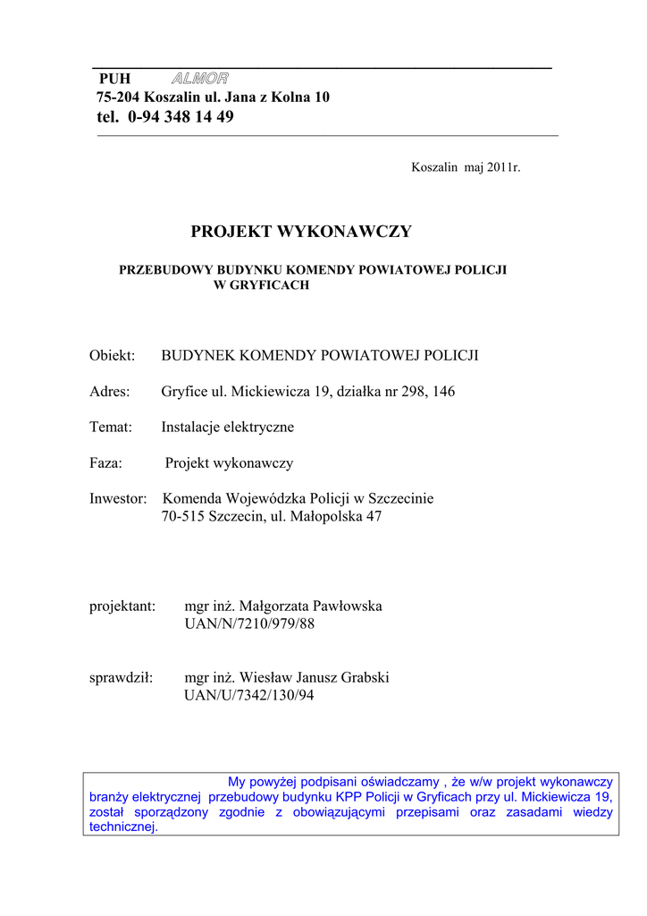 _______________________________________________ PUH ALMOR 75-204 Koszalin ul. Jana z Kolna 10 tel. 0-94 348 14 49 ________________________________________________________________________________________________________ Koszalin maj 2011r. PROJEKT WYKONAWCZY PRZEBUDOWY BUDYNKU KOMENDY POWIATOWEJ POLICJI W GRYFICACH Obiekt: BUDYNEK KOMENDY POWIATOWEJ POLICJI Adres: Gryfice ul. Mickiewicza 19, działka nr 298, 146 Temat: Instalacje elektryczne Faza: Projekt wykonawczy Inwestor: Komenda Wojewódzka Policji w Szczecinie 70-515 Szczecin, ul. Małopolska 47 projektant: mgr inż. Małgorzata Pawłowska UAN/N/7210/979/88 sprawdził: mgr inż. Wiesław Janusz Grabski UAN/U/7342/130/94 My powyżej podpisani oświadczamy , że w/w projekt wykonawczy branży elektrycznej przebudowy budynku KPP Policji w Gryficach przy ul. Mickiewicza 19, został sporządzony zgodnie z obowiązującymi przepisami oraz zasadami wiedzy technicznej. ZAWARTOŚĆ OPRACOWANIA 1. OPIS TECHNICZNY 2. OBLICZENIA 3. CZĘŚĆ GRAFICZNA 1. Plan sytuacyjny 1:500 2. Schemat ideowy 3. Rzut piwnic – instalacje elektryczne 1:100 4. Rzut parteru – instalacje elektryczne 1:100 5. Rzut I piętra – instalacje elektryczne 1:100 6. Rzut II piętra – instalacje elektryczne 1:100 7. Rzut III piętra – instalacje elektryczne 1:100 8. Schemat ideowy - tablice piętrowe 9. Schemat ideowy - tablica główna – odbiory parteru 10. Tablice rozdzielcze - widoki 1:10 2 OPIS TECHICZNY 1. Przedmiot opracowania Opracowanie niniejsze stanowi projekt wewnętrznych instalacji elektrycznych budynku Komendy Powiatowej Policji w Gryficach przy ul. Mickiewicza 19. 2. Podstawa opracowania - zlecenie i wytyczne Inwestora - warunki przyłączenia - inwentaryzacja - projekty i uzgodnienia branżowe - obowiązujące przepisy i normy 3. Zakres opracowania Opracowanie obejmuje instalacje elektryczne wewnętrzne. Instalacje teletechniczne stanowią odrębne opracowanie. Obiekt wyposażony będzie w następujące instalacje: - oświetlenia ogólnego i gniazd wtykowych - oświetlenia miejscowego - oświetlenia zewnętrznego - oświetlenia awaryjnego ewakuacyjnego - technologiczną - zasilania komputerów - sterującą i sygnalizacyjną- uziemiającą - przeciwporażeniową - przeciwprzepięciową - odgromową 4. Podstawowe dane energetyczne - zasilanie kablowe 0,4 kV - moc zainstalowana: 70,0 kW - moc przyłączeniowa: 40,0 kW - prąd obliczeniowy: 62,1 A - pomiar bezpośredni energii czynnej - ochrona dodatkowa od porażeń: samoczynne szybkie wyłączenie i wyłączniki przeciwporażeniowe 5. Stan istniejący i demontaże Obiekt zasilany jest z szafki kablowej WK-6, znajdującej się przy budynku od strony ul. Wołowa. Tablica główna obiektu z układem pomiarowym znajduje się na parterze. Zasilanie rezerwowe zapewnia agregat prądotwórczy, uruchamiany ręcznie. Budynek wyposażony jest w instalacje elektryczne, w tym w instalację odgromową. Na dachu znajduje się maszt radiowy. Instalacje komputerowe i odbiory gwarantowane zasilane są z tablicy RGK (nowa instalacja), które zasilane są z tablicy głównej obiektu. Instalacje w remontowanych pomieszczeniach należy zdemontować. 3 6. Układ zasilania i pomiar energii Od szafki kablowej do tablicy głównej na parterze ułożyć kabel zasilający YKY 5x50 mm2. Układ pomiarowy pozostaje w tablicy głównej w budynku. Zabezpieczenie przedlicznikowe wymienić na 63A. O zamiarze prowadzenia prac powiadomić RE Gyfice. W celu zapewnienia automatycznego załączania zasilania rezerwowego, przewidziano wymianę istniejącego agregatu prądotwórczego. Zaprojektowano agregat prądotwórczy, wyposażony w automatykę umożliwiającą samoczynny start po zaniku napięcia podstawowego. Z pomieszczenia agregatu do tablicy głównej R-G należy ułożyć kabel zasilający YKY 5x50 mm2 oraz sterownicze XzTKMXpwn 5x4x0,8 mm2. 7. Tablice rozdzielcze i wlz Rozdzielnicę główną R-G znajdującą się w korytarzu na parterze oraz tablice piętrowe przewidziano do wymiany. W R-G przewidziano jako wyłącznik główny przeciwpożarowy wyłącznik z możliwością sterowania przyciskiem umieszczonym w pomieszczeniu dyżurnego. Do zabezpieczenia obwodów odbiorczych zastosowano wyłączniki instalacyjne, obwody gniazd wtykowych zabezpieczono wyłącznikami przeciwporażeniowymi 30mA, dla zabezpieczenia obwodów zasilających tablice rozdzielcze zastosowano rozłączniki bezpiecznikowe. Z tablicy R-G do tablic piętrowych ułożyć wlz YKY 5x10 mm2 w RVS 37. Kable układać w piwnicy w rurach na uchwytach, na piętrach pod tynkiem. 8. Instalacja oświetlenia ogólnego i gniazd wtykowych Obwody oświetleniowe i gniazd wtykowych wykonać przewodami YDYp 3x1,5 mm2 układanymi w tynku. W łazienkach stosować osprzęt szczelny z tworzyw sztucznych, gniazda wtykowe instalować na wys. 1,2 m. W pozostałych pomieszczeniach osprzęt zwykły n/t-w/t 16A,gniazda instalować na wys. 25 cm. Wszystkie gniazda wtykowe stosować podwójne z uziemieniem. 9. Oświetlenie awaryjne ewakuacyjne Zaprojektowano oprawy oświetlenia awaryjnego ewakuacyjnego, wyposażone we własne źródła energii: baterie akumulatorów z inwerterami (czas świecenia min. 2 godziny). Oprawy muszą być wyposażone w piktogramy wskazujące kierunek ewakuacji zgodnie z normą PN-92/N-01256-02. Instalację zasilającą opraw oświetlenia ewakuacyjnego należy wykonać z wydzielonego obwodu przewodami kabelkowymi YDY 3x1,5 mm2, 750V, układanymi pod tynkiem. Jako uzupełnienie oświetlenia ewakuacyjnego zastosowano oprawy świetlówkowe awaryjno-użytkowe wchodzące w skład oświetlenia podstawowego korytarzy oraz klatek schodowych i pomieszczenia dyżurnego. W tym celu do oznaczonych na rys. opraw należy zamontować inwertery zapewniającym prąd min. 2 godzinny. Do tych opraw należy doprowadzić dodatkowy przewód fazowy wyprowadzony sprzed wyłącznika danej oprawy. 10. Instalacja dedykowana W pomieszczeniu łączności znajduje się główny punkt dystrybucy