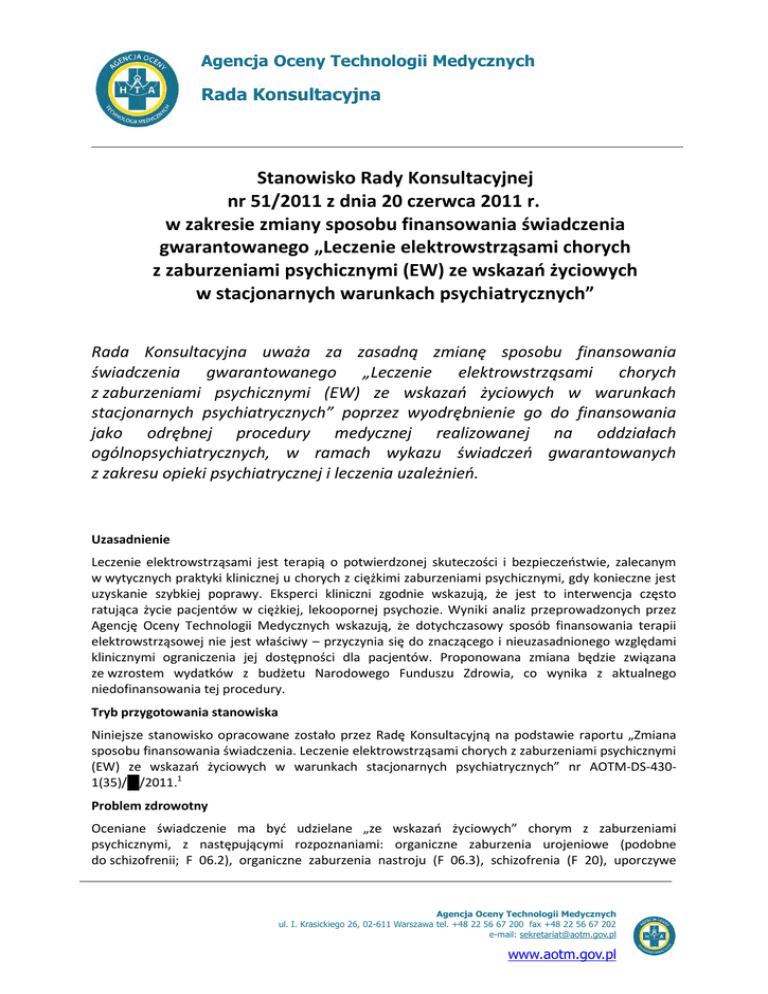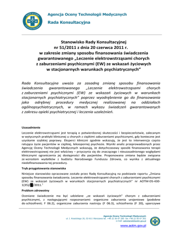 Agencja Oceny Technologii Medycznych Rada Konsultacyjna Stanowisko Rady Konsultacyjnej nr 51/2011 z dnia 20 czerwca 2011 r. w zakresie zmiany sposobu finansowania świadczenia gwarantowanego „Leczenie elektrowstrząsami chorych z zaburzeniami psychicznymi (EW) ze wskazao życiowych w stacjonarnych warunkach psychiatrycznych” Rada Konsultacyjna uważa za zasadną zmianę sposobu finansowania świadczenia gwarantowanego „Leczenie elektrowstrząsami chorych z zaburzeniami psychicznymi (EW) ze wskazao życiowych w warunkach stacjonarnych psychiatrycznych” poprzez wyodrębnienie go do finansowania jako odrębnej procedury medycznej realizowanej na oddziałach ogólnopsychiatrycznych, w ramach wykazu świadczeo gwarantowanych z zakresu opieki psychiatrycznej i leczenia uzależnieo. Uzasadnienie Leczenie elektrowstrząsami jest terapią o potwierdzonej skuteczości i bezpieczeostwie, zalecanym w wytycznych praktyki klinicznej u chorych z ciężkimi zaburzeniami psychicznymi, gdy konieczne jest uzyskanie szybkiej poprawy. Eksperci kliniczni zgodnie wskazują, że jest to interwencja często ratująca życie pacjentów w ciężkiej, lekoopornej psychozie. Wyniki analiz przeprowadzonych przez Agencję Oceny Technologii Medycznych wskazują, że dotychczasowy sposób finansowania terapii elektrowstrząsowej nie jest właściwy – przyczynia się do znaczącego i nieuzasadnionego względami klinicznymi ograniczenia jej dostępności dla pacjentów. Proponowana zmiana będzie związana ze wzrostem wydatków z budżetu Narodowego Funduszu Zdrowia, co wynika z aktualnego niedofinansowania tej procedury. Tryb przygotowania stanowiska Niniejsze stanowisko opracowane zostało przez Radę Konsultacyjną na podstawie raportu „Zmiana sposobu finansowania świadczenia. Leczenie elektrowstrząsami chorych z zaburzeniami psychicznymi (EW) ze wskazao życiowych w warunkach stacjonarnych psychiatrycznych” nr AOTM-DS-4301(35)/ /2011.1 Problem zdrowotny Oceniane świadczenie ma byd udzielane „ze wskazao życiowych” chorym z zaburzeniami psychicznymi, z następującymi rozpoznaniami: organiczne zaburzenia urojeniowe (podobne do schizofrenii; F 06.2), organiczne zaburzenia nastroju (F 06.3), schizofrenia (F 20), uporczywe Agencja Oceny Technologii Medycznych ul. I. Krasickiego 26, 02-611 Warszawa tel. +48 22 56 67 200 fax +48 22 56 67 202 e-mail: [email protected] www.aotm.gov.pl Stanowisko Rady Konsultacyjnej nr 51/2011 z dnia 20 czerwca 2011 r. zaburzenia urojeniowe (F 22), ostre i przemijające zaburzenie psychotyczne (F 23), indukowane zaburzenie urojeniowe (F 24), zaburzenie schizoafektywne (F 25), inne nieorganiczne zaburzenia psychotyczne (F 28), nieokreślona psychoza nieorganiczna (F 29), epizod maniakalny (F 30), zaburzenia afektywne dwubiegunowe (F 31), epizod depresyjny (F 32), zaburzenia depresyjne nawracające (F 33), inne zaburzenia nastroju (F 38) oraz zaburzenia nastroju nieokreślone (F 39).1 W opinii ekspertów klinicznych, obecnie w Polsce leczenie elektrowstrząsami (EW) jest najczęściej stosowane w ciężkich, zagrażających życiu, lekoopornych depresjach w przebiegu chorób afektywnych, zaburzeniach depresyjnych nawracających, w depresji w przebiegu zaburzeo afektywnych dwubiegunowych; rzadziej – w manii. Kolejną, ok. dwukrotnie mniejszą grupę chorych ze wskazaniami do tej terapii, stanowią pacjenci ze schizofrenią lekooporną.2 Z danych Narodowego Funduszu Zdrowia wynika, że populacja osób leczonych EW w latach 2009 i 2010, z rozpoznaniem schizofrenii lub choroby schizoafektywnej, jest niewiele mniejsza od grupy z zaburzeniami afektywnymi; aktualnie EW stosuje się u ok. osób rocznie.1 Choroby afektywne stanowią grupę zaburzeo psychicznych o etiologii endogennej, w przebiegu których okresowo występują zaburzenia nastroju, emocji i aktywności w postaci zespołów depresyjnych (zaburzenia depresyjne nawracające – choroba afektywna jednobiegunowa), a u części chorych – również zespołów maniakalnych (zaburzenia afektywne dwubiegunowe). Choroba afektywna dwubiegunowa zwykle zaczyna się przed 40. rokiem życia (najczęściej – 28-35 lat), a jednobiegunowa – po 40 r. ż. Do podstawowych objawów zespołu depresyjnego zaliczane są: obniżenie podstawowego nastroju, zahamowanie psychoruchowe, objawy somatyczne i zaburzenia rytmów biologicznych oraz lęk. Przebieg depresji i nasilenie objawów wykazuje dużą różnorodnośd, zarówno u poszczególnych chorych, jak i u tego samego chorego w kolejnych nawrotach. W lecznictwie psychiatrycznym najczęściej spotyka się typowe, w pełni rozwinięte formy depresji, o znacznym nasileniu cech i objawów. Zespół maniakalny jest w dużym stopniu przeciwstawieniem depresji. Do objawów podstawowych należą zaburzenia nastroju w postaci nastroju maniakalnego, podniecenie maniakalne (wzmożona aktywnośd ruchowa), zaburzenia licznych procesów fizjologicznych, metabolicznych i rytmów biologicznych oraz zaburzenia emocji (dysforia). Mania o maksymalnym nasileniu jest nazywana „szałem maniakalnym”. We w pełni rozwiniętym zespole maniakalnym aktywnośd celowa, w tym zdolnośd do pracy, jest znacząco zaburzona lub zniesiona. Zaburzenia afektywne jedno- i dwubiegunowe zazwyczaj nawracają, przy średniej liczbie nawrotów dwukrotnie większej w chorobie dwubiegunowej. Średnia długośd nawrotów (faz depresyjnych) wynosi 6 miesięcy w chorobie jednobiegunowej i 3 miesiące – w dwubiegunowej; w obu typach chorób w miarę trwania choroby dochodzi do skrócenia cykli i „zagęszczania faz”. Okresy oddzielające nawroty u blisko połowy chorych nie są remisjami w ścisłym tego słowa znaczeniu, a raczej stanami częściowej poprawy. Do najważniejszych problemów klinicznych związanych z chorobami afektywnymi należą próby samobójcze – zamachy samobójcze są przyczyną zgonu 1525% chorych, u których rozpoznano chorobę afektywną. Problemem są również powiązania tych chorób z nadużyw