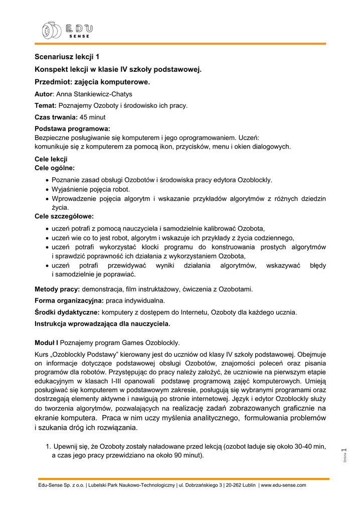 Scenariusz lekcji 1 Konspekt lekcji w klasie IV szkoły podstawowej. Przedmiot: zajęcia komputerowe. Autor: Anna Stankiewicz-Chatys Temat: Poznajemy Ozoboty i środowisko ich pracy. Czas trwania: 45 minut Podstawa programowa: Bezpieczne posługiwanie się komputerem i jego oprogramowaniem. Uczeń: komunikuje się z komputerem za pomocą ikon, przycisków, menu i okien dialogowych. Cele lekcji Cele ogólne: Poznanie zasad obsługi Ozobotów i środowiska pracy edytora Ozoblockly. Wyjaśnienie pojęcia robot. Wprowadzenie pojęcia algorytm i wskazanie przykładów algorytmów z różnych dziedzin życia. Cele szczegółowe: uczeń potrafi z pomocą nauczyciela i samodzielnie kalibrować Ozobota, uczeń wie co to jest robot, algorytm i wskazuje ich przykłady z życia codziennego, uczeń potrafi wykorzystać klocki programu do konstruowania prostych algorytmów i sprawdzić poprawność ich działania z wykorzystaniem Ozobota, uczeń potrafi przewidywać wyniki działania algorytmów, wskazywać błędy i samodzielnie je poprawiać. Metody pracy: demonstracja, film instruktażowy, ćwiczenia z Ozobotami. Forma organizacyjna: praca indywidualna. Środki dydaktyczne: komputery z dostępem do Internetu, Ozoboty dla każdego ucznia. Instrukcja wprowadzająca dla nauczyciela. Moduł I Poznajemy program Games Ozoblockly. Kurs „Ozoblockly Podstawy” kierowany jest do uczniów od klasy IV szkoły podstawowej. Obejmuje on informacje dotyczące podstawowej obsługi Ozobotów, znajomości poleceń oraz pisania programów dla robotów. Przystępując do pracy należy założyć, że uczniowie na pierwszym etapie edukacyjnym w klasach I-III opanowali podstawę programową zajęć komputerowych. Umieją posługiwać się komputerem w podstawowym zakresie, posługują się wybranymi programami oraz dostrzegają elementy aktywne i nawigują po stronie internetowej. Język i edytor Ozoblockly służy do tworzenia algorytmów, pozwalających na realizację zadań zobrazowanych graficznie na Edu-Sense Sp. z o.o. | Lubelski Park Naukowo-Technologiczny | ul. Dobrzańskiego 3 | 20-262 Lublin | www.edu-sense.com Strona 1. Upewnij się, że Ozoboty zostały naładowane przed lekcją (ozobot ładuje się około 30-40 min, a czas jego pracy przewidziano na około 90 minut). 1 ekranie komputera. Praca w nim uczy myślenia analitycznego, formułowania problemów i szukania dróg ich rozwiązania. tył Ozobota włącznik/wyłącznik przód Ozobota 2. Sprawdź, czy monitor komputera ma maksymalnie ustawioną jasność ekranu. 3. Do prawidlowego dzialania wymagana jest jedną z przeglądarek w wersji: Chrome 41, Firefox 26, MSIE 10, Opera 30, Safari 7 z włączoną opcją WebGL. 4. Zawsze chowaj roboty do oryginalnych pojemników po zakończeniu zajęć. Faza wprowadzająca Wprowadzenie pojęcia algorytm. Algorytm – przepis postępowania służący rozwiązaniu zadania. Wskazywanie przez uczniów przykładów algorytmów stosowanych na co dzień (przygotowanie jajecznicy, kupno biletu do kina, rozwiązywanie zadania a matematyki, uczenie się wiersza na pamięć itp.). Edytor Ozoblockly służy do tworzenia algorytmów (programów) wykonywanych przez Ozoboty. Faza realizacyjna 1. Uruchomienie programu poprzez wpisanie w polu adresu: http://games.ozoblockly.com 2. Przejście do pierwszego poziomu zadaniowego (Shape Tracer – level 1) 1 Strona 2 2 Edu-Sense Sp. z o.o. | Lubelski Park Naukowo-Technologiczny | ul. Dobrzańskiego 3 | 20-262 Lublin | www.edu-sense.com 3. Opis interfejsu użytkownika. Objaśnienie znaczenia klocków z bloku „Movement” (ruch) i „Light Effects” (lampka) Podgląd zadania Bloki Sprawdzanie poprawności działania algorytmu Wczytywanie kodu programu Pole do którego należy przyłożyć Ozobota aby wczytać program Ustawienia Cofnij Powtórz Kopiuj Kosz Strona 3 Kosz Edu-Sense Sp. z o.o. | Lubelski Park Naukowo-Technologiczny | ul. Dobrzańskiego 3 | 20-262 Lublin | www.edu-sense.com Ustawienia Resetuj grę Włącz/Wyłącz dźwięk Znaczenia klocków z bloku „Movement” (ruch) i „Light Effects” (lampka) kolor lampki ruch: do przodu, do tyłu; odległość (kroki); prędkość szybkość nieznacznie w lewo 45 stopni Strona 4 zawracanie w lewo Edu-Sense Sp. z o.o. | Lubelski Park Naukowo-Technologiczny | ul. Dobrzańskiego 3 | 20-262 Lublin | www.edu-sense.com 1. Wspólne wykonanie pierwszego ćwiczenia. Pokazanie w jaki sposób wybrać klocki z bloku „Movement” (ruch) i „Light Effects” (lampka) oraz ułożyć spójny algorytm działania Ozobota. Wykonanie programu – wciśnięcie przycisku „Run” (uruchom). 2. Wykonanie programu przez robota - instrukcja obsługi Ozobota: a. opis budowy robota (przód i tył z wejściem do włączania/wyłączania), ładowania, przycisk b. kalibracja – najwygodniej pokazać i przećwiczyć kroki zgodnie z filmem Robot - OzoBot - jak zacząć (https://www.youtube.com/watch?v=b3N1rVl6tXE – na Youtube – kanał edu-sense.com wciśnięcie włącznika i trzymanie 2 sek. do momentu pojawienia się migającego światła białego; przyłożenie Ozobota we właściwe miejsce na ekranie do momentu zaświecenia światła zielonego (gdy robot zaświeci się na inny kolor, czynność należy powtórzyć), c. włączenie robota (wciśnięcie włącznika tylko raz) i wczytanie algorytmu (klikniecie na ekranie przycisku „Load Ozobot”). Podczas ładowania programu Ozobot miga światłem zielonym (gdy zaświeci się kolor czerwony czynność należy powtórzyć), d. sprawdzenie poprawności działania algorytmu na płaszczyźnie (po załadowania programu wciśnij włącznik dwa razy „raz po razie”, tak jak to robisz używając myszki komputerowej). Strona 5 Faza podsumowująca Sprawdzenie stopnia zrozumienia omawianych zagadnień. Samodzielne wykonanie przez uczniów ćwiczenia 2. Sprawdzenie poprawności działania algorytmu na ekranie monitora i na płaszczyźnie. Edu-Sense Sp. z o.o. | Lubelski Park Naukowo-Technologiczny | ul. Dobrza