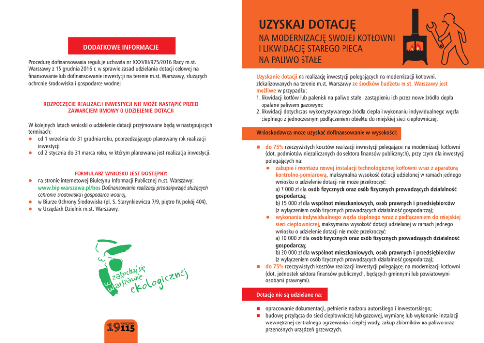 UZYSKAJ DOTACJĘ DODATKOWE INFORMACJE Procedurę donansowania reguluje uchwała nr XXXVIII/975/2016 Rady m.st. Warszawy z 15 grudnia 2016 r. w sprawie zasad udzielania dotacji celowej na nansowanie lub donansowanie inwestycji na terenie m.st. Warszawy, służących ochronie środowiska i gospodarce wodnej. ROZPOCZĘCIE REALIZACJI INWESTYCJI NIE MOŻE NASTĄPIĆ PRZED ZAWARCIEM UMOWY O UDZIELENIE DOTACJI W kolejnych latach wnioski o udzielenie dotacji przyjmowane będą w następujących terminach: l od 1 września do 31 grudnia roku, poprzedzającego planowany rok realizacji inwestycji, l od 2 stycznia do 31 marca roku, w którym planowana jest realizacja inwestycji. FORMULARZ WNIOSKU JEST DOSTĘPNY: na stronie internetowej Biuletynu Informacji Publicznej m.st. Warszawy: www.bip.warszawa.pl/bos Dofinansowanie realizacji przedsięwzięć służących ochronie środowiska i gospodarce wodnej, l w Biurze Ochrony Środowiska (pl. S. Starynkiewicza 7/9, piętro IV, pokój 404), l w Urzędach Dzielnic m.st. Warszawy. l NA MODERNIZACJĘ SWOJEJ KOTŁOWNI I LIKWIDACJĘ STAREGO PIECA NA PALIWO STAŁE Uzyskanie dotacji na realizację inwestycji polegających na modernizacji kotłowni, zlokalizowanych na terenie m.st. Warszawy ze środków budżetu m.st. Warszawy jest możliwe w przypadku: 1. likwidacji kotłów lub palenisk na paliwo stałe i zastąpieniu ich przez nowe źródło ciepła opalane paliwem gazowym; 2. likwidacji dotychczas wykorzystywanego źródła ciepła i wykonaniu indywidualnego węzła cieplnego z jednoczesnym podłączeniem obiektu do miejskiej sieci ciepłowniczej. Wnioskodawca może uzyskać donansowanie w wysokości: do 75% rzeczywistych kosztów realizacji inwestycji polegającej na modernizacji kotłowni (dot. podmiotów niezaliczanych do sektora nansów publicznych), przy czym dla inwestycji polegających na: l zakupie i montażu nowej instalacji technologicznej kotłowni wraz z aparaturą kontrolno-pomiarową, maksymalna wysokość dotacji udzielonej w ramach jednego wniosku o udzielenie dotacji nie może przekroczyć: l a) 7 000 zł dla osób zycznych oraz osób zycznych prowadzących działalność gospodarczą; l b) 15 000 zł dla wspólnot mieszkaniowych, osób prawnych i przedsiębiorców (z wyłączeniem osób zycznych prowadzących działalność gospodarczą); l wykonaniu indywidualnego węzła cieplnego wraz z podłączeniem do miejskiej sieci ciepłowniczej, maksymalna wysokość dotacji udzielonej w ramach jednego wniosku o udzielenie dotacji nie może przekroczyć: l a) 10 000 zł dla osób zycznych oraz osób zycznych prowadzących działalność gospodarczą; l b) 20 000 zł dla wspólnot mieszkaniowych, osób prawnych i przedsiębiorców (z wyłączeniem osób zycznych prowadzących działalność gospodarczą); n do 75% rzeczywistych kosztów realizacji inwestycji polegającej na modernizacji kotłowni (dot. jednostek sektora nansów publicznych, będących gminnymi lub powiatowymi osobami prawnymi). n Dotacje nie są udzielane na: n n opracowanie dokumentacji, pełnienie nadzoru autorskiego i inwestorskiego; budowę przyłącza do sieci ciepłowniczej lub gazowej, wymianę lub wykonanie instalacji wewnętrznej centralnego ogrzewania i ciepłej wody, zakup zbiorników na paliwo oraz przenośnych urządzeń grzewczych. KOLEJNOŚĆ CZYNNOŚCI PRZY UBIEGANIU SIĘ O DOTACJĘ NA REALIZACJĘ INWESTYCJI POLEGAJĄCYCH NA MODERNIZACJI KOTŁOWNI na podstawie uchwały nr XXXVIII/975/2016 Rady m.st. Warszawy z 15 grudnia 2016 r. w sprawie zasad udzielania dotacji celowej na nansowanie lub donansowanie inwestycji na terenie m.st. Warszawy, służących ochronie środowiska i gospodarce wodnej. KROK 1 Zgromadzenie potrzebnych dokumentów* 1. wniosek (do formularza wniosku należy wpisać numer rachunku bankowego), 2. dokumentacja inwestycji określająca jej zakres rzeczowo-nansowy np. informacja o likwidowanym źródle ciepła wraz z jego fotograą, oferta rmy wykonawczej, kosztorys inwestorski, schemat i opis techniczny instalacji, wybrane rysunki z dokumentacji technicznej jednoznacznie identykujące daną inwestycję, 3. oświadczenie Wnioskodawcy o posiadanym prawie do dysponowania nieruchomością w celu realizacji inwestycji (wzór stanowi załącznik nr 6 do uchwały), 4. kopia dokumentu uprawniającego do prowadzenia prac budowlanych na podstawie ustawy z dnia 7 lipca 1994 r. – Prawo budowlane (Dz.U. z 2016 r. poz. 290, z późn. zm.), jeżeli jest wymagany lub oświadczenie Wnioskodawcy, że do realizacji inwestycji nie jest wymagany taki dokument. WSZYSTKIE KOPIE DOKUMENTÓW MUSZĄ BYĆ POTWIERDZONE PRZEZ WNIOSKODAWCĘ ZA ZGODNOŚĆ Z ORYGINAŁEM NA KAŻDEJ STRONIE KROK 2 Złożenie dokumentów w Biurze Ochrony Środowiska 1. termin składania wniosków dla osób realizujących inwestycję w 2017 r.: do 31 marca 2017 r. (za datę złożenia wniosku o udzielenie dotacji uznaje się datę wpływu wniosku do Biura Ochrony Środowiska), 2. miejsce składania wniosków: Biuro Ochrony Środowiska, pl. S. Starynkiewicza 7/9, piętro IV, pokój 404 i 405, od poniedziałku do piątku w godzinach: 8.00 - 16.00, 3. szczegółowe informacje można uzyskać pod nr telefonu: 22 443 25 73, 22 443 25 75, 22 443 25 76. * pełna lista wymaganych załączników do wniosku o udzielenie dotacji zawarta jest w załączniku nr 2 do uchwały nr XXXVIII/975/2016 Rady m.st. Warszawy z 15 grudnia 2016 r. w sprawie zasad udzielania dotacji celowej na nansowanie lub donansowanie inwestycji na terenie m.st. Warszawy, służących ochronie środowiska i gospodarce wodnej KROK 3 Udzielenie dotacji 1. zaproszenie Wnioskodawcy na podpisanie umowy o udzielenie dotacji, 2. podpisanie umowy o udzielenie dotacji w siedzibie Biura Ochrony Środowiska, pl. S. Starynkiewicza 7/9, piętro IV, pokój 404. KROK 4 Realizacja inwestycji 1. zawarcie przez Wnioskodawcę umowy z wykonawcą inwestycji, 2. realizacja inwestycji przez wykonawcę wybranego przez Wnioskodawcę, 3. dokonanie odbioru końcowego