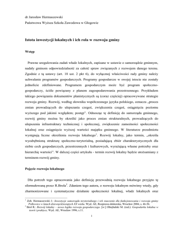 dr Jarosław Hermaszewski Państwowa Wyższa Szkoła Zawodowa w Głogowie Istota inwestycji lokalnych i ich rola w rozwoju gminy Wstęp Prawne uregulowania zadań władz lokalnych, zapisane w ustawie o samorządzie gminnym, nadały gminom odpowiedzialność za całość spraw związanych z rozwojem danego terenu. Zgodnie z tą ustawy (art. 18 ust. 2 pkt 6), do wyłącznej właściwości rady gminy należy uchwalanie programów gospodarczych. Programy gospodarcze w swojej istocie nie zostały jednolicie zdefiniowane. Programem gospodarczym może być program społecznogospodarczy, ściśle powiązany z planem zagospodarowania przestrzennego. Przykładem takiego powiązania dokumentów planistycznych są (coraz częściej) opracowywane strategie rozwoju gminy. Rozwój, według słownika współczesnego języka polskiego, oznacza „proces zmian prowadzących do ulepszania czegoś, zwiększenia czegoś, osiągnięcia poziomu wyższego pod jakimś względem; postęp”. Odnosząc tę definicję do samorządu gminnego, rozwój gminy można by określić jako proces zmian strukturalnych, prowadzących do ulepszenia infrastruktury technicznej i społecznej, zwiększenie zamożności społeczności lokalnej oraz osiągnięcie wyższej wartości majątku gminnego. W literaturze przedmiotu występują liczne określenia rozwoju lokalnego1. Rozwój lokalny, jako termin, „określa wyodrębnioną strukturę społeczno-terytorialną, posiadającą zbiór charakterystycznych dla siebie cech gospodarczych, przestrzennych i kulturowych, wyrażającą własne potrzeby oraz hierarchię wartości”. W dalszej części artykułu - termin rozwój lokalny będzie utożsamiany z terminem rozwój gminy. Pojęcie rozwoju lokalnego Dla potrzeb tego opracowania jako definicję przewodnią rozwoju lokalnego przyjęto tę sformułowaną przez R.Brola2. Zdaniem tego autora, o rozwoju lokalnym mówimy wtedy, gdy zharmonizowane i systematyczne działanie społeczności lokalnej, władz lokalnych oraz 1 Zob. Hermaszewski J.: Inwestycje samorządu terytorialnego i ich znaczenie dla funkcjonowania i rozwoju gminy Polkowice w latach dziewięćdziesiątych XX wieku. Wyd. AE, Rozprawa doktorska, Wrocław 2004, s. 46-56. 2 Brol R.: Rozwój lokalny – nowa logika rozwoju gospodarczego. [w:] Obrębalski M. (red.): Gospodarka lokalna w teorii i praktyce, Wyd. AE, Wrocław 1996, s.11. 1 pozostałych podmiotów funkcjonujących w gminie zmierza do kreowania nowych i poprawy istniejących walorów użytkowych gminy, tworzenia oraz zapewnienia ładu przestrzennego i ekologicznego. Ciekawe interpretacje definicji rozwoju przedstawili również A.Purgat i R.Reszel3 podkreślając to, że rozwój jest procesem dynamicznym kreującym różne zmiany. J.J.Parysek 4 połączył trzy ważne elementy rozwoju: - działanie, - zasoby, - potrzeby. Natomiast J.Warda i W.Kłosowski5 podkreślają, że w wyniku rozwoju lokalnego następuje indywidualny rozwój poszczególnych mieszkańców. Uwzględniając różne interpretacje i definicje podaje się najważniejsze cechy rozwoju lokalnego: - często podkreślanym elementem w definicji rozwoju jest słowo proces; oznaczać to może, że według autorów poszczególnych definicji - o rozwoju mówi się w kategoriach pewnych działań prowadzących do zmian, - podmiotowość definicji rozwoju lokalnego (gminnego) sprowadza się do jednostki terytorialnej najniższego szczebla administracji państwowej - czyli gminy jako wspólnoty mieszkańców danego terenu; w imieniu gminy występują władze gminy, - zmiany, które są siłą sprawczą rozwoju, powinny prowadzić do polepszenia istniejących walorów użytkowych gminy lub powinny tworzyć nowe jej wartości, - mówiąc o rozwoju lokalnym – zakłada się, że działania podejmowane na jego rzecz powinny być dokonywane za aprobatą i przy współudziale lokalnej społeczności. Według R.Brola6 efektem rozwoju lokalnego jest poprawa życia społeczności lokalnej. Poprawa ta jest rezultatem tworzenia na szczeblu gminnym „nowych wartości”. Uważa się, że rozwój lokalny powinien wynikać z konkretnej wizji kształtowania się w przyszłości obrazu gminy. Planowanie przyszłości wiąże się z określeniem celów, jakie powinny być osiągane. Celem rozwoju lokalnego jest m.in. zapewnienie ludziom możliwie wysokiego poziomu życia. Według M.Trojanek7 celami rozwoju lokalnego mogą być: - zapewnienie ludziom miejsc pracy i dochodów pozwalających na niezbędnym w odczuciu społecznym poziom życia, 3 4 5 6 7 Purgat A., Reszel R.: Zarządzanie gminą w teorii i praktyce. Poradnik, Wyd.: Zachodnie Centrum Organizacji, Warszawa-Poznań-Zielona Góra 1997, s. 101. Parysek J.J.: Rola samorządu terytorialnego w rozwoju lokalnym. [w:] Parysek J.J. Rozwój lokalny: zagospodarowanie przestrzenne i nisze atrakcyjności gospodarczej, Wyd. KPZK PAN, Warszawa 1995, s. 37. Warda J., Kłosowski W.: Wdrażanie lokalnych projektów rozwojowych. Jak radzić sobie z konfliktem, „Rozwój Regionalny” 2001, nr 2-3. Brol R.: Zarządzanie rozwojem lokalnym. Definicje, cele, zasady i procedury, [w:] Brol R.R. (red.): Zarządzanie rozwojem lokalnym. Studium przypadków, Wyd. AE, Wrocław 1998, s.10. Trojanek M.: Oddziaływanie władzy lokalnej na efektywność przedsięwzięć inwestycyjnych. Wyd. AE, Zeszyty Naukowe nr 137, seria II, Prace Habilitacyjne, Poznań 1994., s.16. 2 - zapewnienie warunków bytu materialnego, a w tym: wyżywienie, mieszkanie, przebywanie w środowisku nie szkodzącym zdrowiu, - zapewnienie warunków rozwoju duchowego, a w tym: możliwości wypoczynku, kształcenia, dostępu do informacji, obcowania z kulturą i rozrywką, podróży i kontaktów z szeroko rozumianym otoczeniem, - zapewnienie poczucia bezpieczeństwa i perspektyw na przyszłość, a w tym: poczucia stabilizacji (zabezpieczenia dorobku życia) i szans rozwoju dla następnych pokoleń, - zachowanie naturalnego środowiska dla przyszłych pokoleń, w tym: prowadze