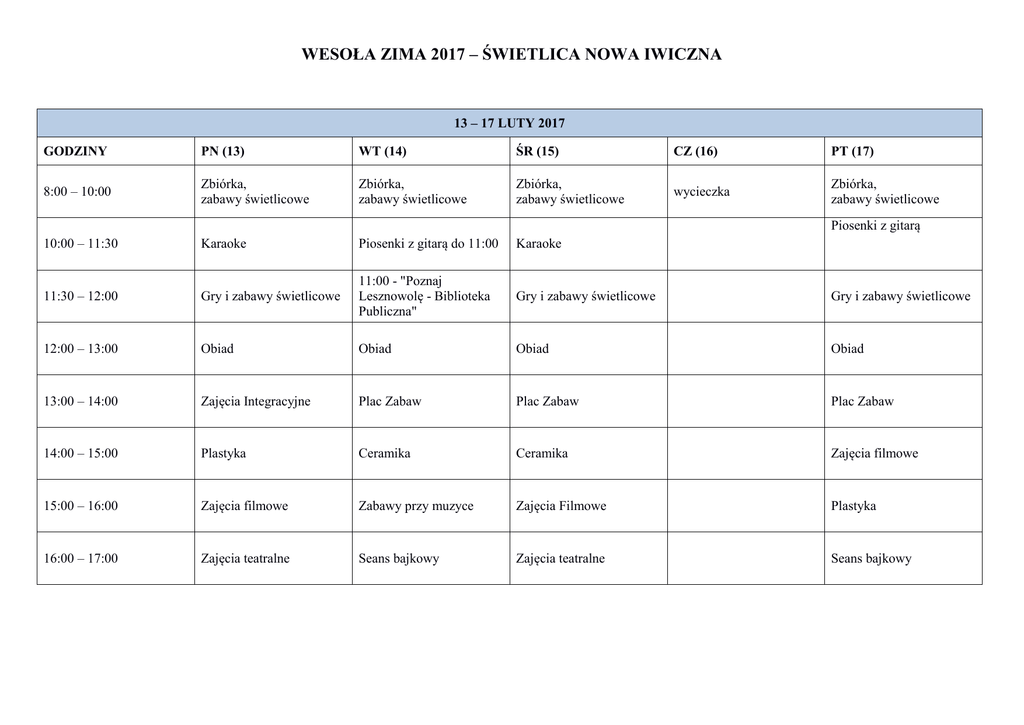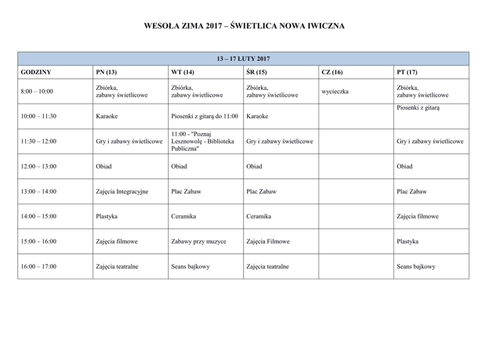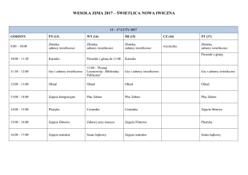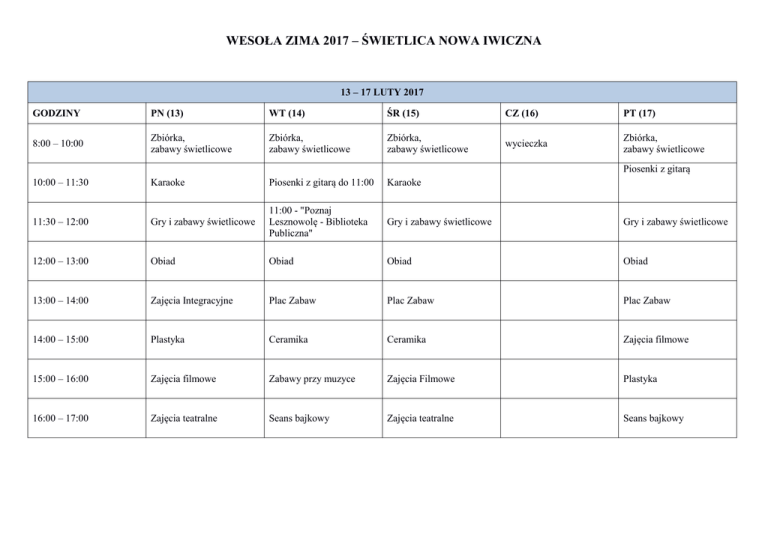 WESOŁA ZIMA 2017 – ŚWIETLICA NOWA IWICZNA 13 – 17 LUTY 2017 GODZINY PN (13) WT (14) ŚR (15) CZ (16) PT (17) 8:00 – 10:00 Zbiórka, zabawy świetlicowe Zbiórka, zabawy świetlicowe Zbiórka, zabawy świetlicowe wycieczka Zbiórka, zabawy świetlicowe 10:00 – 11:30 Karaoke Piosenki z gitarą do 11:00 Karaoke 11:30 – 12:00 Gry i zabawy świetlicowe 11:00 - "Poznaj Lesznowolę - Biblioteka Publiczna" Gry i zabawy świetlicowe Gry i zabawy świetlicowe 12:00 – 13:00 Obiad Obiad Obiad Obiad 13:00 – 14:00 Zajęcia Integracyjne Plac Zabaw Plac Zabaw Plac Zabaw 14:00 – 15:00 Plastyka Ceramika Ceramika Zajęcia filmowe 15:00 – 16:00 Zajęcia filmowe Zabawy przy muzyce Zajęcia Filmowe Plastyka 16:00 – 17:00 Zajęcia teatralne Seans bajkowy Zajęcia teatralne Seans bajkowy Piosenki z gitarą 20 – 24 LUTY 2017 GODZINY PN (20) WT (21) ŚR (22) CZ (23) PT (24) 8:00 – 10:00 Zbiórka, zabawy świetlicowe Zbiórka, zabawy świetlicowe wycieczka Zbiórka, zabawy świetlicowe Bal 10:00 – 11:30 Karaoke Piosenki z gitarą Karaoke 11:30 – 12:00 Gry i zabawy świetlicowe Gry i zabawy świetlicowe Gry i zabawy świetlicowe 12:00 – 13:00 Obiad Obiad Obiad 13:00 – 14:00 Plac zabaw Plastyka Plastyka 14:00 – 15:00 Ceramika Zajęcia teatralne Zajęcia filmowe 15:00 – 16:00 Zajęcia filmowe Zabawy ruchowe Ceramika 16:00 – 17:00 Plastyka Seans bajkowy Zabawy ruchowe
