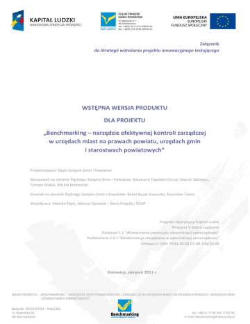 Załącznik do Strategii wdrażania projektu innowacyjnego testującego WSTĘPNA WERSJA PRODUKTU DLA PROJEKTU „Benchmarking – narzędzie efektywnej kontroli zarządczej w urzędach miast na prawach powiatu, urzędach gmin i starostwach powiatowych” Projektodawca: Śląski Związek Gmin i Powiatów Opracowali na zlecenie Śląskiego Związku Gmin i Powiatów: Katarzyna Topolska-Ciuruś, Marcin Sakowicz, Tomasz Skalski, Michał Krzemiński Oceniali na zlecenie Śląskiego Związku Gmin i Powiatów: Beata Bujak-Szwaczka, Stanisław Tamm Współpraca: Monika Papis, Mariusz Śpiewok – Biuro Projektu ŚZGiP Program Operacyjny Kapitał Ludzki Priorytet V Dobre rządzenie Działanie 5.2 "Wzmocnienie potencjału administracji samorządowej" Poddziałanie 5.2.1 "Modernizacja zarządzania w administracji samorządowej" Umowa nr UDA- POKL.05.02.01-00-146/10-00 Katowice, sierpień 2011 r. Strona 1 Wprowadzenie Zgodnie z założeniami wniosku o dofinansowanie na wstępną wersję produktu składają się: − koncepcja prowadzenia systematycznego benchmarkingu z uwzględnieniem specyfiki jednostek oraz schemat kompetencyjny kadry urzędniczej odpowiedzialnej za wdrażanie benchmarkingu (zał. nr 1), − zestaw wskaźników monitorowania efektywności usług publicznych dla procesów realizowanych przez urzędy uznanych za kluczowe (zał. nr 2), − założenia do narzędzia informatycznego wspierającego realizację benchmarkingu (zał. nr 3) Ponadto zgodnie z harmonogramem prac i założeniami opracowanymi przez Biuro Projektu (zał. nr 4) uruchomiono portal internetowy projektu pod adresem www.benchmarking.silesia.org.pl. Ilekroć w załączonych opracowaniach jest mowa o procesach należy przez to rozumieć wyodrębniony zakres działania jednostki, dla którego możliwe jest dokonywanie systemowych pomiarów w oparciu o pozyskane dane wejściowe oraz wprowadzanie zmian, na skutek których oczekiwane jest uzyskanie lepszych wyników w kolejnym pomiarze. Przyjęto, że procesy kluczowe realizowane przez urząd1, to procesy, dla których coroczne wyniki monitorowania powinny bezwzględnie podlegać ocenie na najwyższym szczeblu zarządzania, tj. na poziomie kierownika jednostki. W efekcie pozytywnej weryfikacji wyników kluczowych procesów kierownik urzędu powinien uzyskać racjonalne zapewnienie, że urząd realizuje usługi publiczne objęte procesem w sposób efektywny, zgodny z prawem, terminowy i oszczędny. Dobór procesów, które zostaną poddane benchmarkingowi nastąpił z udziałem reprezentantów użytkowników, w tym przede wszystkim reprezentantów miast na prawach powiatów2. W projekcie założono bowiem, że na etapie opracowywania wstępnej wersji produktu oraz testowania dobór grupy reprezentantów użytkowników musi uwzględniać ich doświadczenie w zakresie wdrażania nowoczesnych metod zarządzania. Zgodnie z raportem końcowym „Zdiagnozowanie potencjału administracji samorządowej, ocena potrzeb szkoleniowych kadr urzędów administracji samorządowej oraz przygotowanie profili kompetencyjnych kadr urzędów administracji samorządowej”3 wg stanu na 2009 rok w 80% urzędów miast na prawach powiatu wdrożono system zarządzania, w tym w ponad 70% system oparty o normę EN ISO 9001:2000, której podstawą jest zarządzanie procesowe. Ze względu na pewien zakres swobody kształtowania katalogu usług publicznych świadczonych przez urząd w ramach procesu, związany z możliwością przekazywania zadań do realizacji innym miejskim jednostkom organizacyjnym lub gminnym osobom prawnym, w ramach projektu analizowane będą procesy, których powierzenie innej jednostce jest niemożliwe lub 1 Określenie „urząd” lub „jednostka” odnosi się do urzędów gmin, urzędów miast na prawach powiatów oraz starostw powiatowych. Urzędy miast na prawach powiatu: Bielsko-Biała, Bytom, Częstochowa, Dąbrowa Górnicza, Gliwice, Katowice, Krosno, Piotrków Trybunalski, Rybnik, Sosnowiec, Tarnów, Krosno, Tychy, Żory, urzędy gmin: Lędziny, Jaworze, Radlin, starostwa powiatowe: Gliwice, Zawiercie 3 Urbaniak B., Bohdziewicz P.; ASM Centrum Badań i Analiz Rynku na zlecenie MSWiA, 2009 2 Strona 2 praktyka wskazuje, że większość urzędów realizuje dany proces (mimo, że istnieje formalna możliwość powierzenia jego realizacji innej jednostce). Co do zasady w ramach jednego procesu kluczowego realizowanych jest szereg usług publicznych. Ilekroć w załączonych opracowaniach jest mowa o usługach publicznych należy przez to rozumieć usługi świadczone bezpośrednio przez komórki organizacyjne urzędu miasta na prawach powiatu, urzędu gminy lub starostwa powiatowego. Projekt nie odnosi się do wszystkich usług publicznych świadczonych przez jednostkę samorządu terytorialnego, a wyłącznie do wybranych usług realizowanych przez wyodrębnioną jednostkę sektora finansów publicznych, jaką jest urząd. Wybór procesów kluczowych odbywał się metodą planu repozytywnego. Do I cyklu testowania przyjęto następujący zestaw zagadnień: 1. Postępowanie administracyjne (w tym wybrane usługi zgodnie z zał. nr 2). 2. Rejestracja działalności gospodarczej. 3. Naliczanie zobowiązań i egzekwowanie dochodów miasta należnych. z tytułu podatków i opłat lokalnych na przykładzie podatku od nieruchomości. 4. Utrzymanie infrastruktury miejskiej na przykładzie oświetlenia (z rozważeniem rozszerzenia w dalszej perspektywie do zarządzania energią). 5. Organizacja sieci szkół publicznych w zakresie dotyczącym kształcenia obowiązkowego. 6. Realizacja usług społecznych w drodze konkursów na działalność pożytku publicznego (z opcją rozbudowy benchmarkingu dla tematyki organizacji opieki nad dziećmi do lat 3). 7. Zarządzanie zasobami ludzkimi w urzędzie. 8. Organizacja pracy urzędu. W kolejnych cyklach testowania dobór procesów kluczowych zostanie zweryfikowany w oparciu o zasadę adekwatności. Fazy testowe muszą potwierdzić, że dl