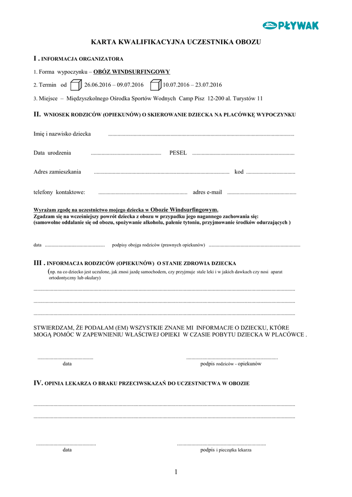 KARTA KWALIFIKACYJNA UCZESTNIKA OBOZU I . INFORMACJA ORGANIZATORA 1. Forma wypoczynku – OBÓZ WINDSURFINGOWY 2. Termin od 26.06.2016 – 09.07.2016 10.07.2016 – 23.07.2016 3. Miejsce – Międzyszkolnego Ośrodka Sportów Wodnych Camp Pisz 12-200 al. Turystów 11 II. WNIOSEK RODZICÓW (OPIEKUNÓW) O SKIEROWANIE DZIECKA NA PLACÓWKĘ WYPOCZYNKU Imię i nazwisko dziecka Data urodzenia ............................................................................................................................................ ..................................................... Adres zamieszkania PESEL ............................................................................. ...................................................................................................... kod ..................................... telefony kontaktowe: ................................................................... adres e-mail .................................................... Wyrażam zgodę na uczestnictwo mojego dziecka w Obozie Windsurfingowym. Zgadzam się na wcześniejszy powrót dziecka z obozu w przypadku jego nagannego zachowania się: (samowolne oddalanie się od obozu, spożywanie alkoholu, palenie tytoniu, przyjmowanie środków odurzających ) data ............................................. podpisy obojga rodziców (prawnych opiekunów) ..................................................................... III . INFORMACJA RODZICÓW (OPIEKUNÓW) O STANIE ZDROWIA DZIECKA (np. na co dziecko jest uczulone, jak znosi jazdę samochodem, czy przyjmuje stale leki i w jakich dawkach czy nosi aparat ortodontyczny lub okulary) ..................................................................................................................................................................................................... ..................................................................................................................................................................................................... ..................................................................................................................................................................................................... STWIERDZAM, ŻE PODAŁAM (EM) WSZYSTKIE ZNANE MI INFORMACJE O DZIECKU, KTÓRE MOGĄ POMÓC W ZAPEWNIENIU WŁAŚCIWEJ OPIEKI W CZASIE POBYTU DZIECKA W PLACÓWCE . .......................................... data ..................................................................... podpis rodziców - opiekunów IV. OPINIA LEKARZA O BRAKU PRZECIWSKAZAŃ DO UCZESTNICTWA W OBOZIE ..................................................................................................................................................................................................... ..................................................................................................................................................................................................... ............................................. data ................................................................... podpis i pieczątka lekarza 1 V. INFORMACJA PIELĘGNIARKI O SZCZEPIENIACH (możliwość przedstawienia książeczki zdrowia z aktualnym wpisem szczepień) Szczepienia ochronne (podać rok) : tężec ................................., błonica ................................., dur ................................., inne ............................................................................................................................................................................................. . ................................... ..................................................... data podpis pielęgniarki VI. INFORMACJA WYCHOWAWCY KLASY O DZIECKU ( W przypadku braku możliwości uzyskania opinii wychowawcy klasy , rubrykę wypełnia rodzic lub prawny opiekun ) ..................................................................................................................................................................................................... ..................................................................................................................................................................................................... ..................................................................................................................................................................................................... ............................................. ...................................................................................................... data podpis wychowawcy lub rodzica-opiekuna VII. INFORMACJA O STANIE ZDROWIA DZIECKA W CZASIE POBYTU W PLACÓWCÓWCE WYPOCZYNKU (dane o zachorowaniach, urazach, leczeniu) ..................................................................................................................................................................................................... ..................................................................................................................................................................................................... ..................................................................................................................................................................................................... ..................................................................................................................................................................................................... Organizator informuje rodziców o leczeniu ambulatoryjnym lub hospitalizacji .................................................... (miejscowość ,data) ................................................................................. (podpis lekarza lub pielęgniarki placówki wypoczynku) ..........................................................................