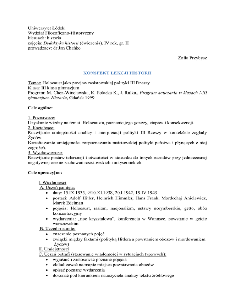 Uniwersytet Łódzki Wydział Filozoficzno-Historyczny kierunek: historia zajęcia: Dydaktyka historii (ćwiczenia), IV rok, gr. II prowadzący: dr Jan Chańko Zofia Przybysz KONSPEKT LEKCJI HISTORII Temat: Holocaust jako przejaw rasistowskiej polityki III Rzeszy Klasa: III klasa gimnazjum Program: M. Chen-Wincławska, K. Polacka K., J. Rulka., Program nauczania w klasach I-III gimnazjum. Historia, Gdańsk 1999. Cele ogólne: 1. Poznawcze: Uzyskanie wiedzy na temat Holocaustu, poznanie jego genezy, etapów i konsekwencji. 2. Kształcące: Rozwijanie umiejętności analizy i interpretacji polityki III Rzeszy w kontekście zagłady Żydów. Kształtowanie umiejętności rozpoznawania rasistowskiej polityki państwa i płynących z niej zagrożeń. 3. Wychowawcze: Rozwijanie postaw tolerancji i otwartości w stosunku do innych narodów przy jednoczesnej negatywnej ocenie zachowań rasistowskich i antysemickich. Cele operacyjne: I. Wiadomości A. Uczeń pamięta: daty: 15.IX.1935, 9/10.XI.1938, 20.I.1942, 19.IV.1943 postaci: Adolf Hitler, Heinrich Himmler, Hans Frank, Mordechaj Anielewicz, Marek Edelman pojęcia: Holocaust, rasizm, nacjonalizm, ustawy norymberskie, getto, obóz koncentracyjny wydarzenia: „noc kryształowa”, konferencja w Wannsee, powstanie w getcie warszawskim B. Uczeń rozumie: znaczenie poznanych pojęć związki między faktami (polityką Hitlera a powstaniem obozów i mordowaniem Żydów) II. Umiejętności C. Uczeń potrafi (stosowanie wiadomości w sytuacjach typowych): wyjaśnić i zastosować poznane pojęcia zlokalizować na mapie miejsca powstawania obozów opisać poznane wydarzenia dokonać pod kierunkiem nauczyciela analizy tekstu źródłowego D. Uczeń potrafi (stosowanie wiadomości w sytuacjach problemowych): dokonać oceny wpływu ideologii na życie społeczne narodu negatywnie ocenić rasistowskie i antysemickie zachowania (także współcześnie) docenić walkę w obronie prawa do życia, wolności i ludzkiej godności Metody dydaktyczne: rozmowa nauczająca, praca z mapą, „burza mózgów”, praca z tekstem źródłowym, dyskusja Środki dydaktyczne: podręcznik: J. Chachaj, Historia czasy najnowsze, Warszawa 2005; mapa ścienna: Polska w latach II wojny światowej; atlas: Atlas historyczny. Gimnazjum, Warszawa 2005, s. 109. teksty źródłowe: załączniki 1 i 2. TOK LEKCJI Ogniwa lekcji (czas w minutach) I. Czynności organizacyjnoporządkowe (2’) II. Rekapitulacja wtórna (6’) Treści merytoryczne III. Ogniwo wiążące (3’) Położenie mniejszości żydowskiej w przededniu II wojny światowej. Pokazanie na mapie największych skupisk ludności żydowskiej w II RP. Przypomnienie okoliczności agresji nazistowskich Niemiec na Polskę w 1939 r. Pokazanie na mapie głównych kierunków uderzeń wojsk niemieckich w okresie wojny obronnej. IV. Tok lekcji Pojęcia: nacjonalizm, właściwej (22’) rasizm, Holocaust. Prezentacja ideologii rasistowskiej na podstawie ustaw norymberskich. Próba interpretacji polityki III Rzeszy w kontekście dyskryminacji ludności żydowskiej. Przywołanie postaci: Adolfa Hitlera i Heinricha Himmlera, pojęć: getto i obóz koncentracyjny oraz wydarzeń: „noc kryształowa” i konferencja w Wannsee. Związek pomiędzy polityką Hitlera a wymordowaniem Żydów. Wpływ ideologii na życie społeczne narodu. Czynności nauczyciela i uczniów Nauczyciel sprawdza listę obecności. Poleca uczniom wyjąć zeszyty oraz podręczniki. Nauczyciel zadaje pytania, uczniowie odpowiadają i wskazują na mapie główne kierunki uderzeń wojsk niemieckich. Kształtowane umiejętności uczniów Wykorzystanie przez uczniów na lekcji uprzednio zdobytych wiadomości. Posługiwanie się mapą. Nauczyciel dokonuje wprowadzenia do nowej lekcji poprzez scharakteryzowanie sytuacji Żydów w Polsce przed wybuchem II wojny światowej. Podaje temat lekcji. Nauczyciel wprowadza nowe pojęcia metodą „burzy mózgów” (3’). Zapamiętywanie wiadomości, skupianie uwagi. Nauczyciel rozdaje teksty ustaw norymberskich, daje uczniom czas na ich przeczytanie i krótkie zastanowienie się nad nimi (3’). Za pomocą rozmowy nauczającej dochodzi do analizy tekstu źródłowego, który staje się punktem wyjścia do dyskusji na temat antysemickiej polityki Hitlera (10’). Analiza tekstu źródłowego. Dostrzeganie związków między faktami. Wyciąganie wniosków. Dokonywanie ocen, wartościowanie postaw. Obrona swoich poglądów, dobór trafnych argumentów. Definiowanie pojęć. Wskazanie na mapie Uczniowie pokazują na największych gett i obozów. mapie główne miejsca zagłady Żydów ( 2’). Powstanie w getcie warszawskim jako walka w obronie prawa do życia, wolności i ludzkiej godności. Postaci: Hans Frank, Mordechaj Anielewicz i Marek Edelman. V. Rekapitulacja pierwotna (8’) Przyczyny zasięgu Holocaustu. Negatywna ocena rasistowskich i antysemickich zachowań (także współcześnie). Charakterystyka postaw społeczeństwa polskiego wobec zagłady Żydów w czasie II wojny światowej. Próba odpowiedzi na pytanie o zakres polskiej pomocy. Podkreślenie wartości tolerancji i otwartości w stosunku do innych narodów. VI. Kontrola i ocena (2’) VII. Praca domowa (2’) Dla wszystkich: Podręcznik, ćwiczenie 1, str. 121: Jakimi metodami Niemcy prowadzili politykę wyniszczenia ludności żydowskiej na ziemiach polskich (w punktach w zeszycie)? Dla zainteresowanych: Krótka praca pisemna: Oceny sensu powstania w getcie warszawskim (2-3 strony zeszytowe, na kartkach). Posługiwanie się mapą. Nauczyciel rozdaje fragmenty wspomnień powstańców i prosi uczniów o ocenę powstania w getcie w ich kontekście (4’). Budowanie poprawnej stylistycznie i językowo ustnej wypowiedzi. Dokonywanie ocen, wartościowanie postaw. Nauczyciel prosi Posługiwanie się uczniów o pokazanie na mapą. mapie zasięgu Holocaustu. Nauczyciel otwiera Dokonywanie krótką dyskusję na ocen, temat rozmiarów wartościowanie pomocy udzielonej postaw