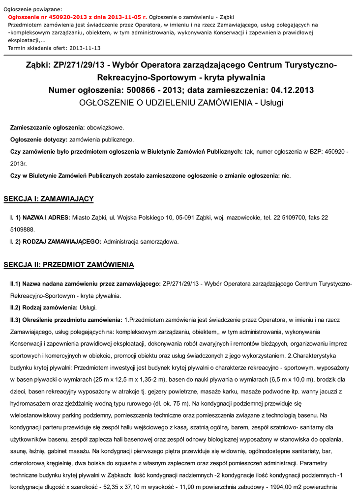 Ogłoszenie powiązane: Ogłoszenie nr 450920-2013 z dnia 2013-11-05 r. Ogłoszenie o zamówieniu - Ząbki Przedmiotem zamówienia jest świadczenie przez Operatora, w imieniu i na rzecz Zamawiającego, usług polegających na -kompleksowym zarządzaniu, obiektem, w tym administrowania, wykonywania Konserwacji i zapewnienia prawidłowej eksploatacji,... Termin składania ofert: 2013-11-13 Ząbki: ZP/271/29/13 - Wybór Operatora zarządzającego Centrum TurystycznoRekreacyjno-Sportowym - kryta pływalnia Numer ogłoszenia: 500866 - 2013; data zamieszczenia: 04.12.2013 OGŁOSZENIE O UDZIELENIU ZAMÓWIENIA - Usługi Zamieszczanie ogłoszenia: obowiązkowe. Ogłoszenie dotyczy: zamówienia publicznego. Czy zamówienie było przedmiotem ogłoszenia w Biuletynie Zamówień Publicznych: tak, numer ogłoszenia w BZP: 450920 2013r. Czy w Biuletynie Zamówień Publicznych zostało zamieszczone ogłoszenie o zmianie ogłoszenia: nie. SEKCJA I: ZAMAWIAJĄCY I. 1) NAZWA I ADRES: Miasto Ząbki, ul. Wojska Polskiego 10, 05-091 Ząbki, woj. mazowieckie, tel. 22 5109700, faks 22 5109888. I. 2) RODZAJ ZAMAWIAJĄCEGO: Administracja samorządowa. SEKCJA II: PRZEDMIOT ZAMÓWIENIA II.1) Nazwa nadana zamówieniu przez zamawiającego: ZP/271/29/13 - Wybór Operatora zarządzającego Centrum TurystycznoRekreacyjno-Sportowym - kryta pływalnia. II.2) Rodzaj zamówienia: Usługi. II.3) Określenie przedmiotu zamówienia: 1.Przedmiotem zamówienia jest świadczenie przez Operatora, w imieniu i na rzecz Zamawiającego, usług polegających na: kompleksowym zarządzaniu, obiektem,, w tym administrowania, wykonywania Konserwacji i zapewnienia prawidłowej eksploatacji, dokonywania robót awaryjnych i remontów bieŜących, organizowaniu imprez sportowych i komercyjnych w obiekcie, promocji obiektu oraz usług świadczonych z jego wykorzystaniem. 2.Charakterystyka budynku krytej pływalni: Przedmiotem inwestycji jest budynek krytej pływalni o charakterze rekreacyjno - sportowym, wyposaŜony w basen pływacki o wymiarach (25 m x 12,5 m x 1,35-2 m), basen do nauki pływania o wymiarach (6,5 m x 10,0 m), brodzik dla dzieci, basen rekreacyjny wyposaŜony w atrakcje tj. gejzery powietrzne, masaŜe karku, masaŜe podwodne itp. wanny jacuzzi z hydromasaŜem oraz zjeŜdŜalnię wodną typu rurowego (dł. ok. 75 m). Na kondygnacji podziemnej przewiduje się wielostanowiskowy parking podziemny, pomieszczenia techniczne oraz pomieszczenia związane z technologią basenu. Na kondygnacji parteru przewiduje się zespół hallu wejściowego z kasą, szatnią ogólną, barem, zespół szatniowo- sanitarny dla uŜytkowników basenu, zespół zaplecza hali basenowej oraz zespół odnowy biologicznej wyposaŜony w stanowiska do opalania, saunę, łaźnię, gabinet masaŜu. Na kondygnacji pierwszego piętra przewiduje się widownię, ogólnodostępne sanitariaty, bar, czterotorową kręgielnię, dwa boiska do squasha z własnym zapleczem oraz zespół pomieszczeń administracji. Parametry techniczne budynku krytej pływalni w Ząbkach: ilość kondygnacji nadziemnych -2 kondygnacje ilość kondygnacji podziemnych -1 kondygnacja długość x szerokość - 52,35 x 37,10 m wysokość - 11,90 m powierzchnia zabudowy - 1994,00 m2 powierzchnia uŜytkowa - 5 355,88 m2 kubatura części podziemnej - 9 650 m3 kubatura części nadziemnej - 19 000 m3 W ramach przedmiotowej inwestycji zostanie wykonane zagospodarowanie terenu, a takŜe droga w ul. Słowackiego wraz z włączeniem w drogę wojewódzką- ul. Ks. Skorupki. Zakończenie całości robót budowlanych i oddanie obiektu do uŜytkowania zaplanowane jest na grudzień 2013 r. 3.Obowiązki Operatora zarządzającego Centrum Turystyczno - Rekreacyjno - Sportowym - kryta pływalnia: 3.1.W ramach przedmiotu zamówienia Operator zobowiązuje się za wynagrodzeniem do: 1)kompleksowego zarządzania Obiektem, w tym Administrowania, wykonywania Konserwacji i zapewnienia prawidłowej Eksploatacji, dokonywania Robót awaryjnych i Remontów bieŜących, 2)organizowania imprez sportowych i komercyjnych w Obiekcie, 3)promocji Obiektu oraz usług świadczonych z jego wykorzystaniem. 3.2.Operator ponosi pełną odpowiedzialność za zarządzanie Obiektem. Operator zobowiązany jest wykonywać przedmiot zamówienia zgodnie ze standardami zawodowymi i ze szczególną starannością właściwą dla ich zawodowego charakteru oraz kierując się zasadą ochrony interesu Zamawiającego. 3.3.Operatora obowiązuje tajemnica zawodowa obejmująca wszelkie informacje związane z zarządzaniem Obiektu. 3.4.Operator zobowiązuje się do zapewnienia prawidłowej eksploatacji Obiektu oraz do czuwania nad prawidłową realizacją umów zawartych przez niego z osobami trzecimi, a takŜe do chronienia interesów Zamawiającego w toku realizacji przedmiotu zamówienia. 3.5.Operator: 1)ponosi wszelkie koszty związane z realizacją przedmiotu zamówienia, w tym wszelkie koszty związane z wykonywaniem czynności wskazanych w pkt. 3.1, w szczególności wszelkie koszty Administrowania i zapewnienia prawidłowej Eksploatacji, Remontów bieŜących, Konserwacji, Robót awaryjnych, przeglądów technicznych, opłat za media (gaz, woda, ścieki, energia elektryczna, wywóz nieczystości i inne), płac, ubezpieczeń, podatków i innych opłat publiczno - prawnych oraz wszelkie inne koszty wynikające z charakteru zleconego zadania lub treści wzoru Umowy, 2)pobiera wszelkie przychody związane z funkcjonowaniem Obiektu, które stanowią jego przychód. 3.6.Operator zobowiązany jest uzyskać pisemną zgodę Zamawiającego na dokonywanie nakładów oraz zmian w zarządzanym Obiekcie wymagających zgody w trybie ustawy - Prawo budowlane, które wykraczają poza zakres Remontów bieŜących, Konserwacji i Robót awaryjnych. 3.7.Do obowiązków Operatora naleŜy w szczególności: 1)zapewnienie pełnej dostępności całego Obiektu oraz sprawności wszystkich instalacji i urządzeń Obiektu, 2)eksploatacja instalacji i urządzeń Obiektu