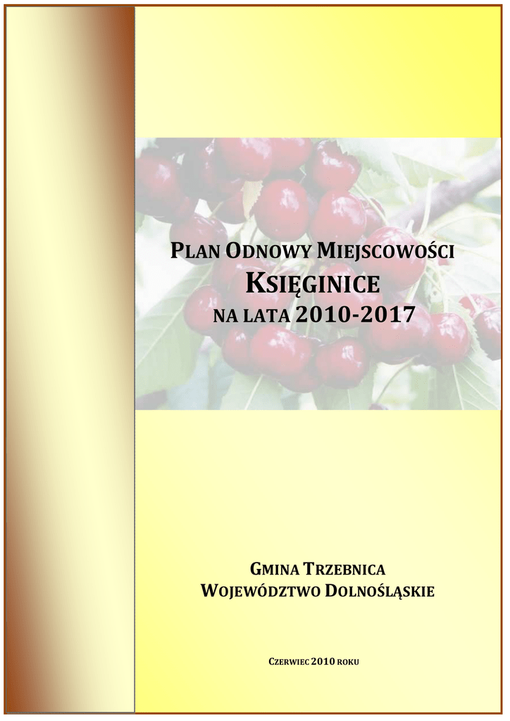 PLAN ODNOWY MIEJSCOWOŚCI KSIĘGINICE NA LATA 2010-2017 GMINA TRZEBNICA WOJEWÓDZTWO DOLNOŚLĄSKIE CZERWIEC 2010 ROKU 1 SPIS TREŚCI SPIS TREŚCI....................................................................................................................................................... 2 SPIS TABEL ....................................................................................................................................................... 2 SPIS RYSUNKÓW .............................................................................................................................................. 2 WSTĘP .............................................................................................................................................................. 4 STRUKTURA DOKUMENTU ............................................................................................................................... 5 1. CHARAKTERYSTYKA MIEJSCOWOŚCI ....................................................................................................... 6 1.1. 1.2. 1.3. 1.4. 1.5. 1.6. 2. POŁOŻENIE MIEJSCOWOŚCI ......................................................................................................................... 6 PRZYNALEŻNOŚĆ ADMINISTRACYJNA ............................................................................................................. 7 POWIERZCHNIA ........................................................................................................................................ 7 LICZBA LUDNOŚCI ...................................................................................................................................... 7 HISTORIA MIEJSCOWOŚCI ............................................................................................................................ 8 STRUKTURA PRZESTRZENNA MIEJSCOWOŚCI.................................................................................................... 9 INWENTARYZACJA ZASOBÓW SŁUŻĄCYCH ODNOWIE MIEJSCOWOŚCI ................................................. 10 2.1. 2.2. 2.3. 2.4. 2.5. 2.6. 2.7. ZASOBY PRZYRODNICZE ............................................................................................................................ 10 DZIEDZICTWO KULTUROWE ....................................................................................................................... 11 OBIEKTY I TERENY .................................................................................................................................... 11 INFRASTRUKTURA SPOŁECZNA .................................................................................................................... 12 INFRASTRUKTURA TECHNICZNA .................................................................................................................. 12 GOSPODARKA I ROLNICTWO ...................................................................................................................... 14 KAPITAŁ LUDZKI ...................................................................................................................................... 17 3. OCENA MOCNYCH I SŁABYCH STRON MIEJSCOWOŚCI, W KTÓREJ BĘDZIE REALIZOWANA OPERACJA ... 19 4. PLANOWANE KIERUNKI ROZWOJU........................................................................................................ 22 4.1. 4.2. 4.3. WIZJA MIEJSCOWOŚCI .............................................................................................................................. 24 CEL GŁÓWNY .......................................................................................................................................... 25 CELE SZCZEGÓŁOWE ................................................................................................................................ 25 5. PLANOWANE INWESTYCJE .................................................................................................................... 26 6. SYSTEM WDRAŻANIA, MONITOROWANIA, OCENY ORAZ KOMUNIKACJI SPOŁECZNEJ .......................... 27 SPIS TABEL Tabela 1 Zestawienie powierzchni jednostek administracyjnych ............................................... 7 Tabela 2 Liczba ludności Polski, województwa, powiatu, gminy i miejscowości Księginice ................................................................................................................................................................................ 7 Tabela 3 Wykaz stacji transformatorowych na terenie miejscowości Księginice .............. 12 Tabela 4 Ujęcie wód podziemnych w Księginicach ......................................................................... 13 Tabela 5 Podmioty gospodarcze zarejestrowane na terenie miejscowości Księginice .... 14 Tabela 6 Ocena warunków życia przez mieszkańców Księginic................................................ 19 Tabela 7 Analiza SWOT .............................................................................................................................. 20 Tabela 8 Ocena inwestycji pod kątem potrzeby ich realizacji .................................................... 22 Tabela 9 Planowane inwestycje .............................................................................................................. 26 SPIS RYSUNKÓW Rysunek 1 Mapa powiatu trzebnickiego ................................................................................................ 6 2 Rysunek 2 Lokalizacja Księginic względem Trzebnicy ..................................................................... 6 Rysunek 3 Liczba ludności miejscowości Księginice w latach 2005-2010 ............................... 8 Rysunek 4 Układ przestrzenny miejscowości Księginice ................................................................ 9 Rysunek 5 Dawna zabudowa wiejska w Księginicach ................................................................... 11 Rysun