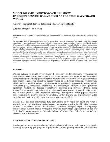 MODELOWANIE HYBRYDOWYCH UKŁADÓW ENERGETYCZNYCH BAZUJĄCYCH NA PROCESIE GAZYFIKACJI WĘGLA Autorzy: Krzysztof Badyda, Jakub Kupecki, Jarosław Milewski („Rynek Energii” – nr 3/2010) Słowa kluczowe: gazyfikacja, ogniwa paliwowe, modelowanie, optymalizacja, hybrydowe układy energetyczne, SOFC Streszczenie. Referat przedstawia, stworzony w środowisku HYSYS, nowatorski kod numeryczny pozwalający modelować i optymalizować hybrydowe układy energetyczne wykorzystujące proces gazyfikacji węgla. Wykorzystanie możliwości programu pozwoliło stworzyć szczegółowy model układu, w którym generowany gaz (ang. syngas) zasila wysokotemperaturowe ogniwo paliwowe typu SOFC. Model pozwala analizować pracę całego układu wspomnianego typu oraz także określić optymalne parametry poszczególnych podzespołów, tj. reaktora gazyfikującego, ogniwa paliwowego oraz turbiny gazowej. Autorzy wskazali wady i zalety proponowanego układu energetycznego oraz przedstawili uwzględnione w analizie zależności fizyko-chemiczne wraz z przyjętymi założeniami i uproszczeniami. Omówiona jednostka reprezentuje czyste źródło wytwórcze i stanowi interesujące perspektywiczne rozwiązanie energetyczne. W referacie zawarto wyniki analizy kombinowanego układu energetycznego bazującego na procesie gazyfikacji węgla, prowadzonej w Instytucie Techniki Cieplnej Politechniki Warszawskiej we współpracy z Colorado School of Mines Fuel Cell Center, USA. 1. WSTĘP Obecna sytuacja w świetle rygorystycznych przepisów środowiskowych, wymuszających drastyczne redukcje emisji spalin, stawia energetyce poważne wyzwania. Układy generujące energię elektryczną muszą spełniać kryteria ekonomiczne, wykazywać wysoką niezawodność oraz znacznie redukować szkodliwe oddziaływanie na środowisko naturalne. Proponowany układ, którego analiza została przedstawiona w publikacji reprezentuje czyste źródło wytwórcze [15], stanowiące alternatywę dla klasycznych obiegów siłowni parowych opalanych węglem. W dłuższej perspektywie czasowej proponowana jednostka może stanowić rozwiązanie pozwalające także zdywersyfikować produkcję energii elektrycznej. Jest to także jedna z wielu propozycji znacznego zmniejszenia emisji poprzez możliwe zastosowanie nowoczesnych systemów CCS (ang. Carbon Capture and Seąuestration); układ może być wyposażony w efektywne separatory membranowe [2,4]. Badania nad układami omawianego typu prowadzone są w wielu ośrodkach krajowych i zagranicznych, zaś możliwość wykorzystania różnorodnych paliw [6,12], także biomasy pozwala dostosować układ do lokalnych zasobów energetycznych. Konfiguracja analizowanego systemu spełnia wymagania programu badawczego Departamentu Energii US (U.S. DoE), prowadzonego w Colorado School of Mines Fuel Celi Center, w którego realizacji udział brali autorzy. 2. MODEL ANALIZOWANEGO UKŁADU Analiza hybrydowego układu miała za zadanie odpowiedzieć na pytanie, czy wykorzystanie wysokiej temperatury pracy ogniwa w połączeniu z turbiną gazową pozwoli uzyskać wysoką sprawność oraz które z parametrów pracy będą miały szczególny wpływ na zmiany sprawności. Zaproponowana konfiguracja układu (rys. 1), w której generowany syngas zasila ogniwo paliwowe w takiej ilości, aby zapewnić współczynniki FU (ang. Fuel Utilization) równy 0.8, pozwoliło dodatkowo zastosować komorę spalania w celu podwyższenia temperatury dolotowej do turbiny gazowej. Wykorzystano fakt, iż mimo niskiego stężenia palnych produktów w gazie opuszczającym ogniwo paliwowe, mieszanina cały czas posiadała zdolność zapłonu, co było szczególnie istotne z punktu widzenia możliwości podwyższenia sprawności całego układu. Układy podobnego typu były analizowane na przestrzeni ostatniej dekady [2,3,7]Proponowane były także alternatywne konfiguracje wykorzystujące wyłącznie turbinę parową lub także połączony układ gazowo-parowy. Jednym z przykładów kombinowanych układów jest opracowana przez konsorcjum Siemens-Westinghouse jednostka skali 4,5 MW wykorzystująca turbinę gazową (rys. 2). Jako najważniejsze zalety, wielokrotnie cytowane w literaturze [2,3,17], wynikające z wykorzystania turbiny gazowej należy wymienić: - relatywnie prosty układ posiadający małą liczbę komponentów, - system pracuje z niskimi stosunkami ciśnienia za/przed dla sprężarki i turbiny, dzięki czemu można zastosować proste maszyny, - stosunkowo niskie ciśnienie pracy ogniwa paliwowego, dzięki czemu udaje się unikać problemów związanych ze znacznym gradientem ciśnienia pomiędzy anodą i katodą oraz brak konieczności stosowania elementów wysokociśnieniowych, - niska temperatura dolotowa do turbiny, najczęściej około 1065 °C dla ogniwa SOFC; w tym wypadku chłodzenie łopatek turbiny nie musi być stosowane, - układ pozwala wykorzystać maksymalnie energię paliwa, wykorzystując wysoką sprawność ogniwa paliwowego, - układ może być wykorzystany w jednostkach małej i (perspektywicznie) dużej mocy, - układ bazuje na dostępnych na rynku turbozespołach, które mogą być bezproblemowo wykorzystane. Do wad proponowanego systemu należy zaliczyć: - fakt, iż sprężarka oraz osprzęt turbiny musi zostać precyzyjnie dobrany do parametrów pracy ogniwa paliwowego, - znaczne zmiany parametrów podczas pracy z niepełnym obciążeniem, - konieczność zastosowania dużego wymiennika typu gaz-gaz w rekuperacji wysokotemperaturowego ciepła, - Sprawność oraz moc wyjściowa układu jest silnie zależna od sprawności ogniwa, sprężarki oraz turbiny; istotne są spadki ciśnienia oraz różnice temperatury. 2.1. Zastosowany kod numeryczny Wykorzystany w analizie kod numeryczny HYSYS stworzony i rozwijany przez Aspen Tech, stanowi wszechstronne narzędzie pozwalające modelować i optymalizować układy, w których zachodzące procesy są związane z reakcjami chemicznymi oraz przemianami termodynamic