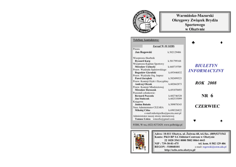 Warmińsko-Mazurski Okręgowy Związek Brydża Sportowego w Olsztynie Telefony kontaktowe: Zarząd W-M OZBS ♣ ♦ Prezes Jan Rogowski k.502129406 Wiceprezes-Skarbnik Ryszard Karp k.501799168 Wiceprezes-Kapitan Sportowy Mirosław Cichocki k.660719709 Przew. Wydziału Sędziowskiego Bogusław Gierulski k.693446832 Przew. Wydziału Org. Imprez Paweł Jarząbek k.502499523 Przew. Komisji Etyki i Dyscypliny Andrzej Olczak k.602662873 Przew. Komisji Młodzieżowej Mirosław Doroszuk k.691070493 Pozostali członkowie: Bernard Pszczoła k.602746520 Jan Stańczak k.602535099 Księgowa Janina Bakuła k.509078343 Nasz Administrator CEZARA Mikołaj Citko k.698326822 e-mail:[email protected] Administrator naszej strony internetowej Tomasz Lisica [email protected] BIULETYN INFORMACYJNY ROK 2008 NR 6 CZERWIEC ♥ ♠ PZBS, W-wa, (022) 8272429, www.polbridge.pl Adres: 10-811 Olsztyn, ul. Żniwna 60, tel./fax. (089)5271542 Konto: PKO BP SA Oddział Centrum w Olsztynie 22 1020 3541 0000 5802 0064 4443 NIP : 739-30-81-475 tel. kom. 0 502 129 406 REGON : 510048101 e-mail: [email protected] http://ozbs.zeto.olsztyn.pl/ Biuletyn Informacyjny W-M OZBS Nr. 6 ♠ ♥ ♣ ♦ WK Nowe tytuły klasyfikacyjne WK Mistrz Rejonowy (2.5) - Józef Pyliński Mistrz Klubowy (1.0) - Małgorzata Czochara - Anna Kasztan Gratulujemy! 2 CZERWIEC 2008 Biuletyn Informacyjny W-M OZBS Nr. 6 ♣♣ ♣♣ TURNIEJE ♦♦♦♦♦ WYNIKI . V Ełcki Mityng Brydża Sportowego Szeligi k/Ełku, 7-8.06.2008r. Dziękujemy prezesowi Ryszardowi Karpowi i pozostałym członkom Komitetu Organizacyjnego (Wojciech Bobrek i Mikołaj Citko) za profesjonalne przygotowanie tej imprezy oraz staropolską gościnność. Dziękujemy wszystkim SPONSOROM mityngu i fundatorom pucharów dla zdobywców pierwszych miejsc w turniejach i klasyfikacji łącznej. Gratulujemy sąsiadom z Podlasia końcowego sukcesu w Szeligach, szczególne wyrazy uznania kieruję (JR) do prezesa Andrzeja Mera i jego partnera. Turniej Par (cav.) (39 par) o Puchar Prezydenta Ełku Tomasza Andrukiewicza 1. Tadeusz Kądzielewski - Henryk Łakomski 2. Wojciech Bobrek - Dariusz Prawdzik 3. Dariusz Kozłowski - Radosław Kozłowski 4. Krzysztof Pakuła - Bogdan Szostak 5. Marian Lemecha - Robert Królak 6. Janina Bakuła - Edmund Reczuga 7. Andrzej Mer - Roman Kruk 8. Mikołaj Citko - Zdzisław Strupiński 9. Andrzej Dzikowski - Ryszard Łasowski 10. Marcin Czarniawski - Zenon Seniuta 11. Ireneusz Jagielski - Grzegorz Probola 12. Zdzisław Godlewski - Stanisław Zalech 13. Krzysztof Polecki - Andrzej Prasalski 14. Ryszard Karp - Janusz Kowalówka 15. Bohdan Nadowski - Adam Szempliński 16. Przemysław Bednarski - Jerzy Wiśniewski 17. Henryk Kadłubowski - Adam Popławski /PD PD PD PD PD PD CZERWIEC 2008 imp pkl pdf GPW-B 57.88 57.10 45.72 37.73 34.39 33.73 32.22 31.76 31.05 29.40 28.41 26.49 18.65 16.31 16.12 13.09 9.87 25 23 21 19 16 14 12 10 15 13 11 9 8 7 6 5 4 3 2 1 8 6 5 4 3 Biuletyn Informacyjny W-M OZBS Nr. 6 Turniej Teamów, (18 teamów) o Puchar Przewodniczącego Rady Miasta Ełk Waldemara Pieńkowskiego 1. ROMUŚ 129 VP 24 pkl 16 pdf GPW-B Roman Kierznowski, Zbigniew Rogowski Adolf Bocheński, Mirosław Roesler 2. ANTEX Andrzej Mer, Roman Kruk Wacław Nazaruk, Marian Urwanowicz 101 20 3. IWONA Iwona Gierszewska, Paweł Makal Zdzisław Zackiewicz, Sławomir Mutor 95 16 12 4. PRZEM 58 Przemysław Bednarski, Jarosław Łosiak Jerzy Wiśniewski, Jan Romot 5. KRZYŚ OLSZTYN Ireneusz Jagielski, Grzegorz Probola Krzysztof Michalczyk,, Cezary Wilczopolski 6. GOBER Jerzy Gober, Janusz Kowalewski Jan Rogowski, Sławomir Wrzosek 7. RADEK Dariusz Kozłowski, Radosław Kozłowski Tadeusz Kądzielewski, Henryk Łakomski 8. PIETRUCHA Wiesław Pietraszewski, Krzysztof Polecki Andrzej Prasalski, Bogusław Urbanowski 95 12 10 92 8 9 90 6 87 4 87 2 Turniej Par (maxy), (36 par) o Puchar Starosty Ełckiego Krzysztofa Piłata 1. Andrzej Mer - Roman Kruk PD 2. Dariusz Kozłowski - Radosław Kozłowski 3. Roman Kierznowski - Zbigniew Rogowski 4. Jan Gardocki - Grzegorz Zalewski PD 5. Przemysław Bednarski - Jerzy Wiśniewski 6. Jerzy Gober - Janusz Kowalewski PD 4 61.66 % 24 pkl pdf GPW-A 60.72 22 42 60.25 20 41 59.57 18 59.20 16 56.79 14 CZERWIEC 2008 Biuletyn Informacyjny W-M OZBS Nr. 6 7. Janina Bakuła - Edmund Reczuga 8. Ireneusz Jagielski - Grzegorz Probola 9. Mirosław Makatrewicz - Jan Stańczak 10. Marek Ruszczyk - Zdzisław Suski 11. Iwona Gierszewska - Zdzisław Zackiewicz 12. Krzysztof Michalczyk - Cezary Wilczopolski 13. Jan Rogowski - Sławomir Wrzosek 14. Ryszard Janusz Kowalówka - Karp 15. Wojciech Bobrek - Dariusz Prawdzik 16. Paweł Makal - Sławomir Mutor 56.31 56.20 55.91 55.39 55.18 54.41 54.41 53.95 53.36 52.68 12 10 8 7 6 5 4 3 2 1 37 36 35 34 32 30 28 26 24 22 Klasyfikacja mityngowa Zwycięzca został uhonorowany Pucharem posła RP Andrzeja Orzechowskiego 1-2. Andrzej Mer i Roman Kruk 3-4. Dariusz Kozłowski i Radek Kozłowski 5-6. R Kierznowski i Z Rogowski 7-8. I Jagielski i G Probola 189 pdf 180 162 158 XIV Kongres Brydżowy o „Błękitną Wstęgę Wielkich Jezior Mazurskich”, Węgorzewo 14-15.06.2008r. Dziękujemy gospodarzom Kongresu, na czele z Senatorem Wiesławem Pietrzakiem i kierownikiem Klubu Garnizonowego Aleksandrem Iwaniukiem, którzy podejmowali brydżystów bardzo serdecznie, a na zakończeniu imprezy wręczyli wszystkim nagrody, których ranga zależała od miejsca uczestnika na końcowej liście punktacji długofalowej. Dziękujemy burmistrzowi Węgorzewa Krzysztofowi Piwowarczykowi za sponsorowanie kongresu i dwukrotne odwiedzenie uczestników imprezy. Dziękujemy wszystkim Fundatorom pucharów dla najlepszych par w poszczególnych turniejach oraz dziękujemy szerokiemu gronu Sponsorów za życzliwe wsparcie organizatorów mityngu. W gronie sponsorów znaleźli się między innymi: Burmistrz Węgorzewa, Starosta Węgorzewski CZERWIEC 2008 5 Biuletyn Informacyjny W-M OZBS Nr. 6 T.I.G.A Yacht & Marina, Niebieska Tawerna KAL, Stowarzyszenie Sportowe Mazu