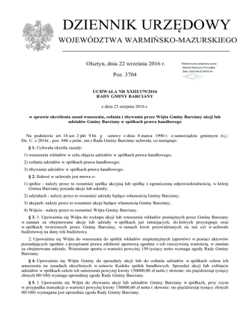 DZIENNIK URZĘDOWY WOJEWÓDZTWA WARMIŃSKO-MAZURSKIEGO Olsztyn, dnia 22 września 2016 r. Elektronicznie podpisany przez: Mariola Katarzyna Porczyńska Poz. 3704 Data: 2016-09-22 09:05:40 UCHWAŁA NR XXIII/179/2016 RADY GMINY BARCIANY z dnia 23 sierpnia 2016 r. w sprawie określenia zasad wnoszenia, cofania i zbywania przez Wójta Gminy Barciany akcji lub udziałów Gminy Barciany w spółkach prawa handlowego Na podstawie art. 18 ust. 2 pkt 9 lit. g ustawy z dnia 8 marca 1990 r. o samorządzie gminnym (t.j.: Dz. U. z 2016r., poz. 446 z późn. zm.) Rada Gminy Barciany uchwala, co następuje: § 1. Uchwała określa zasady: 1) wnoszenia wkładów w celu objęcia udziałów w spółkach prawa handlowego; 2) cofania udziałów w spółkach prawa handlowego; 3) zbywania udziałów w spółkach prawa handlowego. § 2. Ilekroć w uchwale jest mowa o: 1) spółce - należy przez to rozumieć spółkę akcyjną lub spółkę z ograniczoną odpowiedzialnością, w której Gmina Barciany posiada akcje lub udziały; 2) udziałach - należy przez to rozumieć udziały będące własnością Gminy Barciany; 3) akcjach: należy przez to rozumieć akcje będące własnością Gminy Barciany; 4) Wójcie - należy przez to rozumieć Wójta Gminy Barciany. § 3. 1. Upoważnia się Wójta do wykupu akcji lub wnoszenia wkładów pieniężnych przez Gminę Barciany w zamian za obejmowane akcje lub udziały w spółkach już istniejących, do których przystępuje oraz w spółkach tworzonych przez Gminę Barciany, w ramach kwot przewidzianych na ten cel w uchwale budżetowej na dany rok budżetowy. 2. Upoważnia się Wójta do wnoszenia do spółek wkładów niepieniężnych (aportów) w postaci aktywów posiadających zgodnie z przepisami prawa zdolność aportową zgodnie z ich rzeczywistą wartością, w zamian za obejmowane udziały. Wniesienie aportu o wartości powyżej 150 tysięcy netto wymaga zgody Rady Gminy Barciany. § 4. Upoważnia się Wójta Gminy do sprzedaży akcji lub do cofania udziałów w spółkach celem ich umorzenia na zasadach określonych w ustawie Kodeks spółek handlowych. Sprzedaż akcji lub cofnięcie udziałów w spółkach celem ich umorzenia powyżej kwoty 150000,00 zł netto ( słownie: sto pięćdziesiąt tysięcy złotych 00/100) wymaga uprzedniej zgody Rady Gminy Barciany. § 5. 1. Upoważnia się Wójta do zbywania akcji lub udziałów Gminy Barciany w spółkach, przy czym w przypadku transakcji o wartości powyżej kwoty 150000,00 zł netto ( słownie: sto pięćdziesiąt tysięcy złotych 00/100) wymagana jest uprzednia zgoda Rady Gminy Barciany. Dziennik Urzędowy Województwa Warmińsko-Mazurskiego –2– Poz. 3704 2. Akcje lub udziały mogą być zbywane w trybie: 1) negocjacji podjętych na podstawie publicznego zaproszenia; 2) przetargu publicznego; 3) oferty ogłoszonej publicznie; 4) sprzedaży na podstawie oferty publicznej w obrocie zorganizowanym lub poza obrotem zorganizowanym w rozumieniu przepisów o obrocie instrumentami finansowymi. 3. Akcje lub udziały w spółkach, w których Gmina Barciany posiada nie więcej niż 25% wartości akcji lub udziałów w kapitale zakładowym spółki, mogą być zbywane z pominięciem trybów określonych w ust. 2 pkt 4. Przed zaoferowaniem do zbycia całości lub części akcji lub udziałów w spółkach, dokonuje się wyceny wartości zbywanych akcji lub udziałów. § 6. 1. O każdym wykupie akcji, wniesieniu wkładu bądź sprzedaży akcji lub cofnięciu udziałów, Wójt informuje Radę Gminy na najbliższej sesji Rady Gminy następującej po wykupie akcji, objęciu lub cofnięciu udziałów lub występuje o zgodę zgodnie z § 4. 2. Informację o zamiarze zbycia akcji lub udziałów Wójt przekazuje Radzie Gminy przed podjęciem czynności zbycia akcji lub udziałów lub występuje o zgodę zgodnie z § 5. 1. 3. Informacje, o których mowa w ust. 1 i 2 zawierają między innymi: 1) nazwę spółki, ilość i wartość wykupionych, objętych, cofniętych lub zbywanych akcji lub udziałów; 2) cenę akcji lub udziałów według wyceny; 3) tryb zbywania akcji lub cofnięcia udziałów; 4) dane dotyczące zaangażowania Gminy Barciany w kapitale zakładowym spółki po wykupie, objęciu, cofnięciu, a także zbyciu akcji lub udziałów. § 7. Gmina Barciany może w szczególności obejmować udziały w spółkach już istniejących, do których przystąpiła bądź przystępuje oraz spółkach tworzonych i współtworzonych przez Gminę. § 8. Wykonanie uchwały powierza się Wójtowi Gminy. § 9. Uchwała wchodzi w życie po upływie 14 dni od dnia ogłoszenia w Dzienniku Urzędowym Województwa Warmińsko- Mazurskiego. Przewodnicząca Rady Gminy Wiesława Małgorzata Kłaczko-Dyjas
