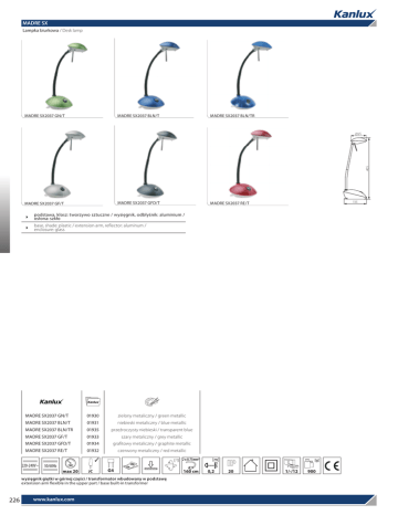 MADRE SX Lampka biurkowa / Desk lamp MADRE SX2037 BLN/TR MADRE SX2037 BLN/T MADRE SX2037 GN/T 405 Ø95 MADRE SX2037 GFD/T MADRE SX2037 GF/T podstawa, klosz: tworzywo sztuczne / wysięgnik, odbłyśnik: aluminium / osłona: szkło base, shade: plastic / extension arm, reflector: aluminum / enclosure: glass MADRE SX2037 GN/T 01930 zielony metaliczny / green metallic MADRE SX2037 BLN/T 01931 niebieski metaliczny / blue metallic MADRE SX2037 BLN/TR 01935 przeźroczysty niebieski / transparent blue MADRE SX2037 GF/T 01933 szary metaliczny / grey metallic MADRE SX2037 GFD/T 01934 grafitowy metaliczny / graphite metallic MADRE SX2037 RE/T 01932 czerwony metaliczny / red metallic 220-240V~ 2 x 0,75mm2 50/60Hz max 20 wysięgnik giętki w górnej części / transformator wbudowany w podstawę extension arm flexible in the upper part / base built-in transformer 226 135 MADRE SX2037 RE/T www.kanlux.com 160 cm 0,2 20 1/-/12 900