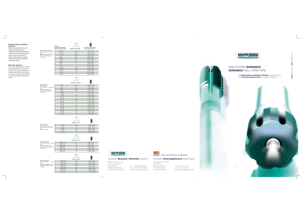 Wymiar nominalny gwintu [D] / Nominal diameter [D] Gwint metryczny Regularny ISO-6H wg DIN 13 oraz DIN ISO 965-1 / Metric ISO course thread acc. DIN 13 and DIN ISO 965-1; tolerance 6H Bore-hole diameter The minor diameter of the internal thread depends on the pre-hole diameter. The recommended bore hole diameters (drill sizes) are approximative. Additional tool testing will optimize the best drill size to select. Skok [P] / Pitch [P] Średnica otworu [mm] / Bore diameter [mm] M 1,6 0,35 1,44 ± 0,02 M 2 0,4 1,82 ± 0,02 M 2,5 0,45 2,30 ± 0,02 M 3 0,5 2,78 ± 0,02 M 3,5 0,6 3,25 ± 0,03 M 4 0,7 3,70 ± 0,03 M 5 0,8 4,65 ± 0,03 M 6 1 5,55 ± 0,03 M 7 1 6,55 ± 0,03 M 8 1,25 7,45 ± 0,04 M 10 1,5 9,35 ± 0,04 M 12 1,75 M 14 2 13,10 ± 0,05 M 16 2 15,10 ± 0,05 GNIOTOWNIKI DURAMAX DURAMAX ROLL FORM TAPS 11,20 ± 0,05 DO BEZWIÓROWEJ OBRÓBKI GWINTÓW WEWNĘTRZNYCH FOR CHIPLESS PRODUCTION OF INTERNAL THREADS Skok [P] / Pitch [P] Gwint metryczny Drobnozwojny ISO-6H wg DIN 13 oraz DIN ISO 965-1 / Metric ISO fine thread acc. DIN 13 and DIN ISO 965-1; tolerance 6H M 4 0,5 3,80 ± 0,02 M 5 0,5 4,78 ± 0,02 M 6 0,5 5,78 ± 0,02 M 6 0,75 5,65 ± 0,03 M 8 1 7,55 ± 0,03 M 10 1 9,55 ± 0,03 M 10 1,25 9,45 ± 0,04 M 12 1 11,55 ± 0,03 M 12 1,25 11,45 ± 0,04 M 12 1,5 11,35 ± 0,04 M 14 1 13,55 ± 0,03 M 14 1,5 13,35 ± 0,04 M 16 1 15,55 ± 0,03 M 16 1,5 15,35 ± 0,04 M 18 1,5 17,35 ± 0,04 M 20 1,5 19,35 ± 0,04 M 22 1,5 21,35 ± 0,04 Zwój/1" / TPI 1" Gwint rurowy wg DIN EN ISO 228 / British standard pipe thread acc. DIN EN ISO 228 (G) G 1/8" 28 G 1/4" 19 12,40 ± 0,04 G 3/8" 19 15,95 ± 0,04 G 1/2" 14 19,95 ± 0,05 G 3/4" 14 25,45 ± 0,05 9,25 ± 0,03 Zwój/1" / TPI 1" Gwint amerykański UNC-2B wg ASME B1.1 lub ISO 5864 / American unified course thread UNC-2B acc. ASME B1.1 resp. ISO 5864 UNC No.10 24 4,35 ± 0,04 UNC 1/4" 20 5,80 ± 0,04 UNC 5/16" 18 7,30 ± 0,04 UNC 3/8" 16 8,80 ± 0,05 UNC 7/16" 14 10,30 ± 0,05 UNC 1/2" 13 11,80 ± 0,05 TWÓJ DOSTAWCA NARZĘDZI Zwój/1" / TPI 1" Gwint amerykański UNF-2B wg ASME B1.1 lub ISO 5864 American unified fine thread UNF-2B acc. ASME B1.1 resp. ISO 5864 UNF No.10 32 4,45 ± 0,03 UNF No.12 28 5,10 ± 0,03 UNF 1/4" 28 5,95 ± 0,03 UNF 5/16" 24 7,45 ± 0,04 UNF 3/8" 24 9,05 ± 0,04 UNF 7/16" 20 10,55 ± 0,04 UNF 1/2" 20 12,15 ± 0,04 www.bass-tools.com www.msspinex.com.pl BASS GmbH & Co. KG Technik für Gewinde Bass-Strasse 1 97996 Niederstetten Deutschland / Germany Przedstawiciel w Polsce: MS SPINEX Maciej Spinkiewicz 04-672 Warszawa ul. Klimontowska 19 Tel.: +49-(0)79 32-8 92-0 Fax: +49-(0)79 32-8 92-87 E-Mail: [email protected] Tel.: 022/512-50-00 Fax: 022/512-50-50 E-Mail: [email protected] NOWA GENERACJA | NEW GENERATION Średnica otworu wstępnego pod gwint Średnica wewnętrzna gwintu jest zależna od średnicy otworu wstępnego. Proponowane średnice otworów pod gwint są wielkościami sugerowanymi (przybliżonymi). Dzięki przeprowadzonym testom zostały określone ich najbardziej optymalne wymiary. WIĘKSZA WYDAJNOŚĆ - DZIĘKI NOWYM GNIOTOWNIKOM DURAMAX FIRMY BASS HIGHER EFFICIENCY - WITH NEW BASS DURAMAX ROLL TAPS DURAMAX - gniotowniki nowej generacji firmy BASS Dzięki optymalizacji kształtu poligonowego oraz polepszeniu jakości ich powierzchniwydajność gniotowników firmy BASS została znacząco zwiększona. Prędkości skrawania oraz żywotność narzędzi mogą zostać znacznie zwiększone, a nawet często i podwojone, w zależności od obrabianegomateriału i warunków pracy. The new DURAMAX generation of BASS roll taps Due to an optimized tap geometry and an improved surface quality the performance of BASS roll taps has been improved to the level where speeds and feeds can often be doubled with the added benefit of increased tool life. Proces Przy wygniataniu gwintu wewnętrznego za pomocą narzędzia formującego – gniotownika – wykorzystana zostaje zdolność płynięcia gwintowanego materiału. Zalety w porównaniu do gwintu nacinanego • brak wiórów i problemów z wiórami • wysoka pewność procesu również przy dużych głębokościach • wysoka wytrzymałość gwintu • wysoka jakość powierzchni • precyzyjna tolerancja i dokładny profil gwintu • brak poziomych przecięć gwintu • wyższa żywotność narzędzia • wyższy zakres prędkości skrawania • tylko z BASS’em - jedno narzędzie do otworów ślepych i przelotowychoraz do zróżnicowanych materiałów Nacinanie gwintu Wygniatanie gwintu przecięte włókna materiału nie przecięte włókna materiału większa wytrzymałość Process The material´s ability to flow is used to roll form the internal thread of the work piece. Kat.-Nr. / cat.-no. 1531.5 1531.5 TIN 20.1531.5 TIN 1531 TIN E-1531 TIN 1531 20.1531 TIN 20.1531 KA TIN 20.1531 KR TIN 40.1531.5 TICN Wymagania przy wygniataniu gwintu • materiały o wytrzymałości do max. 1.200 N/mm 2 oraz wydłużeniu po zerwaniu min. 8% • większa średnica otworu wstęp nego i wąsko tolerowana • dobre smarowanie • max. skok gwintu 2,5 mm • wymagana wyższa moc maszyny (1,5 - 2 razy w stosunku do gwintownika) Gwintownik Advantages compared to thread cutting • elimination of chip problems • safe process also for tapping deep holes • increased strength against tearing out (thread shear) • better surface quality/profile finish • exact tolerance and profile • no axial miscut of threads • higher tool life • higher cutting speed possible • with BASS: only one roll tap for through holes and blind holes as well as for different materials Gniotownik tapping roll forming broken fibre course continuous fibre course leading to higher strength Preconditions for roll forming • tensile strength of material up to 1200 N/mm 2 and an elongation of rupture of min. 8% • larger bore hole diameter with smaller tolerance • good lubricant • max. pitch is 2,5 mm • drive horse power (1.5-2 x to cutting tap) cutting tap roll tap Typ otworu / bore Typ gniotownika / type Tolerancja / toleranc
