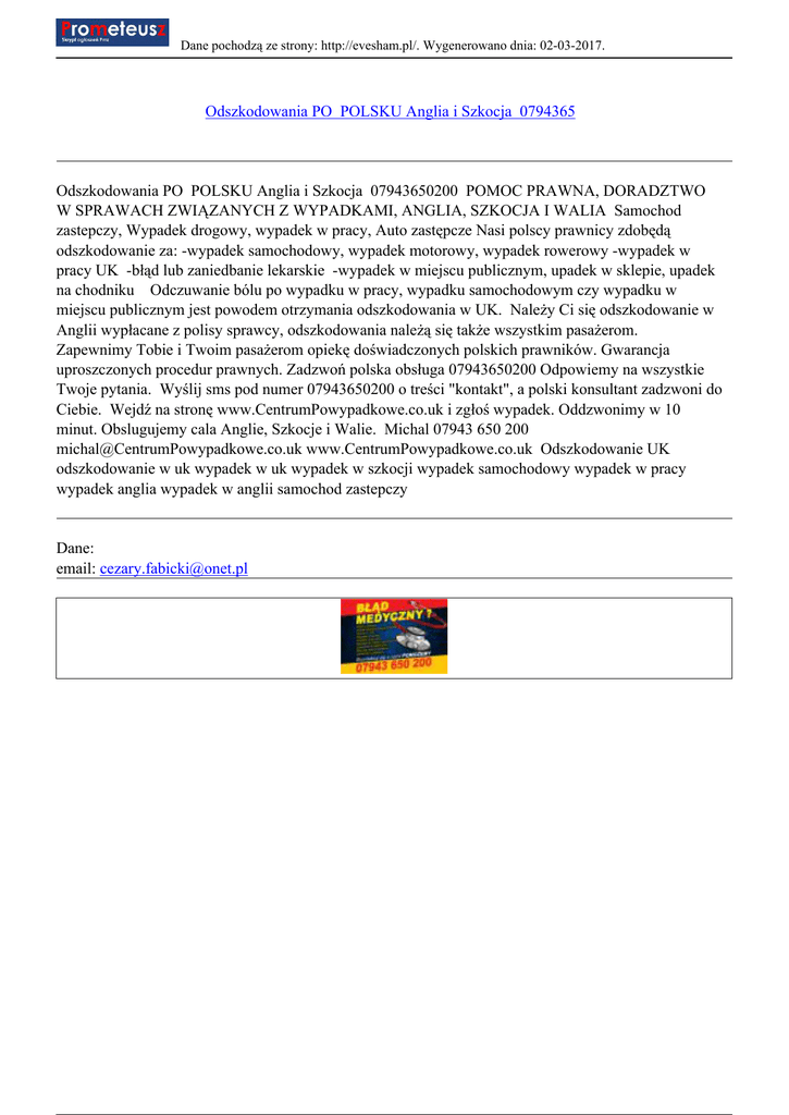 Dane pochodzą ze strony: http://evesham.pl/. Wygenerowano dnia: 02-03-2017. Odszkodowania PO POLSKU Anglia i Szkocja 0794365 Odszkodowania PO POLSKU Anglia i Szkocja 07943650200 POMOC PRAWNA, DORADZTWO W SPRAWACH ZWIĄZANYCH Z WYPADKAMI, ANGLIA, SZKOCJA I WALIA Samochod zastepczy, Wypadek drogowy, wypadek w pracy, Auto zastępcze Nasi polscy prawnicy zdobędą odszkodowanie za: -wypadek samochodowy, wypadek motorowy, wypadek rowerowy -wypadek w pracy UK -błąd lub zaniedbanie lekarskie -wypadek w miejscu publicznym, upadek w sklepie, upadek na chodniku Odczuwanie bólu po wypadku w pracy, wypadku samochodowym czy wypadku w miejscu publicznym jest powodem otrzymania odszkodowania w UK. Należy Ci się odszkodowanie w Anglii wypłacane z polisy sprawcy, odszkodowania należą się także wszystkim pasażerom. Zapewnimy Tobie i Twoim pasażerom opiekę doświadczonych polskich prawników. Gwarancja uproszczonych procedur prawnych. Zadzwoń polska obsługa 07943650200 Odpowiemy na wszystkie Twoje pytania. Wyślij sms pod numer 07943650200 o treści "kontakt", a polski konsultant zadzwoni do Ciebie. Wejdź na stronę www.CentrumPowypadkowe.co.uk i zgłoś wypadek. Oddzwonimy w 10 minut. Obslugujemy cala Anglie, Szkocje i Walie. Michal 07943 650 200 [email protected] www.CentrumPowypadkowe.co.uk Odszkodowanie UK odszkodowanie w uk wypadek w uk wypadek w szkocji wypadek samochodowy wypadek w pracy wypadek anglia wypadek w anglii samochod zastepczy Dane: email: [email protected]