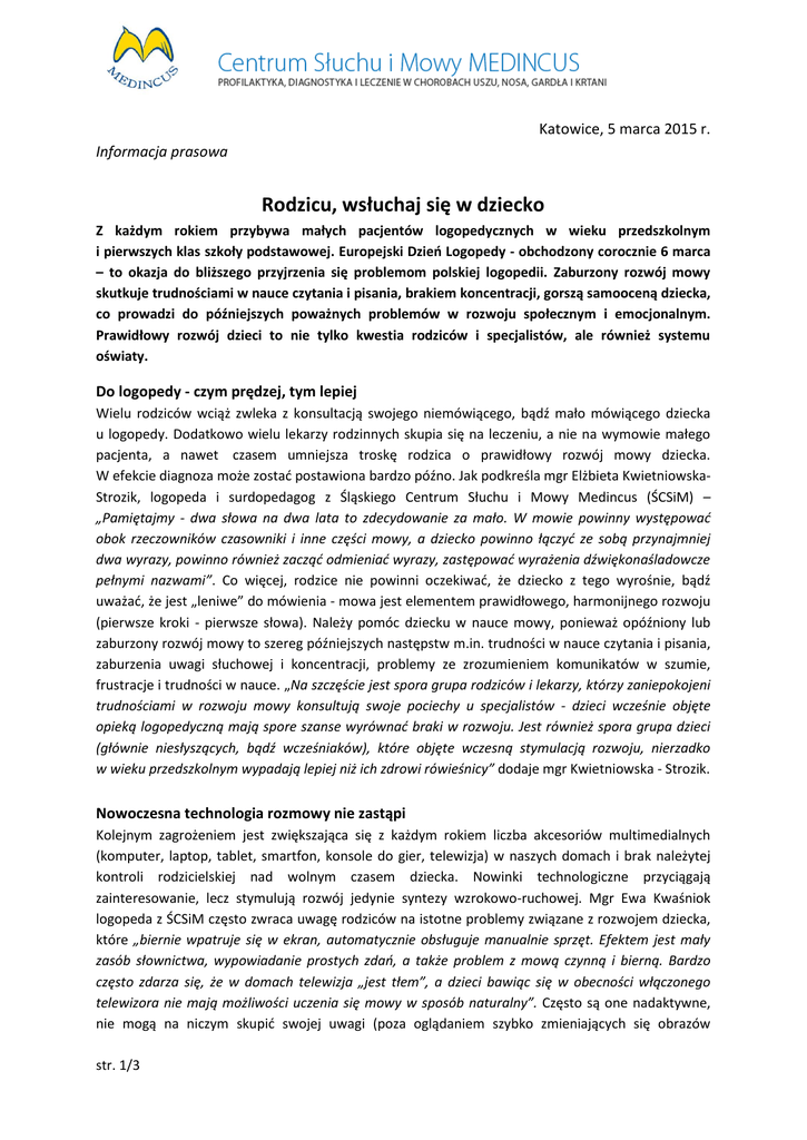 Katowice, 5 marca 2015 r. Informacja prasowa Rodzicu, wsłuchaj się w dziecko Z każdym rokiem przybywa małych pacjentów logopedycznych w wieku przedszkolnym i pierwszych klas szkoły podstawowej. Europejski Dzieo Logopedy - obchodzony corocznie 6 marca – to okazja do bliższego przyjrzenia się problemom polskiej logopedii. Zaburzony rozwój mowy skutkuje trudnościami w nauce czytania i pisania, brakiem koncentracji, gorszą samooceną dziecka, co prowadzi do późniejszych poważnych problemów w rozwoju społecznym i emocjonalnym. Prawidłowy rozwój dzieci to nie tylko kwestia rodziców i specjalistów, ale również systemu oświaty. Do logopedy - czym prędzej, tym lepiej Wielu rodziców wciąż zwleka z konsultacją swojego niemówiącego, bądź mało mówiącego dziecka u logopedy. Dodatkowo wielu lekarzy rodzinnych skupia się na leczeniu, a nie na wymowie małego pacjenta, a nawet czasem umniejsza troskę rodzica o prawidłowy rozwój mowy dziecka. W efekcie diagnoza może zostad postawiona bardzo późno. Jak podkreśla mgr Elżbieta KwietniowskaStrozik, logopeda i surdopedagog z Śląskiego Centrum Słuchu i Mowy Medincus (ŚCSiM) – „Pamiętajmy - dwa słowa na dwa lata to zdecydowanie za mało. W mowie powinny występowad obok rzeczowników czasowniki i inne części mowy, a dziecko powinno łączyd ze sobą przynajmniej dwa wyrazy, powinno również zacząd odmieniad wyrazy, zastępowad wyrażenia dźwiękonaśladowcze pełnymi nazwami”. Co więcej, rodzice nie powinni oczekiwad, że dziecko z tego wyrośnie, bądź uważad, że jest „leniwe” do mówienia - mowa jest elementem prawidłowego, harmonijnego rozwoju (pierwsze kroki - pierwsze słowa). Należy pomóc dziecku w nauce mowy, ponieważ opóźniony lub zaburzony rozwój mowy to szereg późniejszych następstw m.in. trudności w nauce czytania i pisania, zaburzenia uwagi słuchowej i koncentracji, problemy ze zrozumieniem komunikatów w szumie, frustracje i trudności w nauce. „Na szczęście jest spora grupa rodziców i lekarzy, którzy zaniepokojeni trudnościami w rozwoju mowy konsultują swoje pociechy u specjalistów - dzieci wcześnie objęte opieką logopedyczną mają spore szanse wyrównad braki w rozwoju. Jest również spora grupa dzieci (głównie niesłyszących, bądź wcześniaków), które objęte wczesną stymulacją rozwoju, nierzadko w wieku przedszkolnym wypadają lepiej niż ich zdrowi rówieśnicy” dodaje mgr Kwietniowska - Strozik. Nowoczesna technologia rozmowy nie zastąpi Kolejnym zagrożeniem jest zwiększająca się z każdym rokiem liczba akcesoriów multimedialnych (komputer, laptop, tablet, smartfon, konsole do gier, telewizja) w naszych domach i brak należytej kontroli rodzicielskiej nad wolnym czasem dziecka. Nowinki technologiczne przyciągają zainteresowanie, lecz stymulują rozwój jedynie syntezy wzrokowo-ruchowej. Mgr Ewa Kwaśniok logopeda z ŚCSiM często zwraca uwagę rodziców na istotne problemy związane z rozwojem dziecka, które „biernie wpatruje się w ekran, automatycznie obsługuje manualnie sprzęt. Efektem jest mały zasób słownictwa, wypowiadanie prostych zdao, a także problem z mową czynną i bierną. Bardzo często zdarza się, że w domach telewizja „jest tłem”, a dzieci bawiąc się w obecności włączonego telewizora nie mają możliwości uczenia się mowy w sposób naturalny”. Często są one nadaktywne, nie mogą na niczym skupid swojej uwagi (poza oglądaniem szybko zmieniających się obrazów str. 1/3 i naciskaniem guziczków z melodyjkami). „Takie dzieci budują swoje rozumienie języka jedynie w oparciu o kontekst i konsytuację, tylko o znane słowa–klucze” dodaje mgr Kwaśniok. Jak podkreślają specjaliści, dla prawidłowego rozwoju dziecko potrzebuje czasu swoich opiekunów poświęconego na rozmowy, zabawy, czytanie książek. Jego brak powoduje powolny rozwój mowy dziecka i jej zniekształcenie. Szkolny problem – brak specjalistycznych zajęd dla dzieci Warunkiem koniecznym do prawidłowego rozwoju mowy jest prawidłowy słuch dziecka. Prowadzone w Polsce, w ramach programów przesiewowych badania słuchu (w okresie noworodkowym, w wieku przedszkolnym i wczesnoszkolnym) pozwalają na wczesne wykrycie niedosłuchu i szybkie wdrożenie odpowiedniego postępowania (np. założenie aparatów słuchowych, leczenie metodą implantów ślimakowych). „Nie wszystkie rodzaje niedosłuchów, które pojawiają się u dzieci, zwłaszcza w okresie przedszkolnym i wczesnoszkolnym wymagają jednak założenia aparatów słuchowych. Można je wyleczyd farmakologicznie lub operacyjnie przywracając prawidłowy próg słuchu. Jeśli małe dziecko choruje na nawracające infekcje dróg oddechowych, oddycha przez jamę ustną, w nocy chrapie, głośno słucha telewizji, często dopytuje - prawdopodobnie ma niedosłuch związany z chorobą uszu środkowych i przerostem migdałka gardłowego” mówi dr n. med. Irena Urban, kierownik ŚCSiM. Często oprócz rodziców uwagę na problemy logopedyczne zwracają nauczyciele. Konieczna jest wówczas wizyta u specjalisty audiologa i foniatry lub otolaryngologa, który po zbadaniu dziecka wdroży odpowiednie leczenie, a logopeda rehabilitację. Niektóre dzieci – pomimo tego, że w „podstawowych” badaniach słuchu, służących do oceny progu słuchu mają prawidłowe wyniki, według obserwacji rodziców i nauczycieli zachowują się i funkcjonują podobnie do tych z niedosłuchem. Wynika to u nich z zaburzeo analizy bodźców dźwiękowych w ośrodkowym układzie nerwowym, a będący tego skutkiem zespół objawów określanych jako zaburzenia centralnych procesów przetwarzania słuchowego (CAPD) nazywany jest także niedosłuchem centralnym. Zaburzenia słyszenia w szumie i hałasie, zaburzenia koncentracji, problemy z zapamiętywaniem i inne dysfunkcje logopedyczne, pomimo prawidłowego rozwoju intelektualnego u tych dzieci są przyczyną poważnych trudności w nauce.
