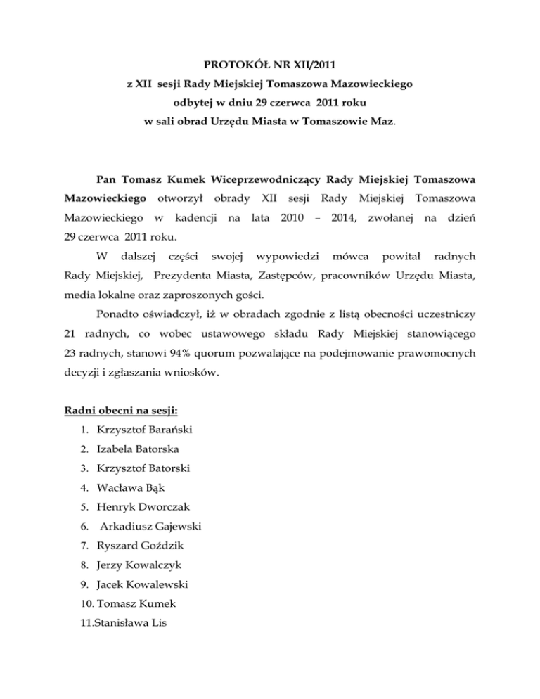 PROTOKÓŁ NR XII/2011 z XII sesji Rady Miejskiej Tomaszowa Mazowieckiego odbytej w dniu 29 czerwca 2011 roku w sali obrad Urzędu Miasta w Tomaszowie Maz. Pan Tomasz Kumek Wiceprzewodniczący Rady Miejskiej Tomaszowa Mazowieckiego otworzył Mazowieckiego w obrady XII sesji Rady Miejskiej Tomaszowa kadencji na lata 2010 – 2014, zwołanej na dzień 29 czerwca 2011 roku. W dalszej części swojej wypowiedzi mówca powitał radnych Rady Miejskiej, Prezydenta Miasta, Zastępców, pracowników Urzędu Miasta, media lokalne oraz zaproszonych gości. Ponadto oświadczył, iŜ w obradach zgodnie z listą obecności uczestniczy 21 radnych, co wobec ustawowego składu Rady Miejskiej stanowiącego 23 radnych, stanowi 94% quorum pozwalające na podejmowanie prawomocnych decyzji i zgłaszania wniosków. Radni obecni na sesji: 1. Krzysztof Barański 2. Izabela Batorska 3. Krzysztof Batorski 4. Wacława Bąk 5. Henryk Dworczak 6. Arkadiusz Gajewski 7. Ryszard Goździk 8. Jerzy Kowalczyk 9. Jacek Kowalewski 10. Tomasz Kumek 11.Stanisława Lis 12.Wiesław Pawłowski 13.Krzysztof Pierściński 14.Kazimierz Pietrzyk 15.Łukasz Rzęczykowski 16.Tomasz Trzonek 17.Tomasz Wawro 18.Krystyna Wilk 19.Marcin Witko 20.Tomasz Zdonek 21.Cezary śegota Radni nieobecni na sesji: 1.Stanisław Stańdo 2.Marek Kubiak Lista obecności stanowi załącznik Nr 1 do niniejszego protokołu. Dotyczy punktu 2. Przedstawienie porządku obrad XI sesji Rady Miejskiej. Pan Tomasz Kumek Wiceprzewodniczący Rady Miejskiej poinformował, iŜ porządek XII sesji Rady Miejskiej Tomaszowa Mazowieckiego został radnym przekazany w ustawowym terminie. Ponadto poinformował, iŜ w dniu 22 czerwca 2011 roku została radnym Rady Miejskiej przekazana autopoprawka do porządku sesji zwołanej na dzień 29 czerwca br. W związku z brakiem głosów w dyskusji przystąpiono do realizacji niŜej wymienionego porządku obrad, a mianowicie: 2 Część I 1. Otwarcie sesji i powitanie zebranych. 2. Przedstawienie porządku obrad XII sesji Rady Miejskiej. 3. Przyjęcie protokołu z X sesji Rady Miejskiej z dnia 27 kwietnia 2011 roku oraz z XI sesji Rady Miejskiej z dnia 25 maja 2011 roku. 4. Wręczenie nagród uzdolnionej młodzieŜy szkół podstawowych i gimnazjów w Tomaszowie Maz. Część II 5. Podjęcie uchwały w sprawie dokonania zmian w „BudŜecie Miasta Tomaszowa Mazowieckiego na 2011 r.” 6. Podjęcie uchwały o zmianie uchwały Nr VII/52/2011 Rady Miejskiej Tomaszowa Mazowieckiego z dnia 23 lutego 2011 r. w sprawie uchwalenia „Wieloletniej Prognozy Finansowej Miasta Tomaszowa Mazowieckiego na lata 2011-2020” zmienionej uchwałą Nr XI/97/2011 Rady Miejskiej Tomaszowa Mazowieckiego z dnia 25 maja 2011 r. o zmianie uchwały Nr VII/52/2011 Rady Miejskiej Tomaszowa Mazowieckiego z dnia 23 lutego 2011 r. w sprawie uchwalenia „Wieloletniej Prognozy Finansowej Miasta Tomaszowa Mazowieckiego na lata 2011-2020”. 7. Podjęcie uchwały w sprawie zakresu i formy informacji o przebiegu wykonania budŜetu Miasta Tomaszowa Mazowieckiego, informacji o kształtowaniu się wieloletniej prognozy finansowej oraz informacji o przebiegu wykonania planów finansowych samorządowych instytucji kultury za pierwsze półrocze kaŜdego roku budŜetowego. 8. Podjęcie uchwały w sprawie zaciągnięcia kredytu długoterminowego przeznaczonego na pokrycie planowanego deficytu budŜetu w 2011 r. i spłatę wcześniej zaciągniętych zobowiązań z tytułu kredytów i poŜyczek 3 9. Podjęcie uchwały w sprawie zatwierdzenia sprawozdania finansowego za 2010 rok wraz ze sprawozdaniem z wykonania budŜetu Miasta Tomaszowa Mazowieckiego za 2010 rok. • przedstawienie sprawozdania z wykonania budŜetu Miasta Tomaszowa Mazowieckiego za 2010 rok wraz z informacją o stanie mienia jednostki samorządu terytorialnego, • przedstawienie opinii Regionalnej Izby Obrachunkowej w Łodzi o sprawozdaniu Prezydenta Miasta Tomaszowa Mazowieckiego z wykonania budŜetu za 2010 rok, • przedstawienie sprawozdania finansowego Gminy Miasto Tomaszów Mazowiecki na dzień 31 grudnia 2010 roku, • informacja Komisji Rewizyjnej Rady Miejskiej Tomaszowa Mazowieckiego z rozpatrzenia dokumentów, zgodnie z ustawą o finansach publicznych. 10. Podjęcie uchwały w sprawie udzielenia absolutorium Prezydentowi Miasta Tomaszowa Mazowieckiego z tytułu wykonania budŜetu za 2010 rok. • stanowisko Komisji Rewizyjnej Rady Miejskiej w zakresie wniosku o udzielenie absolutorium, • przedstawienie opinii Regionalnej Izby Obrachunkowej w Łodzi dotyczącej wniosku o udzielenie absolutorium. 11. Podjęcie uchwały w sprawie sprzedaŜy w drodze przetargu nieograniczonego nieruchomości niezabudowanej stanowiącej własność Gminy Miasto Tomaszów Mazowiecki, połoŜonej w Tomaszowie Mazowieckim przy ul. Piaskowej nr 54. 12. Podjęcie uchwały w sprawie sprzedaŜy w formie przetargu nieograniczonego, nieruchomości zabudowanej stanowiącej własność Gminy Miasto Tomaszów Mazowiecki, połoŜonej w Tomaszowie Mazowieckim przy ul. Pustej 73. 4 13. Podjęcie uchwały w sprawie wyraŜenia zgody na nabycie do zasobów komunalnych w drodze darowizny nieruchomości stanowiących własność Skarbu Państwa połoŜonych w Tomaszowie Maz. przy ul. Spalskiej. 14. Podjęcie uchwały w sprawie sprzedaŜy, w formie bezprzetargowej, działek gruntu stanowiących własność Gminy Miasto Tomaszów Mazowiecki, połoŜonych w Tomaszowie Mazowieckim w obrębie nr 19 oznaczonych nr ewid. 100/2 i 92/2 mogących poprawić warunki zagospodarowania nieruchomości przyległej połoŜonej przy ul. Witosa 78. 15. Podjęcie uchwały w sprawie przekazania do prowadzenia szkoły publicznej Gimnazjum dla Dorosłych w Tomaszowie Mazowieckim w drodze umowy Andrzejowi Baranowskiemu, Andrzejowi Nielepkowicz, Markowi Stępkowskiemu, prowadzącymi „KOMED” s.c. Andrzej Baranowski, Andrzej Nielepkowicz, Marek Stępkowski w Tomaszowie Mazowieckim. 16. Podjęcie uchwały w sprawie powołania przedstawicieli Rady Miejskiej Tomaszo