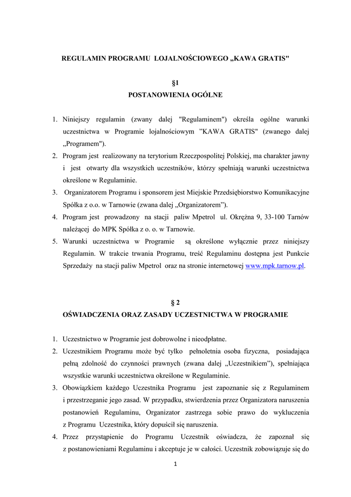 REGULAMIN PROGRAMU LOJALNOŚCIOWEGO „KAWA GRATIS" §1 POSTANOWIENIA OGÓLNE 1. Niniejszy regulamin (zwany dalej "Regulaminem") określa ogólne warunki uczestnictwa w Programie lojalnościowym ”KAWA GRATIS" (zwanego dalej „Programem"). 2. Program jest realizowany na terytorium Rzeczpospolitej Polskiej, ma charakter jawny i jest otwarty dla wszystkich uczestników, którzy spełniają warunki uczestnictwa określone w Regulaminie. 3. Organizatorem Programu i sponsorem jest Miejskie Przedsiębiorstwo Komunikacyjne Spółka z o.o. w Tarnowie (zwana dalej „Organizatorem”). 4. Program jest prowadzony na stacji paliw Mpetrol ul. Okrężna 9, 33-100 Tarnów należącej do MPK Spółka z o. o. w Tarnowie. 5. Warunki uczestnictwa w Programie są określone wyłącznie przez niniejszy Regulamin. W trakcie trwania Programu, treść Regulaminu dostępna jest Punkcie Sprzedaży na stacji paliw Mpetrol oraz na stronie internetowej www.mpk.tarnow.pl. §2 OŚWIADCZENIA ORAZ ZASADY UCZESTNICTWA W PROGRAMIE 1. Uczestnictwo w Programie jest dobrowolne i nieodpłatne. 2. Uczestnikiem Programu może być tylko pełnoletnia osoba fizyczna, posiadająca pełną zdolność do czynności prawnych (zwana dalej „Uczestnikiem”), spełniająca wszystkie warunki uczestnictwa określone w Regulaminie. 3. Obowiązkiem każdego Uczestnika Programu jest zapoznanie się z Regulaminem i przestrzeganie jego zasad. W przypadku, stwierdzenia przez Organizatora naruszenia postanowień Regulaminu, Organizator zastrzega sobie prawo do wykluczenia z Programu Uczestnika, który dopuścił się naruszenia. 4. Przez przystąpienie do Programu Uczestnik oświadcza, że zapoznał się z postanowieniami Regulaminu i akceptuje je w całości. Uczestnik zobowiązuje się do 1 przestrzegania zasad, określonych w Regulaminie, jak również potwierdza, iż spełnia wszystkie warunki, które uprawniają go do udziału w Programie. 5. Warunkami koniecznymi uczestnictwa w Programie jest posiadanie przez Uczestnika karty klienta z numerem identyfikacyjnym, wydawanej przez Mpetrol, za pomocą której Uczestnik korzysta z Rabatów na stacji Mpetrol zwanej dalej „Kartą Rabatową Mpetrol”. 6. Karta Rabatowa jest własnością Mpetrol, może się nią posługiwać wyłącznie Uczestnik, którego podpis widnieje na Karcie. Domniemywa się, że osoba okazująca Kartę jest uprawnionym do dysponowania nią Uczestnikiem Programu Mpetrol. Organizator zastrzega sobie możliwość weryfikacji tożsamości osoby, która przedstawia Kartę Rabatową, w tym poproszenia tej osoby o złożenie podpisu. Każdy Uczestnik korzystający z Karty jest związany postanowieniami niniejszego Regulaminu. 7. Warunki wydania oraz korzystania z Karty Rabatowej Mpetrol zostały określone w Regulaminie Programu Mpetrol, który stanowi załącznik nr 1 do niniejszego Regulaminu. §3 ZASADY PROGRAMU 1. Każdy Uczestnik, który dokona zakupu paliwa za dowolną kwotę na Stacji paliw Mpetrol (ul. Okrężna 9, Tarnów) lub Mpetrol LPG (ul. Lwowska 199a, Tarnów) i okaże Kartę Rabatową Mpetrol może otrzymać każdorazowo jedną kawę gratis zwaną dalej „Nagrodą”. 2. Nagroda zostanie wydana w postaci określonej Regulaminem, bez możliwości wypłaty jej równowartości w gotówce lub zamiany na inną nagrodę. 3. „Nagroda” wydawana jest na stacji paliw Mpetrol, ul. Okrężna 9 w Tarnowie. 4. Klienci, którzy dokonali zakupu paliwa na stacji paliw Mpetrol LPG, przy ul. Lwowskiej 199a w Tarnowie, otrzymają „Nagrodę” po okazaniu dowodu zakupu paliwa oraz Karty Rabatowej Mpetrol. §4 POSTĘPOWANIE REKLAMACYJNE 1. Wszelkie reklamacje (zwane dalej „Reklamacjami”) mogą być składane jedynie przez Uczestników Programów i mogą dotyczyć wyłącznie ich przebiegu. 2 2. Reklamacje należy zgłaszać w formie pisemnej na adres Organizatora: MPK Spółka z o.o. ul. Okrężna 9, 33-100 Tarnów. 3. Wszelkie reklamacje będą rozpatrywane w terminie 14 dni od daty otrzymania Reklamacji w formie określonej Regulaminem. 4. Reklamacje rozpatruje Organizator Programu. Decyzje Organizatora rozstrzygające Reklamacje są ostateczne i wiążące. Organizator powiadomi Uczestnika o decyzji w sprawie zgłoszonej Reklamacji za pomocą listu poleconego w ciągu 7 dni od daty rozpatrzenia Reklamacji. §5 POSTANOWIENIA KOŃCOWE 1. We wszystkich sprawach dotyczących Programów, nieuregulowanych w niniejszym Regulaminie decyzje podejmuje Organizator. 2. Organizator zastrzega sobie prawo zakończenia Programu w każdym czasie po upływie 30 dni od dnia ogłoszenia takiej informacji na stronie internetowej www.mpk.tarnow.pl oraz na stacji Mpetrol. 3. Organizator zastrzega sobie prawo zmiany treści niniejszego Regulaminu. 4. W przypadku naruszenia postanowień niniejszego Regulaminu przez Uczestnika Organizator uprawniony jest do wykluczenia uczestnika z udziału w Programie. Wykluczenie z Programu powoduje utratę możliwości korzystania z Karty Rabatowej. 5. Uprawnienia wynikające z uczestnictwa w Programie nie mogą być przeniesione przez Uczestnika na osobę trzecią. 6. Niniejszy Regulamin poddany jest właściwości prawa polskiego. 7. Wszelkie informacje o Programie dostępne w materiałach reklamowych mają jedynie charakter informacyjny. 8. Załączniki stanowią integralną część Regulaminu. Załącznik: 1.Regulamin Programu Mpetrol 3