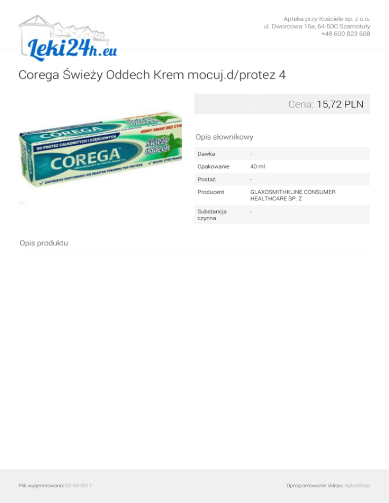 Apteka przy Kościele sp. z o.o. ul. Dworcowa 16a, 64-500 Szamotuły +48 600 823 608 Corega Świeży Oddech Krem mocuj.d/protez 4 Cena: 15,72 PLN Opis słownikowy Dawka - Opakowanie 40 ml Postać - Producent GLAXOSMITHKLINE CONSUMER HEALTHCARE SP. Z Substancja czynna - Opis produktu Plik wygenerowano: 02-03-2017 Powered by TCPDF (www.tcpdf.org) Oprogramowanie sklepu: AptusShop
