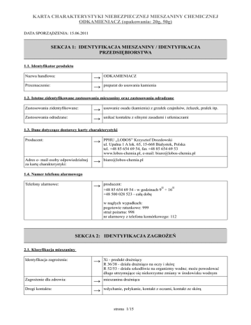 KARTA CHARAKTERYSTYKI NIEBEZPIECZNEJ MIESZANINY CHEMICZNEJ ODKAMIENIACZ (opakowania: 20g, 50g) DATA SPORZĄDZENIA: 15.06.2011 ________________________________________________________________________________________________ SEKCJA 1: IDENTYFIKACJA MIESZANINY / IDENTYFIKACJA PRZEDSIĘBIORSTWA ________________________________________________________________________________________________ 1.1. Identyfikator produktu Nazwa handlowa: → → Przeznaczenie: ODKAMIENIACZ preparat do usuwania kamienia 1.2. Istotne zidentyfikowane zastosowania mieszaniny oraz zastosowania odradzane Zastosowania zidentyfikowane: Zastosowania odradzane: → → usuwanie osadu (kamienia) z grzałek czajników, żelazek, pralek itp. unikać kontaktu z silnymi zasadami i utleniaczami 1.3. Dane dotyczące dostawcy karty charakterystyki Producent: → PPHU „LOBOS” Krzysztof Drozdowski ul. Upalna 1 A lok. 65, 15-668 Białystok, Polska tel. +48 85 654 69 54, fax +48 85 654 69 53 www.lobos-chemia.pl, e-mail: [email protected] Adres e- mail osoby odpowiedzialnej za kartę charakterystyki: → [email protected] → producent: 00 00 +48 85 654 69 54 - w godzinach 9 ÷ 16 +48 500 028 523 - całą dobę 1.4. Numer telefonu alarmowego Telefony alarmowe: w nagłych wypadkach: pogotowie ratunkowe: 999 straż pożarna: 998 nr alarmowy z telefonu komórkowego: 112 ________________________________________________________________________________________________ SEKCJA 2: IDENTYFIKACJA ZAGROŻEŃ ________________________________________________________________________________________________ 2.1. Klasyfikacja mieszaniny Identyfikacja zagrożenia: → Xi - produkt drażniący R 36/38 - działa drażniąco na oczy i skórę R 52/53 - działa szkodliwie na organizmy wodne; może powodować długo utrzymujące się niekorzystne zmiany w środowisku wodnym Zagrożenie dla zdrowia: → → mieszanina drażniąca Drogi kontaktu: wdychanie, połykanie, kontakt z oczami, kontakt ze skórą strona 1/15 KARTA CHARAKTERYSTYKI NIEBEZPIECZNEJ MIESZANINY CHEMICZNEJ ODKAMIENIACZ (opakowania: 20g, 50g) Zagrożenie dla środowiska: → zawarty w mieszaninie kwas amidosulfonowy działa szkodliwie na organizmy wodne Zagrożenie fizyczne / chemiczne: → zawarte w mieszaninie kwasy działają drażniąco na oczy i skórę; w wyniku rozkładu termicznego (>150 st. C) wydzielają się drażniące i trujące gazy: tlenki azotu, dwutlenek siarki → piktogram (czarny rysunek na pomarańczowo-żółtym tle): 2.2. Elementy oznakowania Znakowanie produktu: Xi R: 36/38, 52/53 S: 2, 25, 26, 28, 61 Zwroty wskazujące rodzaj zagrożenia: → R 36/38 - działa drażniąco na oczy i skórę R 52/53 - działa szkodliwie na organizmy wodne; może powodować długo utrzymujące się niekorzystne zmiany w środowisku wodnym Zwroty określające warunki bezpiecznego stosowania: → S 2 – chronić przed dziećmi S 25 – unikać zanieczyszczenia oczu S 26 - w przypadku zanieczyszczenia oczu przemyć natychmiast dużą ilością wody, zasięgnąć porady lekarskiej S 28 - zanieczyszczoną skórę natychmiast przemyć dużą ilością wody S 61 – unikać zrzutów do środowiska; postępować zgodnie z instrukcją lub kartą charakterystyki → mieszanina nie spełnia kryteriów PBT, vPvB 2.3. Inne zagrożenia Ocena właściwości PBT i vPvB: ________________________________________________________________________________________________ SEKCJA 3: SKŁAD / INFORMACJA O SKŁADNIKACH ________________________________________________________________________________________________ Preparat do usuwania osadów z kamienia ODKAMIENIACZ zawiera niebezpieczne substancje chemiczne: 1. KWAS AMIDOSULFONOWY Stężenie w mieszaninie: Nazwa chemiczna: Inne nazwy: Wzór chemiczny: Skład chemiczny: Nr rejestracyjny REACH: → → → → → → 50% - 70% kwas amidosulfonowy kwas sulfamidowy H2NSO3H H2NSO3H - min. 99% nie posiada w chwili obecnej numeru rejestracyjnego, ponieważ podlega przepisom okresu przejściowego zgodnie z rozporządzeniem REACH strona 2/15 KARTA CHARAKTERYSTYKI NIEBEZPIECZNEJ MIESZANINY CHEMICZNEJ ODKAMIENIACZ (opakowania: 20g, 50g) Numer indeksowy UE: → → → → 016-026-00-0 Znakowanie substancji: → Xi R 36/38 R 52/53 Zwroty wskazujące rodzaj zagrożenia: → R 36/38 - działa drażniąco na oczy i skórę R 52/53 - działa szkodliwie na organizmy wodne; może powodować długo utrzymujące się niekorzystne zmiany w środowisku wodnym → → → → → → → → → → 30% - 50% Znakowanie substancji: → Xi R36 Zwroty wskazujące rodzaj zagrożenia: → R36 - działa drażniąco na oczy Numer WE (EINECS): Numer CAS: Klasyfikacja substancji: 226-218-8 5329-14-6 Xi - substancja drażniąca R 36/38 - działa drażniąco na oczy i skórę R 52/53 - działa szkodliwie na organizmy wodne; może powodować długo utrzymujące się niekorzystne zmiany w środowisku wodnym 2. KWAS CYTRYNOWY Stężenie w mieszaninie: Nazwa chemiczna: Inne nazwy: Wzór chemiczny: Skład chemiczny: Nr rejestracyjny REACH: Numer indeksowy UE: Numer WE (EINECS): Numer CAS: Klasyfikacja substancji: kwas cytrynowy 2-hydroksy-1,2,3 propanotrikarboksylowy kwas monohydrat C6H8O7•H2O C6H8O7•H2O- min. 99% 01-2119457026-42-xxxx _______ 201-069-1 5949-29-1 Xi - substancja drażniąca R36 - działa drażniąco na oczy ________________________________________________________________________________________________ SEKCJA 4: ŚRODKI PIERWSZEJ POMOCY ________________________________________________________________________________________________ 4.1. Opis środków pierwszej pomocy Zatrucie inhalacyjne: → - wyprowadzić z miejsca narażenia zachowując własne bezpieczeństwo - chronić przed utratą ciepła - zapewnić dostęp świeżego powietrza - w razie duszności podawać tlen strona 3/15 KARTA CHARAKTERYSTYKI NIEBEZPIECZNEJ MIESZANINY CHEMICZNEJ ODKAMIENIACZ (opakowania: 20g, 50g) - zapewnić spokój w dowolnej pozycji - skonsultować się z lekarzem Zatrucie drogą pokarmową