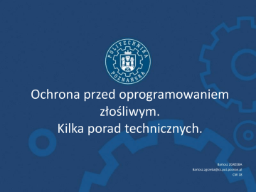 Ochrona przed oprogramowaniem złośliwym. Kilka porad technicznych. Bartosz ZGRZEBA [email protected] CW 18 Na co zwrócić uwagę • • • • • • • • Antywirus Firewall Oprogramowanie przed spamem Wtyczki/pluginy w przeglądarkach Msconfig Procesy Cmd Hijack > Hijackthis > Analysis Na co zwrócić uwagę c.d. • Aktualizacje softu / Windows Update • Obowiązkowo Aktualne Przeglądarki • ComboFiX - must have! – > Jak uzyć poniżej: http://www.bleepingcomputer.com/combofix/pl/instr ukcja-uzycia-combofix • Darmowe oprogramowanie wcale nienajgorsze (ComodoAntywirus, Avira Free Antyvirus 2014 • Rj45 / WiFi OFF !!! • Zmień dysk! Na co zwrócić uwagę c.d. • c:\users\WA.NAZWA UZYTKOWNIKA\AppData\local\Temp • C:\windows\temp • C lub D:\System Volume Information\ • Przywracanie systemu (Utwórz punkt przywracania) • Wireshark!! Dziękuję ?