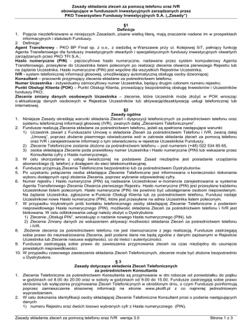 Zasady składania zleceń za pomocą telefonu oraz IVR obowiązujące w funduszach inwestycyjnych zarządzanych przez PKO Towarzystwo Funduszy Inwestycyjnych S.A. („Zasady”) §1 Definicje 1. Pojęcia niezdefiniowane w niniejszych Zasadach, pisane wielką literą, mają znaczenie nadane im w prospektach informacyjnych i statutach Funduszy. 2. Definicje: Agent Transferowy - PKO BP Finat sp. z o.o., z siedzibą w Warszawie przy ul. Kolejowej 5/7, pełniący funkcję Agenta Transferowego dla funduszy inwestycyjnych otwartych i specjalistycznych funduszy inwestycyjnych otwartych zarządzanych przez PKO TFI S.A.; Hasło numeryczne (PIN) - pięciocyfrowe hasło numeryczne, nadawane przez system komputerowy Agenta Transferowego, przesyłane do Uczestnika listem poleconym po realizacji zlecenia otwarcia pierwszego Rejestru lub na żądanie Uczestnika. Hasło numeryczne (PIN) jest wspólne dla wszystkich Rejestrów Uczestnika; IVR - system telefonicznej informacji głosowej, umożliwiający automatyczną obsługę osoby dzwoniącej; Konsultant – pracownik przyjmujący zlecenia składane za pośrednictwem telefonu; Numer Uczestnika - indywidualny ośmiocyfrowy numer Uczestnika, będący drugim członem numeru rejestru; Punkt Obsługi Klienta (POK) – Punkt Obsługi Klienta, prowadzący bezpośrednią obsługę Inwestorów i Uczestników funduszy PKO; Zlecenie zmiany danych osobowych Uczestnika – zlecenie, które Uczestnik może złożyć w POK wnosząc o aktualizację danych osobowych w Rejestrze Uczestników lub aktywację/dezaktywację usługi telefonicznej lub internetowej. §2 Zasady ogólne 1. Niniejsze Zasady określają warunki składania Zleceń i dyspozycji telefonicznych za pośrednictwem telefonu oraz systemu telefonicznej informacji głosowej (IVR), zwanych dalej „Zleceniami Telefonicznymi”. 2. Fundusze realizują Zlecenia składane za pośrednictwem telefonu, jeżeli są spełnione następujące warunki: 1) Uczestnik zawarł z Funduszami Umowę o składanie Zleceń za pośrednictwem Telefonu i IVR, zwaną dalej „Umową”, poprzez złożenie pisemnego oświadczenia woli w zakresie składania zleceń za pomocą telefonu oraz IVR i zarejestrowanie informacji o tym oświadczeniu w rejestrze Uczestników Funduszy, 2) Zlecenie Telefoniczne zostanie złożone za pośrednictwem telefonu – pod numerem (+48) 022 534 85 65, 3) osoba składająca Zlecenie poda prawidłowy numer Uczestnika i Hasło numeryczne (PIN) lub wskazane przez Konsultanta cyfry z Hasła numerycznego, 3. W celu skorzystania z usługi świadczonej na podstawie Zasad niezbędne jest posiadanie urządzenia abonenckiego (tj. telefon) z dostępem do sieci telekomunikacyjnej. 4. Fundusze przyjmują Zlecenia Telefoniczne bezpośrednio lub za pośrednictwem Dystrybutorów. 5. Po uzyskaniu połączenia osoba składająca Zlecenie Telefoniczne jest informowana o konieczności dokonania wyboru dostępnych opcji złożenia Zlecenia, poprzez wybranie odpowiedniej cyfry. 6. Numer rejestru i Hasło numeryczne (PIN) są nadawane Uczestnikowi w momencie zarejestrowania w systemie Agenta Transferowego Zlecenia Otwarcia pierwszego Rejestru. Hasło numeryczne (PIN) jest przesyłane każdemu Uczestnikowi listem poleconym. Hasło numeryczne (PIN) nie powinno być udostępniane osobom niepowołanym. Na żądanie Uczestnika, zgłoszone w Punkcie Obsługi Klienta lub za pośrednictwem telefonu, Fundusz nadaje Uczestnikowi nowe Hasło numeryczne (PIN), które jest przesyłane na adres Uczestnika listem poleconym. 7. W przypadku trzykrotnych prób kontaktu telefonicznego osoby składającej Zlecenie Telefoniczne z podaniem nieprawidłowego Hasła numerycznego (PIN), możliwość składania Zleceń za pośrednictwem telefonu i IVR jest blokowana. W celu odblokowania usługi należy złożyć u Dystrybutora: 1) Zlecenie „Obsługi PIN”, wnioskując o nadanie nowego Hasła numerycznego (PIN), lub 2) Zlecenie Zmiany danych ze wskazaniem aktywacji możliwości składania Zleceń za pośrednictwem telefonu i IVR. 8. Złożenie zlecenia za pośrednictwem telefonu nie jest równoznaczne z jego realizacją. Fundusze zastrzegają sobie prawo do niezrealizowania Zlecenia, jeśli podane dane nie będą zgodne z danymi zapisanymi w Rejestrze Uczestnika lub Zlecenie nasuwa wątpliwości, co do treści i autentyczności. 9. Fundusze zastrzegają sobie prawo do zawieszenia przyjmowania zleceń na czas niezbędny do usunięcia powstałych nieprawidłowości. 10. W przypadku czasowego zawieszenia składania Zleceń Telefonicznych, zlecenie może być złożone bezpośrednio u Dystrybutora. §3 Zasady dotyczące składania Zleceń Telefonicznych za pośrednictwem Konsultanta 1. Zlecenia Telefoniczne za pośrednictwem Konsultanta są przyjmowane w dni robocze od poniedziałku do piątku w godzinach od 8.00 do 20.00 oraz w soboty w godzinach od 9.00 do 15.00. Fundusze zastrzegają sobie prawo skrócenia lub wyłączenia przyjmowania Zleceń Telefonicznych w określonym dniu, o czym Fundusze poinformują poprzez zamieszczenie stosownej informacji na stronie www.pkotfi.pl z co najmniej jednodniowym wyprzedzeniem. 2. W celu dokonania identyfikacji osoby składającej Zlecenie Telefoniczne Konsultant prosi o podanie następujących danych: 1) numeru Rejestru oraz dwóch losowo wybranych cyfr z Hasła numerycznego (PIN), Zasady składania zleceń za pomocą telefonu oraz IVR wersja 3.0 Strona 1 z 3 3. 4. 5. 6. 7. 8. 9. 10. 1. 2. 3. 4. 5. 6. 2) imienia i nazwiska lub nazwy (firmy) Uczestnika, 3) danych osoby składającej Zlecenie: a) imienia, b) nazwiska. W przypadku wątpliwości co do treści składanego Zlecenia lub uprawnień osoby składającej zlecenie, Konsultant może zapytać dodatkowo o inne dane zaewidencjonowane w Rejestrze. Za pomocą telefonu można składać następujące zlecenia: 1) Otwarcia kolejnego Rejestru w produkcie podstawowym, 2) Odkupienia (wyłącznie na wskazany w pisemnej dyspozycji rachunek bankowy), 3) Konwersji, 4) Transferu,