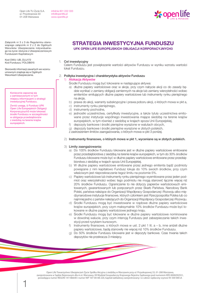 Open Life TU Życie S.A. ul. Przyokopowa 33 01-208 Warszawa infolinia 801 222 333 [email protected] www.openlife.pl Załącznik nr 3 z 3 do Regulaminu stanowiącego załącznik nr 2 z 2 do Ogólnych Warunków Ubezpieczenia indywidualnego na życie i dożycie z Ubezpieczeniowym Funduszem Kapitałowym Kod OWU: UB_OLIJ172 Kod Funduszu: FOLOB015 Skorowidz informacji zawartych we wzorcu umownym znajduje się w Ogólnych Warunkach Ubezpieczenia. Koniecznie zapoznaj się z zamieszczonymi w tym miejscu informacjami o strategii inwestycyjnej Funduszu. Zwróć uwagę, iż Fundusz UFK Open Life Europejskich Obligacji Korporacyjnych3 może lokować środki Funduszu w szczególności w obligacje przedsiębiorstw z siedzibą na terenie krajów europejskich. STRATEGIA INWESTYCYJNA FUNDUSZU UFK OPEN LIFE EUROPEJSKICH OBLIGACJI KORPORACYJNYCH3 1. Cel inwestycyjny Celem Funduszu jest powiększanie wartości aktywów Funduszu w wyniku wzrostu wartości lokat Funduszu. 2. Polityka inwestycyjna i charakterystyka aktywów Funduszu 1) Alokacja Aktywów Środki Funduszu mogą być lokowane w następujące aktywa: a) dłużne papiery wartościowe oraz w akcje, przy czym nabycie akcji co do zasady będzie wynikać z zamiany obligacji zamiennych na akcje lub zamiany wierzytelności wobec emitentów emitujących dłużne papiery wartościowe lub instrumenty rynku pieniężnego na akcje, b) prawa do akcji, warranty subskrypcyjne i prawa poboru akcji, o których mowa w pkt a, c) instrumenty rynku pieniężnego, d) instrumenty pochodne, e) jednostki uczestnictwa, certyfikaty inwestycyjne, a także tytuły uczestnictwa emitowane przez instytucje wspólnego inwestowania mające siedzibę na terenie krajów europejskich, w tym również z siedzibą w krajach spoza Unii Europejskiej, f) depozyty bankowe i środki pieniężne wyrażone w walutach obcych, g) depozyty bankowe i środki pieniężne wyrażone w złotych polskich, z zastrzeżeniem limitów zaangażowania, o których mowa w pkt 3 poniżej. 2) Instrumenty finansowe, o których mowa w pkt 1, wyceniane są w złotych polskich. 3) Limity zaangażowania: a) Do 100% środków Funduszu lokowane jest w dłużne papiery wartościowe emitowane przez przedsiębiorstwa z siedzibą na terenie krajów europejskich, w tym do 30% środków Funduszu lokowane może być w dłużne papiery wartościowe emitowane przez przedsiębiorstwa z siedzibą w krajach spoza Unii Europejskiej. b) W dłużne papiery wartościowe emitowane przez jednego emitenta bądź podmioty powiązane z nim kapitałowo Fundusz lokuje do 10% swoich środków, przy czym właściwym jest nieprzekraczanie tegoż limitu na poziomie 5%. c) Papiery wartościowe lub instrumenty rynku pieniężnego wyemitowane przez jeden podmiot oraz wierzytelności wobec tego podmiotu nie mogą stanowić łącznie więcej niż 20% środków Funduszu. Ograniczenie to nie dotyczy papierów wartościowych emitowanych, gwarantowanych lub poręczanych przez Skarb Państwa, Narodowy Bank Polski, państwa należące do Organizacji Współpracy Gospodarczej i Rozwoju albo międzynarodowe instytucje finansowe, których członkiem jest Rzeczpospolita Polska lub co najmniej jedno z państw należących do Organizacji Współpracy Gospodarczej i Rozwoju. d) Środki Funduszu mogą być inwestowane w rządowe dłużne papiery wartościowe krajów europejskich, przy czym maksymalnie 10% środków Funduszu może być lokowane w dłużne papiery wartościowe jednego kraju. e) Środki Funduszu mogą być lokowane w dłużne papiery wartościowe nominowane w dowolnej walucie, przy czym intencją Funduszu jest zabezpieczanie takich inwestycji przed ryzykiem kursowym. f) Instrumenty finansowe, o których mowa w ust. 2 pkt 1 lit. a – b, inne aniżeli dłużne papiery wartościowe, będą stanowiły nie więcej niż 10% środków Funduszu. g) Do 50% środków Funduszu lokowane jest w depozyty bankowe. Czas trwania takich depozytów nie przekracza 3 miesięcy. 1 Open Life Towarzystwo Ubezpieczeń Życie Spółka Akcyjna z siedzibą w Warszawie przy ul. Przyokopowej 33, 01-208 Warszawa, zarejestrowana w Sądzie Rejonowym dla m.st. Warszawy, XII Wydział Gospodarczy Krajowego Rejestru Sądowego pod numerem KRS 0000292551, posiadająca numer REGON 141186640 i numer NIP 107-00-08-220, kapitał zakładowy zarejestrowany i w całości wpłacony wynosi 95 500 000 zł. Open Life TU Życie S.A. ul. Przyokopowa 33 01-208 Warszawa infolinia 801 222 333 [email protected] www.openlife.pl h) Środki pieniężne wyrażone zarówno w walutach obcych jednego państwa, jak również w walucie euro nie mogą stanowić więcej niż 20% środków Funduszu. i) Do 100% środków Funduszu lokowane jest w jednostki uczestnictwa, certyfikaty inwestycyjne funduszy obligacji lub tytuły uczestnictwa emitowane przez instytucje wspólnego inwestowania, o ile fundusze te większość swoich aktywów lokują w dłużne papiery wartościowe emitowane przez przedsiębiorstwa mające siedzibę na terenie krajów europejskich. Maksymalna ekspozycja na jednostki uczestnictwa, certyfikaty inwestycyjne lub tytuły uczestnictwa jednego funduszu wynosi 100% środków Funduszu. Dłużne papiery wartościowe emitowane przez przedsiębiorstwa z siedzibą na terenie krajów europejskich, o których mowa w lit. a, to obligacje wyemitowane przez przedsiębiorstwa (emitent). Obligacje są papierem wartościowym nabywanym do Funduszu, z którym wiąże się zobowiązanie emitenta do wypłaty okresowych kuponów oraz wykupu („spłaty”) obligacji w terminie zapadalności (tj. w umówionym terminie). Obligacje korporacyjne charakteryzują się występowaniem ryzyka stopy procentowej (tj. ich wartość zmienia się wraz ze zmianami stóp procentowych) oraz ryzykiem kredytowym, tj. ryzkiem wypłacalności emitenta (brakiem możliwości „spłaty obligacji” bądź wypłaty kuponów przez emitenta) większym niż w przypadku obligacji emitowanych przez rządy. Fundusz może lokować swoje aktywa bezp
