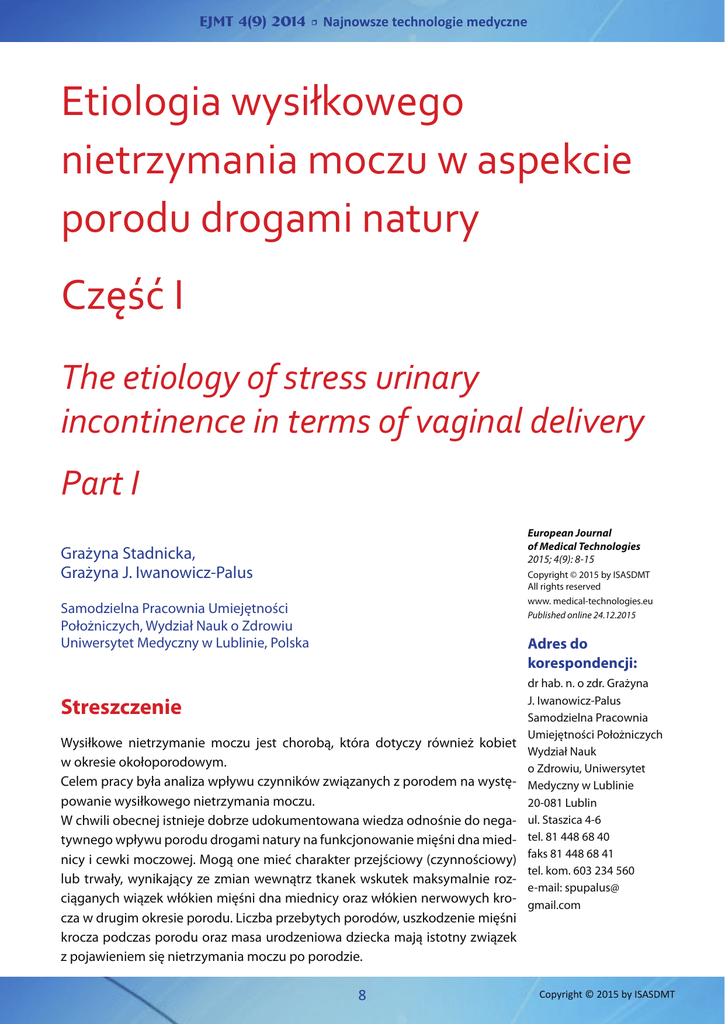 EJMT 4(9) 2014 • Najnowsze technologie medyczne Etiologia wysiłkowego nietrzymania moczu w aspekcie porodu drogami natury Część I The etiology of stress urinary incontinence in terms of vaginal delivery Part I European Journal of Medical Technologies 2015; 4(9): 8-15 Grażyna Stadnicka, Grażyna J. Iwanowicz-Palus Copyright © 2015 by ISASDMT All rights reserved www. medical-technologies.eu Published online 24.12.2015 Samodzielna Pracownia Umiejętności Położniczych, Wydział Nauk o Zdrowiu Uniwersytet Medyczny w Lublinie, Polska Adres do korespondencji: Streszczenie Wysiłkowe nietrzymanie moczu jest chorobą, która dotyczy również kobiet w okresie okołoporodowym. Celem pracy była analiza wpływu czynników związanych z porodem na występowanie wysiłkowego nietrzymania moczu. W chwili obecnej istnieje dobrze udokumentowana wiedza odnośnie do negatywnego wpływu porodu drogami natury na funkcjonowanie mięśni dna miednicy i cewki moczowej. Mogą one mieć charakter przejściowy (czynnościowy) lub trwały, wynikający ze zmian wewnątrz tkanek wskutek maksymalnie rozciąganych wiązek włókien mięśni dna miednicy oraz włókien nerwowych krocza w drugim okresie porodu. Liczba przebytych porodów, uszkodzenie mięśni krocza podczas porodu oraz masa urodzeniowa dziecka mają istotny związek z pojawieniem się nietrzymania moczu po porodzie. 8 dr hab. n. o zdr. Grażyna J. Iwanowicz-Palus Samodzielna Pracownia Umiejętności Położniczych Wydział Nauk o Zdrowiu, Uniwersytet Medyczny w Lublinie 20-081 Lublin ul. Staszica 4-6 tel. 81 448 68 40 faks 81 448 68 41 tel. kom. 603 234 560 e-mail: spupalus@ gmail.com Copyright © 2015 by ISASDMT EJMT 4(9) 2014 • Najnowsze technologie medyczne Na podstawie przeglądu piśmiennictwa można wnioskować, że nietrzymanie Słowa moczu jest konsekwencją dysfunkcji mięśni dna miednicy. Eliminacja modykluczowe: fikowalnych czynników ryzyka nietrzymania moczu oraz trening mięśni dna miednicy powinny być stałym elementem edukacji kobiet w zakresie profilak- poród, wysiłkowe tyki tego schorzenia. nietrzymanie moczu Abstract Stress urinary incontinence is a common disease among women in the perinatal period. The aim of this study was to analyze the influence of factors related to the incidence of birth for stress urinary incontinence. At present, there exists well-documented knowledge as to the negative influence of the vaginal delivery on the functioning of the pelvic floor muscles and the urethra. Labour cause numerous changes in a woman's organism. These changes might be of a temporary nature (functional) or permanent resulting from the changes within the tissues due to the maximal stretching of the pelvic floor myocytes and the perineal axons in the second stage of labour. The number of experienced labours, perineum damaged during labour and infant’s body mass proved to be the factor influencing the occurrence of incontinence after labour. On the basis of the selected bibliography and personal research, it can be con- Key words: cluded that incontinence, as a dysfunction of the deep perineal pouch. The elimination of modifiable risk factors of urinary incontinence and pelvic floor parturition, stress muscles training should be a regular part of women’s education on the preven- urinary incontinence tion of this disease. Wprowadzenie Europy, Ameryki Północnej, Azji, Australii i Afryki. Częstość występowanie nietrzymania moczu w analizowanej grupie kobiet wynosiła średnio 27,6% [5]. Jednak rzeczywiste rozpowszechnienie choroby wydaje się być większe, niż wskazują na to dane epidemiologiczne. Wynika to z faktu, iż znaczna część kobiet ukrywa objawy, traktując je jako problem „wstydliwy”. Ponad 70% kobiet zgłasza dolegliwości lekarzowi w momencie znacznego ich nasilenia [6]. Z badań Seim i wsp. [7] wynika, że blisko połowa (49%) pacjentek z nietrzymaniem moczu, zgłaszających się do lekarza cierpiała na inkontynencję dłużej niż 5 lat. Nietrzymanie moczu jest uznawane przez Światową Organizację Zdrowia za jeden z poważnych problemów zdrowotnych współczesnego społeczeństwa [2]. Niepokojący jest fakt, iż wysiłkowe nietrzymanie moczu występuje wśród dużej grupy kobiet w okresie okołoporodowym. Wysiłkowe nietrzymanie moczu definiowane jest jako bezwiedne oddawanie moczu podczas wysiłku, kichania lub kaszlu w chwili, gdy ciśnienie śródpęcherzowe przekracza maksymalne ciśnienie cewkowe [1]. Stan ten powoduje problem natury socjalnej i higienicznej, wpływając jednocześnie na jakość życia kobiet [1,2]. Według Międzynarodowego Towarzystwa ds. Kontynencji (ang. International Continence Society – ICS) około 25% kobiet w wieku 30–49 lat i ponad 30% kobiet w okresie menopauzy ma trudności z utrzymaniem moczu podczas wysiłku [2], zaś w okresie okołoporodowym z powodu nietrzymania moczu cierpi od 15 do nawet 30% kobiet [3,4]. Minassiana i wsp. zestawili dane z bazy MEDLINE pochodzące z 35 różnych analiz obejmujących 230 tysięcy kobiet. Dotyczyły one pięciu kontynentów: 9 Copyright © 2015 by ISASDMT EJMT 4(9) 2014 • Najnowsze technologie medyczne Celem pracy była analiza wpływu czynników związanych z porodem na występowanie wysiłkowego nietrzymania moczu. Etiopatogeneza wysiłkowego nietrzymania moczu By skutecznie zapobiegać i/lub leczyć chorobę, należy znać jej etiopatogenezę. Patogeneza wysiłkowego nietrzymania moczu była i jest przedmiotem licznych badań i kontrowersji [8,9,10]. Przeprowadzone w latach sześćdziesiątych próby wyjaśnienia mechanizmów powodujących wysiłkowe nietrzymanie moczu u kobiet stały się podstawą do sformułowania przez Enhorninga teorii zakładającej, że ciśnienie śródbrzuszne przenoszone jest w sposób mechaniczny i bezpośredni na szyję pęcherza i bliższy odcinek cewki moczowej (położony wewnątrzbrzusznie). Według Enhorninga [11] urazy mechaniczne spowodowane przez porody, przewlekły kasz