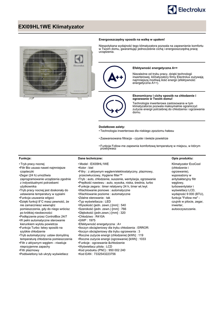 EXI09HL1WE Klimatyzator Energooszczędny sposób na walkę w upałem! Niespotykana wydajność tego klimatyzatora pozwala na zapewnienie komfortu w Twoim domu, gwarantując jednocześnie cichą i energooszczędną pracę urządzenia. Efektywność energetyczna A++ Niezależne od trybu pracy, dzięki technologii inwerterowej, klimatyzatory firmy Electrolux zużywają najmniejszą możliwą ilość energii (efektywność energetyczna A++). Ekonomiczny i cichy sposób na chłodzenie i ogrzewanie w Twoim domu! Technologia inwerterowa zastosowana w tym klimatyzatorze pozwala maksymalnie ograniczyć zużycie energii potrzebnej do chłodzenia i ogrzewania domu. Dodatkowe zalety: • Technologia inwerterowa dla niskiego zpoziomu hałasu • Zaawansowana filtracja - czyste i świeże powietrze • Funkcja Follow-me zapewnia komfortową temperaturę w miejscu, w którym przebywasz Funkcje: Dane techniczne: Opis produktu: • Tryb pracy nocnej •Filtr Bio usuwa nawet najmniejsze cząsteczki •Zegar (24 h) umożliwia zaprogramowanie urządzenia zgodnie z indywidualnymi potrzebami użytkownika •Tryb pracy nocnej jest doskonały do ustawiania temperatury w sypialni •Funkcja usuwania wilgoci •Dzięki funkcji 8°C masz pewność, że nie zamarzniesz wewnątrz pomieszczenia, gdy do niego wrócisz po krótkiej nieobecności •Podłączenie przez ControlBox 24/7 •W pełni automatyczne sterowanie kierunkiem wylotu powietrza •Funkcja Turbo: łatwy sposób na szybkie chłodzenie •Tryb automatyczny: ustaw domyślną temperaturę chłodzenia pomieszczenia •Filtr z aktywnym węglem - niweluje nieprzyjemne zapachy •Filtr plazmowy •Podświetlony lub ukryty wyświetlacz • Model : EXI09HL1WE •Kolor : biel •Filtry : z aktywnym węglem/elektrostatyczny, plazmowy, przeciwkurzowy, Hygiene filter™ •Tryb : auto, chłodzenie, suszenie, wentylacja, ogrzewanie •Prędkość nawiewu : auto, wysoka, niska, średnia, turbo •Funkcje zegara : timer relatywny 24 h, timer wł./wył. •Wachlowanie pionowe : automatyczne •Wachlowanie poziome : automatyczne •Zdalne sterowanie : tak •Typ wyświetlacza : LED •Wysokość (jedn. zewn.) [mm] : 540 •Szerokość (jedn. zewn.) [mm] : 766 •Głębokość (jedn.zewn.) [mm] : 320 •Chłodziwo : R410A •GWP : 1975 •Efektywność energetyczna : A+ •Iloczyn obciążeniowy dla trybu chłodzenia : ERROR: •Iloczyn obciążeniowy dla trybu ogrzewania : 3 •Roczne zużycie energii (chłodzenie) [kWh] : 119 •Roczne zużycie energii (ogrzewanie) [kWh] : 1033 •Funkcje : ogrzewanie &chłodzenie •Wyświetlacz pilota : LCD •Kod produktu (PNC) : 950 002 240 •Kod EAN : 7332543223756 Klimatyzator EcoCool (chłodzenie i ogrzewanie), wyposażony w antybakteryjny filtr węglowy, turbowentylator i wyświetlacz LCD, wydajność 9 000 (BTU), funkcja "Follow me" czujnik w pilocie, zegar, inwerter, autooczyszczanie.