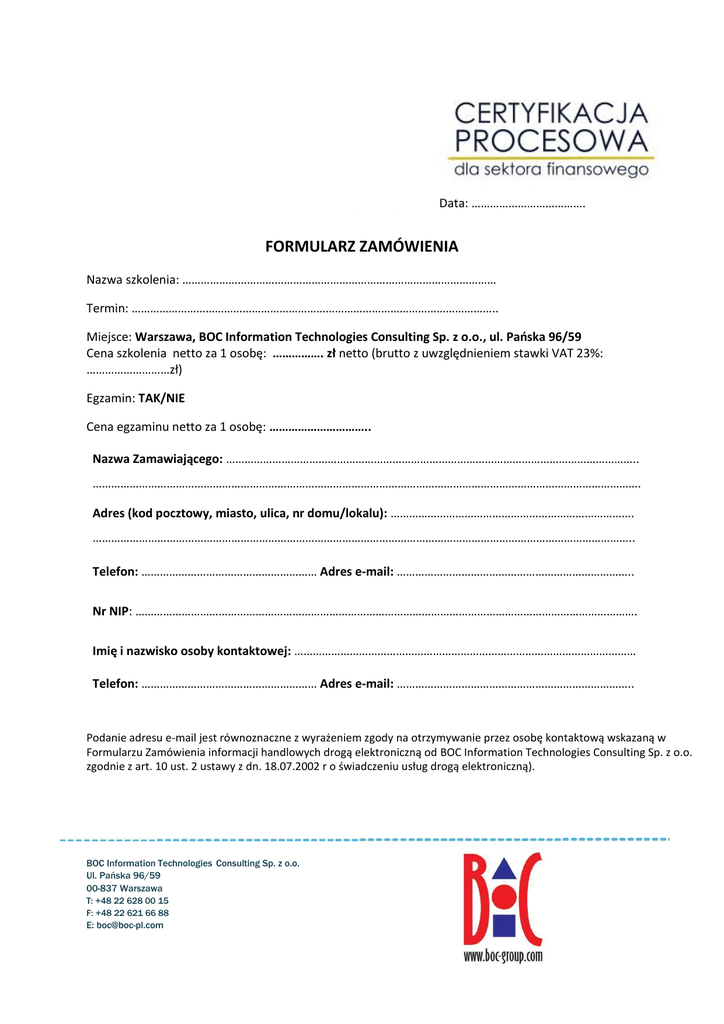 Data: ………………………………. FORMULARZ ZAMÓWIENIA Nazwa szkolenia: ………………………………………………………………………………………… Termin: ……………………………………………………………………………………………………….. Miejsce: Warszawa, BOC Information Technologies Consulting Sp. z o.o., ul. Pańska 96/59 Cena szkolenia netto za 1 osobę: ……………. zł netto (brutto z uwzględnieniem stawki VAT 23%: ………………………zł) Egzamin: TAK/NIE Cena egzaminu netto za 1 osobę: ………………………….. Nazwa Zamawiającego: …………………………………………………………………………………………………………………….. ……………………………………………………………………………………………………………………………………………………………. Adres (kod pocztowy, miasto, ulica, nr domu/lokalu): ……………………………………………………………………. ………………………………………………………………………………………………………………………………………………………….. Telefon: ………………………………………………… Adres e-mail: ………………………………………………………………….. Nr NIP: ………………………………………………………………………………………………………………………………………………. Imię i nazwisko osoby kontaktowej: ………………………………………………………………………………………………… Telefon: ………………………………………………… Adres e-mail: ………………………………………………………………….. Podanie adresu e-mail jest równoznaczne z wyrażeniem zgody na otrzymywanie przez osobę kontaktową wskazaną w Formularzu Zamówienia informacji handlowych drogą elektroniczną od BOC Information Technologies Consulting Sp. z o.o. zgodnie z art. 10 ust. 2 ustawy z dn. 18.07.2002 r o świadczeniu usług drogą elektroniczną). BOC Information Technologies Consulting Sp. z o.o. Ul. Pańska 96/59 00-837 Warszawa T: +48 22 628 00 15 F: +48 22 621 66 88 E: [email protected] Liczba uczestników (Słuchaczy) szkolenia: ……………………………………………………………………………… LP 1 2 3 4 Imię i nazwisko Słuchacza Adres e-mail OŚWIADCZENIE ZAMAWIAJĄCEGO Działając w imieniu i na rzecz Zamawiającego oświadczam, iż akceptuję warunki finansowe i organizacyjne oferowanych szkoleń bez zastrzeżeń oraz akceptuję zapisy Regulaminu świadczenia usług szkoleniowych, dostępnych na stronie internetowej www.certyfikacjaprocesowa.pl. Dodatkowo zobowiązuję się do poinformowania każdego z uczestników szkolenia o konieczności zapoznania się oraz przestrzegania przepisów wymienionego Regulaminu. Warunkiem niezbędnym do zarezerwowania miejsca na szkoleniu jest podpisanie niniejszego formularza zamówienia i odesłanie go w wersji elektronicznej na adres [email protected] lub faxem na numer: +48 (22) 621 66 88. Imię i nazwisko osoby zamawiającej: …………………………………………………………………………………………………. Stanowisko: ………………………………………………………………………………………………………………………………………… Data: ……………………………………………………………….. Podpis: …………………………………………………………………… Dane osobowe podane w niniejszym formularzu będą przetwarzane przez BOC Information Technologies Consulting Sp. z o.o. oraz BOC Information Technologies Consulting Sp. z o.o. dla celów organizacji i przeprowadzania szkoleń (na podstawie Art. 23 ust. 1 punkt 3 ustawy z dn. 29.08.1997 r. o ochronie danych osobowych). BOC Information Technologies Consulting Sp. z o.o. Ul. Pańska 96/59 00-837 Warszawa T: +48 22 628 00 15 F: +48 22 621 66 88 E: [email protected]