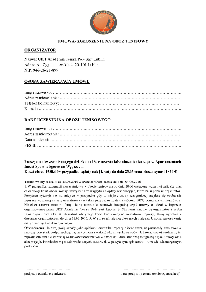 UMOWA- ZGŁOSZENIE NA OBÓZ TENISOWY ORGANIZATOR Nazwa: UKT Akademia Tenisa Pol- Sart Lublin Adres: Al. Zygmuntowskie 4, 20-101 Lublin NIP: 946-26-21-899 OSOBA ZAWIERAJĄCA UMOWĘ Imię i nazwisko: ………………………………………………………………………………... Adres zamieszkania: …………………………………………………………………………… Telefon kontaktowy: …………………………………………………………………………… E- mail: …………………………………………………………………………………………. DANE UCZESTNIKA OBOZU TENISOWEGO Imię i nazwisko: ………………………………………………………………………………... Adres zamieszkania: …………………………………………………………………………… Data urodzenia: ………………………………………………………………………………… PESEL: …………………………………………………………………………………………. Proszę o umieszczenie mojego dziecka na liście uczestników obozu tenisowego w Apartamentach Incest Sport w Egerze na Węgrzech. Koszt obozu 1980zł (w przypadku wpłaty całej kwoty do dnia 25.05 cena obozu wynosi 1890zł) Termin wp łaty zaliczki: do 25.05.2016 w kwocie: 400zł, całość do dnia: 04.06.2016. 1. W przypadku rezygnacji z uczestnictwa w obozie tenisowym po dniu 20.06 wp łacona wcześniej zalic zka oraz całościowy koszt obozu zostaje zatrzy mana ze względu na opłaty rezerwacy jne, które musi ponieść organizator. Powyższa sytuacja nie ma miejsca w przypadku gdy w miejsce osoby rezygnującej znajd zie się osoba nie zapisana wcześniej na listę uczestników- w takim przypadku zostaje zwrócone 100% poniesionych kosztów. 2. Nin iejsza u mowa wraz z ofertą i kartą uczestnika stanowią integralną część umowy o udział w imp rezie organizowanej przez UKT Akademia Tenisa Pol- Sart Lublin. 3. Stronami umo wy są organizator i osoba zgłaszająca uczestnika. 4. Uczestnik otrzy muje kartę kwalifikacy jną uczestnika imprezy, którą wypełnia i dostarcza organizatorowi do dnia 01.06.2016. 5. W sprawach nieuregulowanych niniejszą Umową zastosowanie mają przep isy Kodeksu cywilnego. Oświ adczenie: Ja niżej podpisana/y, jako opiekun uczestnika imprezy oświadczam, że przez cały czas trwania imprezy uczestnik podporządku je się zalecenio m i wskazówko m wychowawców. Jednocześnie oświadczam, że zapoznałem/ łam się z t reścią warunków uczestnictwa w imp rezie, które stanowią integralną część u mowy oraz akceptuje je. Potwierd zam prawdziwość danych zawartych w powyższy m zgłoszeniu – u mowie własnoręcznym podpisem. …………………………………. podpis, pieczątka organizatora ……………………………………………. data, podpis opiekuna (osoby zgła szającej)