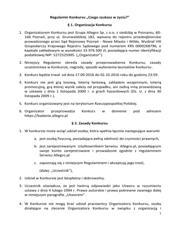 Regulamin Konkursu „Czego szukasz w życiu?” § 1. Organizacja Konkursu 1. Organizatorem Konkursu jest Grupa Allegro Sp. z o.o. z siedzibą w Poznaniu, 60166 Poznań, przy ul. Grunwaldzkiej 182, wpisana do rejestru przedsiębiorców prowadzonego przez Sąd Rejonowy Poznań - Nowe Miasto i Wilda, Wydział VIII Gospodarczy Krajowego Rejestru Sądowego pod numerem KRS 0000268796, o kapitale zakładowym w wysokości 33 976 500 zł, posiadająca numer identyfikacji podatkowej NIP: 5272525995. („Organizator”). 2. Niniejszy Regulamin określa zasady przeprowadzenia Konkursu, zasady uczestnictwa w Konkursie, nagrody, sposób wyłonienia laureatów Konkursu . 3. Konkurs będzie trwał od dnia 17.09.2016 do 02.10.2016 roku do godziny 23:59. 4. Konkurs nie jest grą losową, loterią fantową, zakładem wzajemnym, loterią promocyjną, grą której wynik zależy od przypadku, ani żadną inną przewidzianą w ustawie z dnia 1 listopada 2000 r. o grach hazardowych (Dz. U. z dnia 30 listopada 2009 r.). 5. Konkurs organizowany jest na terytorium Rzeczypospolitej Polskiej. 6. Organizator przeprowadza https://badanie.allegro.pl Konkurs w domenie pod adresem § 2. Zasady Konkursu 1. W konkursie może wziąć udział osoba, która spełnia łącznie następujące warunki a. jest osobą fizyczną, posiadająca pełną zdolność do czynności prawnych, b. jest zarejestrowanym Użytkownikiem Serwisu Allegro.pl, posiadającym swoje konto zarejestrowane i prowadzone zgodnie z regulaminem Serwisu Allegro.pl c. zapoznają się z niniejszym Regulaminem i akceptują jego treść, (dalej: „Uczestnik”), 2. Udział w Konkursie jest bezpłatny i dobrowolny. 3. Uczestnik oświadcza, że jest twórcą odpowiedzi jako Utworu w rozumieniu ustawy z dnia 4 lutego 1994 r. Prawo autorskie i prawa pokrewne zwanego dalej w niniejszym paragrafie „Utworem”. 4. W Konkursie nie mogą brać udział pracownicy Organizatora Konkursu, osoby działające na zlecenie Organizatora Konkursu w związku z organizacją i 1 przeprowadzeniem Konkursu, a także najbliżsi członkowie rodzin wszystkich wymienionych wcześniej osób, za jakich uważa się wstępnych, zstępnych , rodzeństwo, małżonków i osoby pozostające w stosunku przysposobienia, a także osoby pozostające w związkach partnerskich. 5. Organizator zastrzega sobie prawo do weryfikacji oraz usunięcia Uczestników biorących udział w Konkursie, których działania są niezgodnie z niniejszym Regulaminem. 6. Nad prawidłowym przebiegiem Konkursu czuwać będą przedstawiciele Organizatora ( dalej: „Komisja Konkursowa”). § 3. Przebieg Konkursu 1. Aby wziąć udział w Konkursie należy dokonać czynności, o których mowa w par. 2 ust. 1 pkt. b, c oraz odpowiedzieć na pytanie konkursowe: „Czego szukasz w życiu?” zamieszczone jako ostatnie w ankiecie pod adresem: https://badanie.allegro.pl (dalej „Pytanie Konkursowe”). 2. Uczestnik może wypełnić kwestionariusz ankietowy i odpowiedzieć na Pytanie Konkursowe tylko raz. 3. Nagrody dodatkowe otrzymają ̨ osoby, które w ocenie Komisji Konkursowej ciekawie, kreatywnie i oryginalnie odpowiedzą na Pytanie Konkursowe. 4. Zwycięzcą Konkursu zostaje Uczestnik, który w ocenie Komisji Konkursowej w sposób najbardziej kreatywny i oryginalny udzielił odpowiedzi na Pytanie Konkursowe. 5. Wybór zwycięzcy Konkursu, któremu przyznana zostanie nagroda główna oraz wyboru pozostałych laureatów Konkursu, którym zostaną przyznane nagrody dodatkowe, dokonany zostanie w siedzibie Organizatora w dniu 2 października 2016 roku. 6. Organizator zastrzega sobie prawo do nieoceniania odpowiedzi na Pytanie Konkursowe zawierających wulgaryzmy, treści obraźliwe, godzących w dobre imię Organizatora lub osób trzecich, pornografię, przemoc i treści drastyczne. 7. O przyznanej nagrodzie każdy z laureatów Konkursu zostanie niezwłocznie powiadomiony drogą elektroniczną na adres e-mail aktualnie widniejący w ustawieniach jego konta na Allegro. § 4. Nagrody 1. Nagrodami w Konkursie są: 2 a) nagroda główna kupon na zakupy w ramach Platformy handlowej Allegro.pl o wartości 500,00 zł (pięćset złotych). b) nagroda dodatkowa - kupon na zakupy w ramach Platformy handlowej Allegro.pl o wartości 20,00 zł (dwadzieścia złotych). 2. Nagroda nie może być wymieniona na inną lub na jej równowartość pieniężną. 3. Organizator nie ma wpływu na niemożność odbioru nagrody z przyczyn od niego niezależnych i leżących po stronie Uczestników, w związku z tym nie ponosi odpowiedzialności za nieprawidłowości, wynikające z błędnego podania przez uczestnika adresu e-mail lub innych danych, koniecznych do przekazania Nagrody. 4. W przypadku niewykorzystania przez Uczestnika nagrody, przedmiotowa nagroda przepada. § 5. Postępowanie reklamacyjne 1. Reklamacje dotyczące przebiegu Konkursu, w formie zgłoszenia reklamacyjnego, mogą ̨ być zgłaszane najpóźniej w terminie 7 dni od dnia publikacji zakończenia Konkursu tj. do dnia 9 października 2016 roku. 2. Reklamacje należy zgłaszać w formie pisemnej listem poleconym na adres: Grupa Allegro Sp. z o.o., ul. Grunwaldzka 182, 61-166 Poznań z dopiskiem „Reklamacja – Konkurs Czego szukasz w życiu?” 3. Zgłoszenie reklamacji powinno zawierać dokładne dane Reklamującego, a także wskazanie podstaw reklamacji wraz z uzasadnieniem. 4. Przedmiotem ani podstawą reklamacji nie może być podjęta przez Komisję decyzja co do wyboru zwycięzców Konkursu. 5. Reklamacje rozpatruje Komisja Konkursowa w ciągu 3 dni od dnia otrzymania przez Organizatora zgłoszenia reklamacyjnego, o którym mowa w ust. 1 niniejszego paragrafu. 6. O wyniku reklamacji reklamujący zostanie powiadomiony drogą elektroniczną. 7. Po w czerpaniu postępowania, określonego w niniejszym paragrafie, wszelkie spory mogą być rozpatrywane wyłącznie na drodze postępowania sądowego. § 6. Postanowienia końcowe 1. Organizator nie pobiera żadnych podatków w zwi