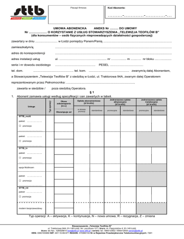Pieczęć firmowa Telewizja Internet Kod Abonenta: ………-…………-…………-… Członkostwo UMOWA ABONENCKA ANEKS Nr .......... DO UMOWY Nr ..................... O KORZYSTANIE Z USŁUG STOWARZYSZENIA „TELEWIZJA TEOFILÓW B” (dla konsumentów – osób fizycznych nieprowadzących działalności gospodarczej) zawarta/y w dniu .......................... w Łodzi pomiędzy Panem/Panią ................................................................................ zamieszkałym/ą ........................................................................................................................................ adres do korespondencji ........................................................................................................................................ adres instalacji usług ul. …………………………….…........... nr ………....... m …...….. nr bloku ....…............ seria i nr dowodu osobistego ............................................... tel. dom. PESEL ....................................... ............................................... tel. kom. ............................................... zwanym/ą dalej Abonentem, a Stowarzyszeniem „Telewizja Teofilów B” z siedzibą w Łodzi, ul. Traktorowa 94A, zwanym dalej Operatorem reprezentowanym przez Pełnomocnika: ..............................................................................., poza siedzibą Operatora. zawarta w siedzibie / Usługa Typ operacji §1 1. Abonent zamawia usługi według specyfikacji i cen zawartych w tabeli. Okres zobowiązania [m-c] Obowiązuje od Opłata abonamentowa [zł brutto] w okresie promocji standardowa Jednorazowa opłata aktywacyjna [zł brutto] promocyjna standardowa Jednorazowa opłata instalacyjna [zł brutto] promocyjna standardowa STTB_multi pakiet: ......................... □ promocja ....................................... pakiet: ......................... □ promocja ....................................... STTB_tv pakiet: ......................... □ promocja ....................................... opcja Multiroom pakiet: ......................... □ promocja ....................................... STTB_int pakiet: .......................... □ promocja ....................................... modem bezprzewodowy Typ operacji: A – aktywacja, K – kontynuacja, N – nowa umowa, R – rezygnacja, Z – zmiana Stowarzyszenie „Telewizja Teofilów B” ul. Traktorowa 94A; 91-148 Łódź; skr. pocztowa 121 | biuro: Al. Pasjonistów 4; 91-140 Łódź biuro: tel./fax.: 426528814 [email protected] www.sttb.pl | serwis: tel.: 694412932 / 694412933 [email protected] KRS: 0000105990 NIP: 947-10-99-971 REGON: 470065142 Nr w Rejestrze Przedsiębiorców Telekomunikacyjnych: 7281 2. Za wykonanie wyżej wymienionych usług Abonent wniesie opłaty instalacyjne oraz aktywacyjne i zobowiązuje się do opłacania opłat abonamentowych w wysokości podanej w tabeli. 3. W celu zabezpieczenia roszczeń Operatora z tytułu niniejszej umowy / aneksu, Abonent przy jej zawieraniu: ☐ uiścił kaucję w wysokości ............. zł. / ☐ nie ma zastosowania. 4. W usłudze internetowej STTB_int terminal podłączony będzie przy pomocy ☐ karty ethernet ☐ karty WiFi. §2 Szczegółowe zasady korzystania z Pakietu usług Stowarzyszenia „Telewizja Teofilów B” określone są w „Regulaminie korzystania z usług Stowarzyszenia „Telewizja Teofilów B”” i „Cennikach” z uwzględnieniem dotychczasowych zasad zapisanych w Regulaminach Promocji, jeżeli takie występują na poszczególne Usługi. Dokumenty te dostępne są na stronie www.sttb.pl oraz w Biurze Obsługi Abonenta. W ramach opłaty abonamentowej Operator zapewnia: 1) stały dostęp do sieci Operatora, 2) możliwość korzystania z Usług przypisanych w Cenniku do danej opłaty abonamentowej, 3) obsługę serwisową, z wyłączeniem Usług serwisowych dodatkowo płatnych oraz obsługi nieuzasadnionych wezwań, 4) inne Usługi dodatkowe wskazane w Umowie, Regulaminie lub Cennikach. W zakresie nieuregulowanym w Umowie „Regulamin korzystania z usług Stowarzyszenia „Telewizja Teofilów B”” zawiera zapisy dotyczące: 1) zakresu obsługi serwisowej oraz sposobu kontaktowania się z pracownikami serwisu – dział V, §23 punkt 2, 2) sposobu składania zamówień na pakiety taryfowe oraz dodatkowe opcje usługi – dział III, §9, 3) elementów składających się na opłatę abonamentową – dział I, §2, punkty 8-9, 4) sposobu dokonywania płatności – dział VII, 5) zasadach, trybie, terminach składania i rozpatrywania reklamacji oraz o polubownych sposobach rozwiązywania sporów – dział VIII, 6) sposobie przekazywania informacji o zagrożeniach związanych ze świadczonymi Usługami, w tym o sposobach ochrony bezpieczeństwa, prywatności i danych osobowych oraz danych dotyczących funkcjonalności świadczonej Usługi obejmujących informacje o gromadzeniu danych o lokalizacji telekomunikacyjnego urządzenia końcowego, ograniczeniach w dostępie lub korzystaniu z Usług, procedurach wprowadzonych przez Operatora w celu pomiaru i organizacji ruchu w sieci, aby zapobiec osiągnięciu lub przekroczeniu pojemności łącza, wraz z informacją o ich wpływie na jakość świadczonych Usług oraz o działaniach, jakie Operator jest uprawniony podejmować w związku z przypadkami naruszenia bezpieczeństwa lub integralności Sieci i Usług – dział VI, §25a, 7) ograniczeniach w zakresie korzystania z udostępnionych Abonentowi przez Operatora urządzeń końcowych – dział IV oraz dział IX (w zakresie WiFi), 8) danych dotyczących jakości usług oraz zakresie odpowiedzialności z tytułu niewykonania lub nienależytego wykonania Umowy, wysokości odszkodowania oraz zasadach i terminie jego wypłaty w szczególności, gdy nie został osiągnięty określony w Umowie poziom jakości świadczonych Usług – dział VI, §24. Czas oczekiwania na podłączen