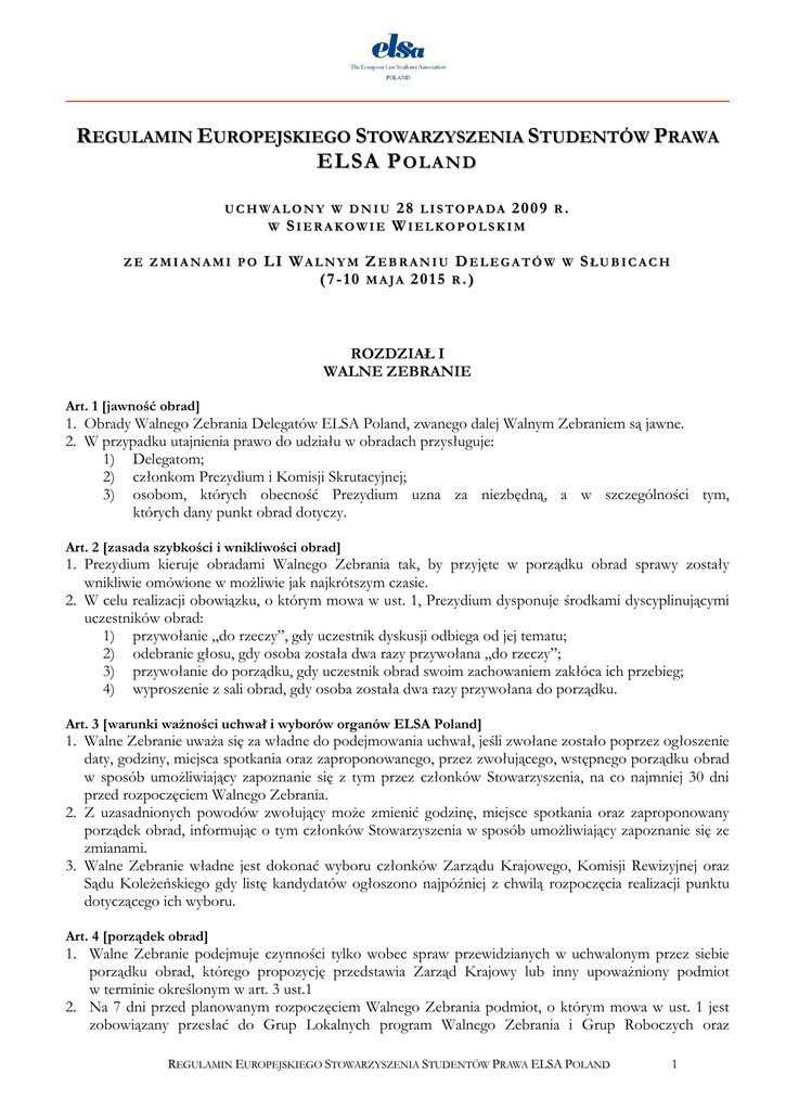 REGULAMIN EUROPEJSKIEGO STOWARZYSZENIA STUDENTÓW PRAWA ELSA POLAND U C H W A L O N Y W D N I U 2 8 L I S T O PA DA 2 0 0 9 R . W SIERAKOWIE WIELKOPOLSKIM ZE ZMIANAMI PO LI WALNYM ZEBRANIU DELEGATÓW (7-10 MAJA 201 5 R.) W SŁUBICACH ROZDZIAŁ I WALNE ZEBRANIE Art. 1 [jawność obrad] 1. Obrady Walnego Zebrania Delegatów ELSA Poland, zwanego dalej Walnym Zebraniem są jawne. 2. W przypadku utajnienia prawo do udziału w obradach przysługuje: 1) Delegatom; 2) członkom Prezydium i Komisji Skrutacyjnej; 3) osobom, których obecność Prezydium uzna za niezbędną, a w szczególności tym, których dany punkt obrad dotyczy. Art. 2 [zasada szybkości i wnikliwości obrad] 1. Prezydium kieruje obradami Walnego Zebrania tak, by przyjęte w porządku obrad sprawy zostały wnikliwie omówione w możliwie jak najkrótszym czasie. 2. W celu realizacji obowiązku, o którym mowa w ust. 1, Prezydium dysponuje środkami dyscyplinującymi uczestników obrad: 1) przywołanie „do rzeczy”, gdy uczestnik dyskusji odbiega od jej tematu; 2) odebranie głosu, gdy osoba została dwa razy przywołana „do rzeczy”; 3) przywołanie do porządku, gdy uczestnik obrad swoim zachowaniem zakłóca ich przebieg; 4) wyproszenie z sali obrad, gdy osoba została dwa razy przywołana do porządku. Art. 3 [warunki ważności uchwał i wyborów organów ELSA Poland] 1. Walne Zebranie uważa się za władne do podejmowania uchwał, jeśli zwołane zostało poprzez ogłoszenie daty, godziny, miejsca spotkania oraz zaproponowanego, przez zwołującego, wstępnego porządku obrad w sposób umożliwiający zapoznanie się z tym przez członków Stowarzyszenia, na co najmniej 30 dni przed rozpoczęciem Walnego Zebrania. 2. Z uzasadnionych powodów zwołujący może zmienić godzinę, miejsce spotkania oraz zaproponowany porządek obrad, informując o tym członków Stowarzyszenia w sposób umożliwiający zapoznanie się ze zmianami. 3. Walne Zebranie władne jest dokonać wyboru członków Zarządu Krajowego, Komisji Rewizyjnej oraz Sądu Koleżeńskiego gdy listę kandydatów ogłoszono najpóźniej z chwilą rozpoczęcia realizacji punktu dotyczącego ich wyboru. Art. 4 [porządek obrad] 1. Walne Zebranie podejmuje czynności tylko wobec spraw przewidzianych w uchwalonym przez siebie porządku obrad, którego propozycję przedstawia Zarząd Krajowy lub inny upoważniony podmiot w terminie określonym w art. 3 ust.1 2. Na 7 dni przed planowanym rozpoczęciem Walnego Zebrania podmiot, o którym mowa w ust. 1 jest zobowiązany przesłać do Grup Lokalnych program Walnego Zebrania i Grup Roboczych oraz REGULAMIN EUROPEJSKIEGO STOWARZYSZENIA STUDENTÓW PRAWA ELSA POLAND 1 materiały do dyskusji. Program uwzględniać powinien możliwości organizacyjne Grupy Lokalnej przygotowującej Walne Zebranie. Art. 5 [forma działania] Walne Zebranie Delegatów podejmuje czynności poprzez: 1) obrady plenarne; 2) obrady Grup Roboczych; 3) działalność Zespołów Roboczych. Art. 6 [obrady plenarne] Przedmiot obrad plenarnych stanowią w szczególności: 1) wybór Prezydium oraz Komisji Skrutacyjnej; 2) wybór Zarządu Krajowego, Komisji Rewizyjnej oraz Sądu Koleżeńskiego ELSA Poland; 3) rozpatrywanie projektów uchwał na podstawie rekomendacji zgłoszonych przez uprawnione podmioty; 4) uchwalanie budżetu Stowarzyszenia; 5) sprawy finansowe dotyczące wszystkich Grup Lokalnych; 6) głosowanie w przedmiocie absolutorium dla członków Zarządu Krajowego; 7) ocena działalności Stowarzyszenia; 8) kreowanie działań Stowarzyszenia. Art. 7 [prawo zorganizowania Walnego Zebrania] 1. Wiosenne Walne Zebranie wybiera organizatora kolejnego wiosennego Walnego Zebrania po zapoznaniu się z prezentacjami zainteresowanych podmiotów. 2. Jeżeli organizator wiosennego Walnego Zebrania nie zostanie wybrany w sytuacji, o której mowa w ust. 1 jesienne Walne Zebranie wybiera organizatora. 3. Do wyboru organizatora jesiennego Walnego Zebrania ust. 1 i 2 stosuje się odpowiednio. 4. Uchwałę, o której mowa w ust. 1, podejmuje się z uwzględnieniem możliwości Grup Lokalnych. 5. W sytuacji, gdy żadna Grupa Lokalna nie zgłosi się do organizacji Walnego Zebrania, Zarząd Krajowy organizuje Walne Zebranie sam albo w porozumieniu z wybraną przez siebie Grupą Lokalną. 6. Wiosenne Walne Zebranie odbywa się w kwietniu lub maju natomiast jesienne Walne Zebranie w listopadzie każdego roku. 7. Wybór miejsca i organizacja nadzwyczajnego Walnego Zebrania, o którym mowa w §21 ust. 3 zdanie 2 Statutu Europejskiego Stowarzyszenia Studentów Prawa ELSA Poland, zwanego dalej Statutem - jest obowiązkiem zwołującego. Art. 8 [rozpoczęcie Walnego Zebrania] Po sprawdzeniu kworum Sekretarz Generalny Zarządu Krajowego otwiera Walne Zebranie poprzez realizację pierwszego punktu porządku obrad. W przypadku jego nieobecności, Walne Zebranie otwiera inny członek Zarządu Krajowego. Art. 9 [zamknięcie Walnego Zebrania] Prowadzący obrady zamyka Walne Zebranie po zakończeniu realizacji ostatniego punktu porządku obrad. Art. 10 [rozwiązanie Walnego Zebrania] Prowadzący obrady zarządza rozwiązanie Walnego Zebrania, jeżeli liczba Delegatów na obradach plenarnych nie pozwala na podjęcie uchwały i jest mało prawdopodobne, by ta sytuacja mogła ulec zmianie w ciągu najbliższych 12 godzin. Art. 11 [legitymacja i obowiązki Delegatów] 1. Delegaci dostarczają na obrady plenarne wyciąg z protokołu Walnego Zebrania Grupy Lokalnej. REGULAMIN EUROPEJSKIEGO STOWARZYSZENIA STUDENTÓW PRAWA ELSA POLAND 2 2. Wyciąg, o którym mowa w ust. 1 musi zawierać w szczególności: 1) datę i miejsce obrad; 2) określenie kworum i liczby obecnych osób uprawnionych do głosowania; 3) punkt stwierdzający wybór Delegatów wraz z wynikami głosowania; 4) podpis Sekretarza Generalnego Grupy Lokalnej; 5) pieczęć Grupy Lokalnej. 3. Delegata obowiązuje obecność i czynny udział w obradach plenarnych. Art. 12 [mandaty Delegatów] 1.Sekretarz Generalny Zarząd