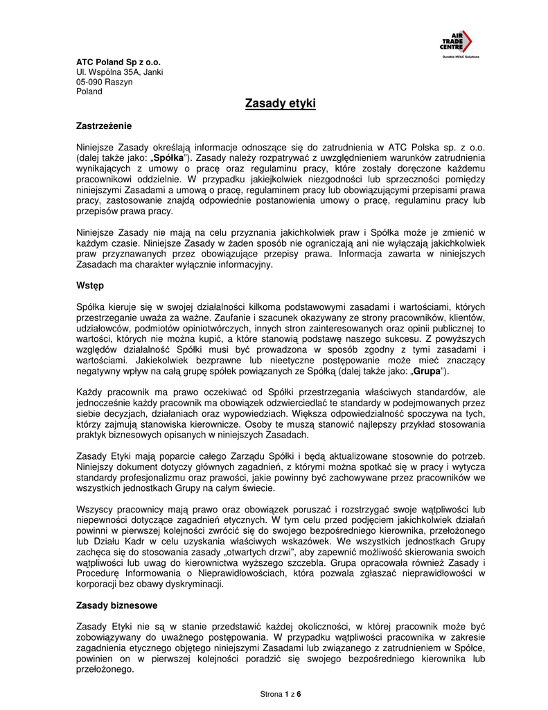 ATC Poland Sp z o.o. Ul. Wspólna 35A, Janki 05-090 Raszyn Poland Zasady etyki Zastrzeżenie Niniejsze Zasady określają informacje odnoszące się do zatrudnienia w ATC Polska sp. z o.o. (dalej także jako: „Spółka”). Zasady należy rozpatrywać z uwzględnieniem warunków zatrudnienia wynikających z umowy o pracę oraz regulaminu pracy, które zostały doręczone każdemu pracownikowi oddzielnie. W przypadku jakiejkolwiek niezgodności lub sprzeczności pomiędzy niniejszymi Zasadami a umową o pracę, regulaminem pracy lub obowiązującymi przepisami prawa pracy, zastosowanie znajdą odpowiednie postanowienia umowy o pracę, regulaminu pracy lub przepisów prawa pracy. Niniejsze Zasady nie mają na celu przyznania jakichkolwiek praw i Spółka może je zmienić w każdym czasie. Niniejsze Zasady w żaden sposób nie ograniczają ani nie wyłączają jakichkolwiek praw przyznawanych przez obowiązujące przepisy prawa. Informacja zawarta w niniejszych Zasadach ma charakter wyłącznie informacyjny. Wstęp Spółka kieruje się w swojej działalności kilkoma podstawowymi zasadami i wartościami, których przestrzeganie uważa za ważne. Zaufanie i szacunek okazywany ze strony pracowników, klientów, udziałowców, podmiotów opiniotwórczych, innych stron zainteresowanych oraz opinii publicznej to wartości, których nie można kupić, a które stanowią podstawę naszego sukcesu. Z powyższych względów działalność Spółki musi być prowadzona w sposób zgodny z tymi zasadami i wartościami. Jakiekolwiek bezprawne lub nieetyczne postępowanie może mieć znaczący negatywny wpływ na całą grupę spółek powiązanych ze Spółką (dalej także jako: „Grupa”). Każdy pracownik ma prawo oczekiwać od Spółki przestrzegania właściwych standardów, ale jednocześnie każdy pracownik ma obowiązek odzwierciedlać te standardy w podejmowanych przez siebie decyzjach, działaniach oraz wypowiedziach. Większa odpowiedzialność spoczywa na tych, którzy zajmują stanowiska kierownicze. Osoby te muszą stanowić najlepszy przykład stosowania praktyk biznesowych opisanych w niniejszych Zasadach. Zasady Etyki mają poparcie całego Zarządu Spółki i będą aktualizowane stosownie do potrzeb. Niniejszy dokument dotyczy głównych zagadnień, z którymi można spotkać się w pracy i wytycza standardy profesjonalizmu oraz prawości, jakie powinny być zachowywane przez pracowników we wszystkich jednostkach Grupy na całym świecie. Wszyscy pracownicy mają prawo oraz obowiązek poruszać i rozstrzygać swoje wątpliwości lub niepewności dotyczące zagadnień etycznych. W tym celu przed podjęciem jakichkolwiek działań powinni w pierwszej kolejności zwrócić się do swojego bezpośredniego kierownika, przełożonego lub Działu Kadr w celu uzyskania właściwych wskazówek. We wszystkich jednostkach Grupy zachęca się do stosowania zasady „otwartych drzwi”, aby zapewnić możliwość skierowania swoich wątpliwości lub uwag do kierownictwa wyższego szczebla. Grupa opracowała również Zasady i Procedurę Informowania o Nieprawidłowościach, która pozwala zgłaszać nieprawidłowości w korporacji bez obawy dyskryminacji. Zasady biznesowe Zasady Etyki nie są w stanie przedstawić każdej okoliczności, w której pracownik może być zobowiązywany do uważnego postępowania. W przypadku wątpliwości pracownika w zakresie zagadnienia etycznego objętego niniejszymi Zasadami lub związanego z zatrudnieniem w Spółce, powinien on w pierwszej kolejności poradzić się swojego bezpośredniego kierownika lub przełożonego. Strona 1 z 6 ATC Poland Sp z o.o. Ul. Wspólna 35A, Janki 05-090 Raszyn Poland W celu umiejętnego zarządzania swoimi zobowiązaniami Spółka opracowała i używa szerokiego zakresu zasad. Wszyscy pracownicy są z nimi zapoznawani za pośrednictwem stron intranetowych i internetowych, podręczników, szkoleń i materiałów szkoleniowych, poprzez Przegląd Wydajności i Rozwoju Zawodowego oraz poprzez wewnętrzne programy poszerzające wiedzę. Poniżej przedstawiono kluczowe zasady biznesowe: 1 Naszą zasadą jest przestrzeganie przepisów prawa obowiązujących w każdym kraju naszej działalności. 2 Nie uznaje się żadnych przejawów dyskryminacji ani terroru psychologicznego. 3 Naszym celem jest zdobycie i utrzymywanie opinii odpowiedzialnego partnera pośród lokalnych społeczności. 4 Uprawnienia wynikające z obowiązującego prawa i prawa moralne innych będą uwzględniane w naszych działaniach biznesowych. 5 Zapewniamy naszym pracownikom bezpieczne i higieniczne środowisko pracy. 6 Będziemy czynnie zarządzać naszymi zobowiązaniami wobec środowiska. 7 Nie powinniśmy świadomie wprowadzać w błąd. 8 Nie dokonujemy darowizn na cele polityczne. 9 Zabrania się przyjmowania lub wręczania łapówek. 10 Należy unikać konfliktu interesów i każdorazowo informować o jego wystąpieniu. 11 Pracowników zachęca się do zgłaszania jakichkolwiek podejrzewanych nieprawidłowości. Zgodność z przepisami prawa Zgodnie z naszymi zasadami jesteśmy zobowiązani do przestrzegania przepisów prawa obowiązujących w krajach, stanach lub innych jurysdykcjach naszej działalności. Zgodnie z naszymi zasadami w pełni współpracujemy z właściwymi organami publicznymi i nadzorującymi. Prawa człowieka Zgodnie z naszymi zasadami respektujemy prawa człowieka względem każdej osoby oraz jednocześnie zapewniamy poniższe: 1 Pracownicy mają swobodę zrzeszania bez obawy dyskryminacji przeciwko korzystaniu z takich swobód; 2 Zakazane jest przymuszanie do pracy oraz praca dzieci; 3 Zapewnia się właściwe ograniczenia dostępu i korzystania z danych osobowych; 4 Zapewnia się poszanowanie prywatności. Zatrudnienie, dyskryminacja i terror psychologiczny Naszym celem jest oferowanie jednoznacznych i sprawiedliwych warunków zatrudnienia oraz zapewnianie pracownikom właściwych możliwości rozwoju ich umiejętności i rozwoju k