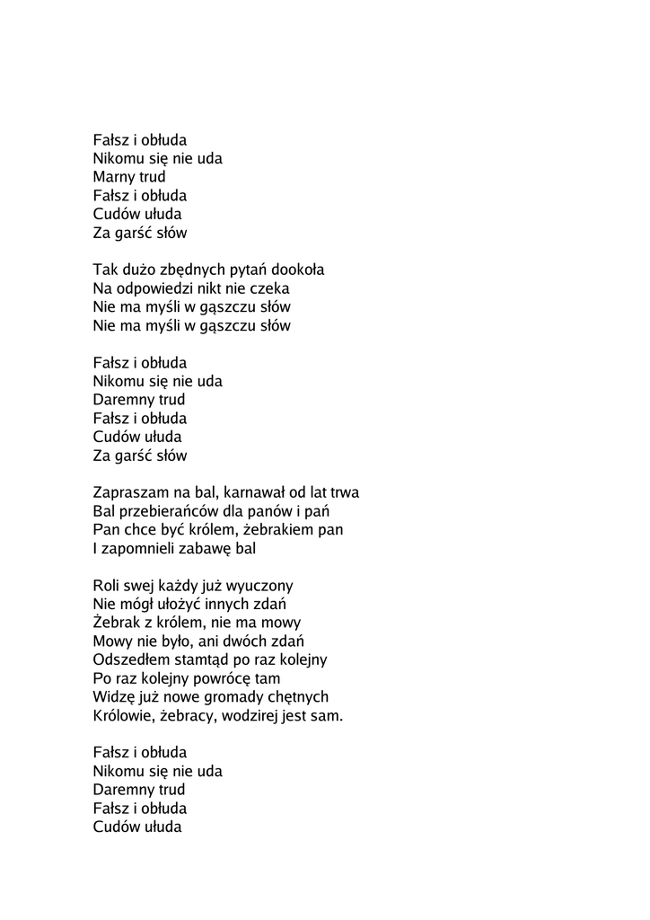 Fałsz i obłuda Nikomu się nie uda Marny trud Fałsz i obłuda Cudów ułuda Za garść słów Tak dużo zbędnych pytań dookoła Na odpowiedzi nikt nie czeka Nie ma myśli w gąszczu słów Nie ma myśli w gąszczu słów Fałsz i obłuda Nikomu się nie uda Daremny trud Fałsz i obłuda Cudów ułuda Za garść słów Zapraszam na bal, karnawał od lat trwa Bal przebierańców dla panów i pań Pan chce być królem, żebrakiem pan I zapomnieli zabawę bal Roli swej każdy już wyuczony Nie mógł ułożyć innych zdań Żebrak z królem, nie ma mowy Mowy nie było, ani dwóch zdań Odszedłem stamtąd po raz kolejny Po raz kolejny powrócę tam Widzę już nowe gromady chętnych Królowie, żebracy, wodzirej jest sam. Fałsz i obłuda Nikomu się nie uda Daremny trud Fałsz i obłuda Cudów ułuda Za garść słów Zapraszam na bal, karnawał od lat trwa Bal przebierańców dla panów i pań Fałsz i obłuda Nikomu się nie uda Daremny trud Fałsz i obłuda Cudów ułuda Za garść słów
