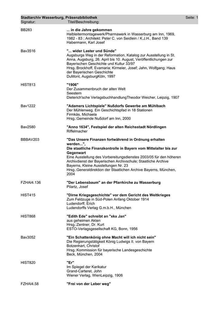 Stadtarchiv Wasserburg, Präsenzbibliothek Signatur: Titel/Beschreibung: BB283 ... in die Jahre gekommen Halbleitermontagewerk/Pharmawerk in Wasserburg am Inn, 1969, 1982 - 83 ; Architekt: Peter C. von Seidlein / K.J.H., Band 139 Habermann, Karl Josef Bav3516 "... wider Laster und Sünde" Augsburgs Weg in der Reformation, Katalog zur Ausstellung in St. Anna, Augsburg, 26. April bis 10. August, Veröffentlichungen zur Bayerischen Geschichte und Kultur 33/97 Hrsg.:Brockhoff, Evamaria; Kirmeier, Josef; Jahn, Wolfgang; Haus der Bayerischen Geschichte DuMont, AugsburgKöln, 1997 HIST813 "1906" Der Zusammenbruch der alten Welt Seestern Dieterich'sche VerlagsbuchhandlungTheodor Weicher, Leipzig, 1907 Bav1222 "Adamers Lichtspiele" Nußdorfs Gewerbe am Mühlbach Der Mühlenweg. Ein Geschichtspfad in 18 Stationen Firmkäs, Michaela Hrsg.:Gemeinde Nußdorf am Inn, 2000 Bav2580 "Anno 1634", Festspiel der alten Reichsstadt Nördlingen Riffelmacher BBBAV203 "Das Unsere Finanzen fortwährend in Ordnung erhalten werden...", Die staatliche Finanzkontrolle in Bayern vom Mittelalter bis zur Gegenwart Eine Ausstellung des Vorbereitungsdienstes 2003/05 für den höheren Archivdienst der Bayerischen Archivschule; Staatliche Archive Bayerns, Kleine Ausstellungen Nr. 23 Hrsg.:Generaldirektion der Staatlichen Archive Bayerns, München, 2004 FZHAI4.136 "Der Lebensbaum" an der Pfarrkirche zu Wasserburg Pilartz, Josef HIST415 "Dirne Kriegsgeschichte" vor dem Gericht des Weltkrieges Zum Feldzuge in Süd-Polen Anfang Oktober 1914 Ludendorff, Erich Ludendorffs Verlag G.m.b.H., München HIST868 "Edith Ede" schreibt an "xkx Jan" aus geheimen Akten Hrsg.:Zentner, Dr. Kurt ESTO-Verlagsgesellschaft KG, Bonn, 1956 Bav3052 "Ein Schattenkönig ohne Macht will ich nicht sein" Die Regierungstätigkeit König Ludwigs II. von Bayern Botzenhart, Christof Hrsg.:Kommission für bayerische Landesgeschichte Beck, München, 2004 HIST820 "Er" Im Spiegel der Karikatur Grand-Carteret, John Wiener Verlag, WienLeipzig, 1906 FZHAI4.58 "Frei von der Leber weg" Seite: 1 Stadtarchiv Wasserburg, Präsenzbibliothek Signatur: Titel/Beschreibung: BBBAV180 "fürste in der ferne" Das Herzogtum Niederbayern - Straubimg - Holland Krenn, Dirit-Maria; Wild, Joachim Hrsg.:Haus der Bayerischen Geschichte Haus der Bayerischen Geschichte, Augsburg, 2003 Bav1406 "Gott zur Ehr, dem Nächsten zur Wehr." Zur Geschichte der Feuerwehr in Bayerisch-Schwaben Heydenreuter, Reinhard; Steck, Thomas; Steiner, Günter Hrsg.:Staatsarchiv Augsburg, 2000 Bav301 "He found Coburg, ,deadly dull' " Herzog Alfred von Sachsen-Coburg und Gotha (1844-1900) Eine Ausstellung des Staatsarchivs Coburg in Zusammenarbeit mit dem Thüringischen Staatsarchiv Gotha Hrsg.:Generaldirektion der Staatlichen Archive Bayerns , 2000 Bav2636 "Heimkehr in die Jugendzeit", Zum Jubliäum der Luitpold-Oberrealschule Wasserburg a. Inn, 1874/1964 Boehme, Dr. Guido, 1964 BBFO16 "Hellafandt alhier" Der reisende Elefant Vom lebenden Fürstengeschank zum Kunstkammerobjekt Halbritter, Roland Hrsg.:Brückner, Wolfgang, Würzburg, 2002 in: Jahrbuch für Volkskunde, Sonderdruck 2002 Bav1147 "Himmel und Erde sind weniger als du" Die barocke Volkspredigt in Bayern. Der Prediger Abraham a Sancta Clara Kohlbrenner, Johann; Wittmann,Theodor Hrsg.:Kulturamt der Stadt Rosenheim, 1991 FZHAI4.105 "In Leibgeding" in Volkmannsdorf Bergmeister, K. BBFO39 "Ius naturae", ein lateinisches Werk aus der Archiv- und Studienbibliothek des städtischen Heimatmuseums Wasserburg a. Inn Facharbeit im Leistungskurs Latein Tommaso Sala Luitpold-Gymnasium, 1997 HIST435 "Jildirim" Deutsche Streiter auf heiligem Boden Band 4, Mit 4 Karten u. 8 Bildtafeln Steuber, Dr. Hrsg.:Reichsarchiv Gerhard Stalling, Oldenburg, 1924 Bav3557 "Kurzweil viel ohn` Maß und Ziel" Alltag und Festtag auf den Augsburger Monatsbildern der Renaissance Hrsg.:Deutsches Historisches Museum Berlin Hirmer, München, 1994 FZHAI4.95 "Leyden Christi tragedi" Auffindung eines alten Passionsspieles in Wasserburg a. Inn Freye, Prof. Paul Seite: 2 Stadtarchiv Wasserburg, Präsenzbibliothek Signatur: Titel/Beschreibung: Bav3034 "Macht oder Verstand" Ausstelungskatalog 2003 Dizdarevic, Ismet; Kulenovic, Trvtko; Hadzismajlovic, Vefik Hrsg.:TKD Sahinpasic, 2003 Bav3556 "Nicht durch Krieg, Kauf oder Erbschaft" Ausstellung des Staatarchivs Coburg anläßlich der 75. Wiederkehr der Vereinigung Coburgs mit Bayern am 1. Juli 1920, Nr.34 Hrsg.:Generaldirektion der Staatlichen Archive Bayerns Selbstverlag, München, 1995 FZHAI4.186 "Römergräben" bei Penzing Dollacker, A. Bav3286 "Stolz auf Heimat?" 29. Bayerischer Heimattag vom 20. bis 23. Juni 1997 in Bamberg; Dokumentationen zum Bayerischen Heimattag, Heft 1 Herzog, Roman; Denzler, Günther; Guttenberg, Enoch Freiherr von und zu ; Rosendorfer, Herbert; Maier, Hans; Roth, Hans Hrsg.:Arbeitsgemeinschaft "Der Bayerische Heimattag", München, 1997 Bav4347 "Stolz auf Heimat?" 29. Bayerischer Heimattag vom 20. bis 23. Juni 1997 in Bamberg Hrsg.:Arbeitsgemeinschaft "Der Bayrische Heimattag" Frühmorgen & Holzmann GmbH, München, 1997 HIST815 "U 202" Kriegstagebuch Angefangen den 12. April 19.., Abgeschlossen den 30. April 19.. Spiegel, Freiherr von August Scherl G.m.b.H., Berlin, 1916 BBBAV171 "Weimar" im evangelischen Bayern Politische Mentalität und Parteiwesen 1918-1933 mit einem Ausblick auf die Zeit nach 1945 Kittel, Manfred Hrsg.:Bayerische Landeszentrale für politische Bildungsarbeit, München, 2002 Bav728 "...wo die Hauptstärke des Reiches liegt..." Die Anfänge der 700jährigen Herrschaft der Wittelsbacher in der Rheinpfalz Westrich, Klaus-Peter Hrsg.:Bayerische Vereinsbank, 1977 BAVARIA ANTIQUA BB382 1. Bezirksmusikfest 1955 in Wasserburg am Inn, 1955 3 Overheadfolien: 1 Einladung des Festausschusses zum 1. Bezirksmusikfest; 1 Einladung der Stadtkapelle Wasserburg zum 1. Bezirksmusikfest; 1 Overheadfolie mit Zeitungsartikeln: Konzert der kleinen Bläser. Werbung für das aktive Musizieren, Fünf Kapellen trommeln für die Ope