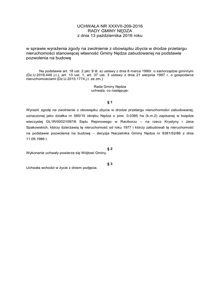 UCHWAŁA NR XXXVII-209-2016 RADY GMINY NĘDZA z dnia 13 października 2016 roku w sprawie wyrażenia zgody na zwolnienie z obowiązku zbycia w drodze przetargu nieruchomości stanowiącej własność Gminy Nędza zabudowanej na podstawie pozwolenia na budowę Na podstawie art. 18 ust. 2 pkt. 9 lit. a) ustawy z dnia 8 marca 1990r. o samorządzie gminnym (Dz.U.2016.446 j.t.), art. 13 ust. 1, art. 37 ust. 3 ustawy z dnia 21 sierpnia 1997 r. o gospodarce nieruchomościami (Dz.U.2015.1774 j.t. ze zm.) Rada Gminy Nędza uchwala, co następuje: §1 Wyrazić zgodę na zwolnienie z obowiązku zbycia w drodze przetargu nieruchomości zabudowanej, oznaczonej jako działka nr 585/15 obrębu Nędza o pow. 0,0385 ha (k.m.2) zapisanej w księdze wieczystej GL1R/00021097/6 Sądu Rejonowego w Raciborzu – na rzecz Krystyny i Jana Spakowskich, którzy dzierżawią tę nieruchomość od roku 1977 i którzy zabudowali tę nieruchomość na podstawie pozwolenia na budowę – decyzja Naczelnika Gminy Nędza nr 8381/52/86 z dnia 11.09.1986 r. §2 Wykonanie uchwały powierza się Wójtowi Gminy. §3 Uchwała wchodzi w życie z dniem podjęcia.
