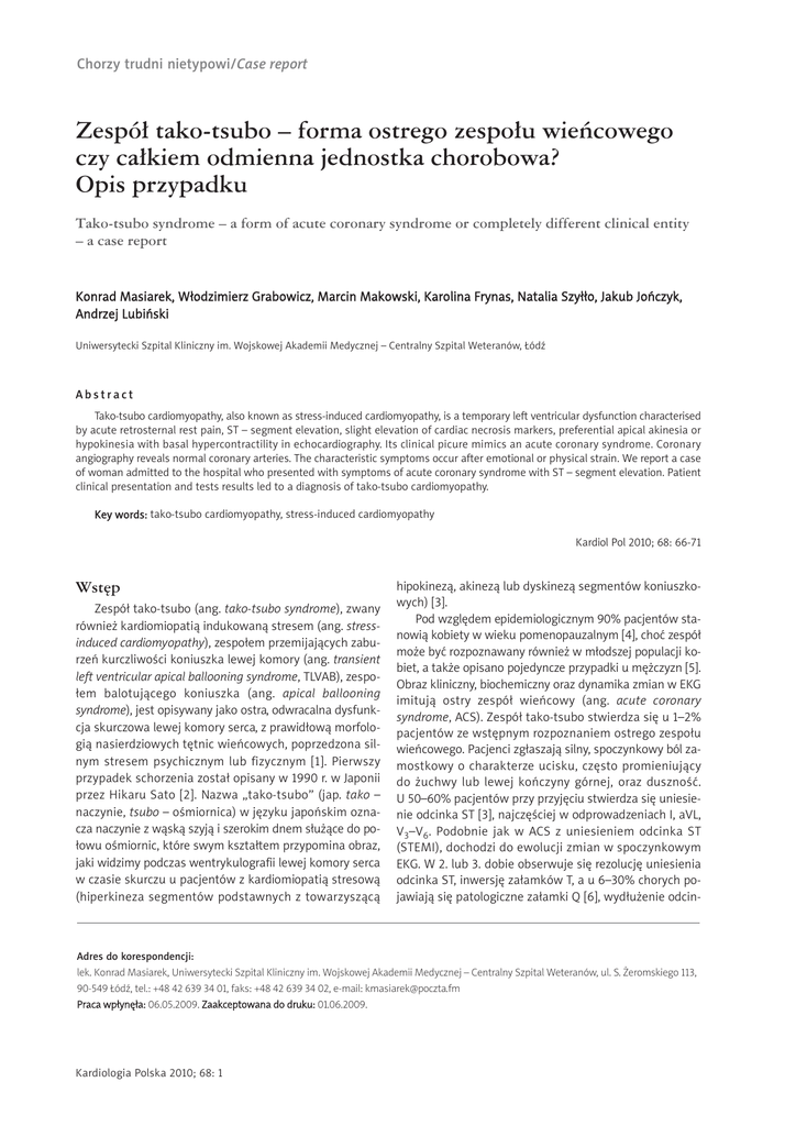 Chorzy trudni nietypowi/Case report Zespół tako-tsubo – forma ostrego zespołu wieńcowego czy całkiem odmienna jednostka chorobowa? Opis przypadku Tako-tsubo syndrome – a form of acute coronary syndrome or completely different clinical entity – a case report Konrad Masiarek, Włodzimierz Grabowicz, Marcin Makowski, Karolina Frynas, Natalia Szyłło, Jakub Jończyk, Andrzej Lubiński Uniwersytecki Szpital Kliniczny im. Wojskowej Akademii Medycznej – Centralny Szpital Weteranów, Łódź Abstract Tako-tsubo cardiomyopathy, also known as stress-induced cardiomyopathy, is a temporary left ventricular dysfunction characterised by acute retrosternal rest pain, ST – segment elevation, slight elevation of cardiac necrosis markers, preferential apical akinesia or hypokinesia with basal hypercontractility in echocardiography. Its clinical picure mimics an acute coronary syndrome. Coronary angiography reveals normal coronary arteries. The characteristic symptoms occur after emotional or physical strain. We report a case of woman admitted to the hospital who presented with symptoms of acute coronary syndrome with ST – segment elevation. Patient clinical presentation and tests results led to a diagnosis of tako-tsubo cardiomyopathy. Key words: tako-tsubo cardiomyopathy, stress-induced cardiomyopathy Kardiol Pol 2010; 68: 66-71 Wstęp Zespół tako-tsubo (ang. tako-tsubo syndrome), zwany również kardiomiopatią indukowaną stresem (ang. stressinduced cardiomyopathy), zespołem przemijających zaburzeń kurczliwości koniuszka lewej komory (ang. transient left ventricular apical ballooning syndrome, TLVAB), zespołem balotującego koniuszka (ang. apical ballooning syndrome), jest opisywany jako ostra, odwracalna dysfunkcja skurczowa lewej komory serca, z prawidłową morfologią nasierdziowych tętnic wieńcowych, poprzedzona silnym stresem psychicznym lub fizycznym [1]. Pierwszy przypadek schorzenia został opisany w 1990 r. w Japonii przez Hikaru Sato [2]. Nazwa „tako-tsubo” (jap. tako – naczynie, tsubo – ośmiornica) w języku japońskim oznacza naczynie z wąską szyją i szerokim dnem służące do połowu ośmiornic, które swym kształtem przypomina obraz, jaki widzimy podczas wentrykulografii lewej komory serca w czasie skurczu u pacjentów z kardiomiopatią stresową (hiperkineza segmentów podstawnych z towarzyszącą hipokinezą, akinezą lub dyskinezą segmentów koniuszkowych) [3]. Pod względem epidemiologicznym 90% pacjentów stanowią kobiety w wieku pomenopauzalnym [4], choć zespół może być rozpoznawany również w młodszej populacji kobiet, a także opisano pojedyncze przypadki u mężczyzn [5]. Obraz kliniczny, biochemiczny oraz dynamika zmian w EKG imitują ostry zespół wieńcowy (ang. acute coronary syndrome, ACS). Zespół tako-tsubo stwierdza się u 1–2% pacjentów ze wstępnym rozpoznaniem ostrego zespołu wieńcowego. Pacjenci zgłaszają silny, spoczynkowy ból zamostkowy o charakterze ucisku, często promieniujący do żuchwy lub lewej kończyny górnej, oraz duszność. U 50–60% pacjentów przy przyjęciu stwierdza się uniesienie odcinka ST [3], najczęściej w odprowadzeniach I, aVL, V3–V6. Podobnie jak w ACS z uniesieniem odcinka ST (STEMI), dochodzi do ewolucji zmian w spoczynkowym EKG. W 2. lub 3. dobie obserwuje się rezolucję uniesienia odcinka ST, inwersję załamków T, a u 6–30% chorych pojawiają się patologiczne załamki Q [6], wydłużenie odcin- Adres do korespondencji: lek. Konrad Masiarek, Uniwersytecki Szpital Kliniczny im. Wojskowej Akademii Medycznej – Centralny Szpital Weteranów, ul. S. Żeromskiego 113, 90-549 Łódź, tel.: +48 42 639 34 01, faks: +48 42 639 34 02, e-mail: [email protected] Praca wpłynęła: 06.05.2009. Zaakceptowana do druku: 01.06.2009. Kardiologia Polska 2010; 68: 1 Zespół tako-tsubo – forma ostrego zespołu wieńcowego czy całkiem odmienna jednostka chorobowa? Opis przypadku ka PQ średnio do 450–501 ms, a także świeży blok prawej lub lewej odnogi pęczka Hisa [7]. Normalizacja zmian EKG następuje w ciągu 7–191 dni, ale zawsze z opóźnieniem w stosunku do normalizacji funkcji skurczowej lewej komory serca [8]. W echokardiografii przezklatkowej stwierdza się hipokinezę, akinezę lub dyskinezę segmentów koniuszkowych oraz hiperkinezę segmentów podstawnych z obniżeniem frakcji wyrzutowej lewej komory serca (LVEF), która przy przyjęciu waha się od 20 do 50%. W ciągu kolejnych 2–4 tygodni dochodzi do normalizacji funkcji skurczowej lewej komory serca [7]. Obserwuje się nieznaczny wyrzut biochemicznych markerów martwicy mięśnia sercowego, nieadekwatny do obrazu zaburzeń kurczliwości mięśnia lewej komory serca [8]. U chorych obserwowano także wzrost stężenia serotoniny, neuropeptydu Y i mózgowego peptydu natriuretycznego (ang. brain natriuretic peptide, BNP) [7]. W badaniu angiograficznym nie stwierdza się istotnych zaburzeń w morfologii nasierdziowych tętnic wieńcowych (ewentualne zwężenia < 50%). Etiopatogeneza kardiomiopatii stresowej, mimo wielu lat badań, nie jest do końca poznana. Istnieje wiele dowodów wskazujących na zaburzenie mikrokrążenia wieńcowego jako efekt gwałtownych zmian hormonalnych lub elektrolitowych, z których najważniejsze to: zwiększona aktywność układu współczulnego, niedobór estrogenów, zwiększony sercowy metabolizm adenozyny oraz nadmierna retencja potasu w przestrzeni pozakomórkowej kardiomiocytów [9]. Ze względu na nie do końca poznaną etiologię leczenie jest empiryczne, zależne od obrazu klinicznego. W ostrej fazie choroby uzasadnione jest stosowanie kwasu acetylosalicylowego, beta-adrenolityków, inhibitorów konwertazy angiotensyny. Rokowanie w zespole tako-tsubo jest na ogół dobre, jednak w piśmiennictwie istnieją doniesienia na temat przypadków powikłanych wstrząsem kardiogennym (wówczas zasadne wydaje się założenie kontrapulsacji wewnątrzaortalnej) [10], nagłym zatrzymaniem 