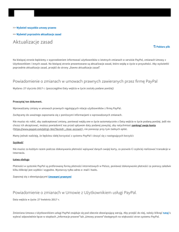 >> Wyświetl wszystkie umowy prawne >> Wyświetl poprzednie aktualizacje zasad Aktualizacje zasad Pobierz plik PDF Na bieżącej stronie będziemy z wyprzedzeniem informować użytkowników o istotnych zmianach w serwisie PayPal, zmianach Umowy z Użytkownikiem i innych zasad. Na bieżącej stronie prezentowane są aktualizacje zasad, które wejdą w życie w przyszłości. Aby wyświetlić poprzednie aktualizacje zasad, przejdź do strony „Dawne aktualizacje zasad”. Powiadomienie o zmianach w umowach prawnych zawieranych przez firmę PayPal Wydano: 27 stycznia 2017 r. (poszczególne Daty wejścia w życie zostały podane poniżej) Przeczytaj ten dokument. Wprowadzamy zmiany w umowach prawnych regulujących relacje użytkowników z firmą PayPal. Zachęcamy do uważnego zapoznania się z poniższymi informacjami o wprowadzanych zmianach. Nie musisz nic robić, aby zaakceptować zmiany, ponieważ wejdą one w życie automatycznie z Datą wejścia w życie podaną poniżej. Jeśli nie chcesz ich akceptować, możesz powiadomić nas przed upływem daty podanej powyżej, aby natychmiast zamknąć swoje konto (https://www.paypal.com/pl/cgi-bin/?&cmd=_close-account), nie ponosząc przy tym żadnych opłat. Mamy jednak nadzieję, że będziesz dalej korzystać z systemu PayPal i cieszyć się z następujących korzyści: Szybkość Nie musisz za każdym razem podczas dokonywania płatności wpisywać danych swojej karty, co pozwala Ci szybciej realizować transakcje w Internecie. Łatwa obsługa Płatności w systemie PayPal są preferowaną formą płatności internetowych w Polsce, ponieważ dokonywanie płatności za pomocą zaledwie kilku kliknięć jest szybkie i wygodne. Wystarczy tylko adres e-mail i hasło. Zapoznaj się z obowiązującymi Umowami prawnymi Powiadomienie o zmianach w Umowie z Użytkownikiem usługi PayPal. Data wejścia w życie: 27 kwietnia 2017 r. Zmieniona Umowa z Użytkownikiem usługi PayPal znajduje się pod obecnie obowiązującą wersją. Aby przejść do niej, należy kliknąć tutaj lub wybrać odpowiednie łącze w stopkach „Informacje prawne” lub „Umowy prawne” dostępnych na większości stron systemu PayPal. 1. Źródła finansowania płatności Dodano nowy punkt 3 (Źródła finansowania płatności), który łączy, reorganizuje i zmienia następujące poniższe punkty: 3.4 (Domyślne źródła finansowania płatności), 3.5 (Preferowane źródło finansowania płatności), 3.6 (Ograniczenia źródeł finansowania płatności), 3.7 (Przelewy bankowe) i 3.13 (Informacje o karcie), w specjalnym punkcie celem dalszego objaśnienia m.in. możliwości w zakresie wybierania i używania Źródeł finansowania płatności (oraz korzystania ze Szczególnych warunków finansowania płatności) na potrzeby zasilania Salda Pieniądzem elektronicznym. Sposób wybierania i używania Preferowanego źródła płatności do Polecenia płatności szczegółowo opisuje punkt 3.6. W takim przypadku do pokrycia Polecenia płatności wykorzystywany jest Pieniądz elektroniczny uzyskany na podstawie Szczególnych warunków finansowania płatności (wcześniej Szczególnego źródła finansowania płatności) i z wcześniej istniejącego Salda (w tej kolejności), a dopiero na końcu z Preferowanych źródeł finansowania płatności. Po wprowadzeniu przez firmę PayPal nowej struktury źródeł finansowania (o czym firma PayPal powiadomi w opublikowanym na ten temat zawiadomieniu na stronie Aktualizacje zasad dostępnej u dołu większości stron internetowych systemu PayPal w dniu 27 kwietnia 2017 r. lub później, według własnego uznania), firma PayPal może używać Preferowanego źródła finansowania płatności do zakupu Pieniądza elektronicznego na potrzeby pokrycia Polecenia płatności, nawet jeżeli Użytkownik posiada środki na koncie, zgodnie z pozostałymi postanowieniami Umowy z Użytkownikiem. Nowy punkt 3 przyjmuje następujące brzmienie: „3. Źródła finansowania płatności. 3.1 Powiązanie źródła finansowania płatności. Użytkownik może powiązać kartę debetową, kredytową, przedpłaconą (w niektórych przypadkach), rachunek bankowy lub konto PayPal Credit, jako Źródło finansowania płatności na koncie PayPal. Należy pamiętać, aby informacje o Źródle finansowania płatności były zawsze aktualne (takie jak nr i data ważności karty). W przypadku zmiany tych informacji firma PayPal może je zaktualizować zgodnie z zaleceniem wydawcy karty bez konieczności działania po stronie Użytkownika. Użytkownik może wybrać opcję potwierdzenia numeru karty lub rachunku bankowego, co umożliwia firmie PayPal sprawdzenie, czy jest on właścicielem konta oraz czy jego karta jest ważna. Można to zrobić także poprzez wykonanie Procedury powiązywania i potwierdzania karty lub rachunku bankowego lub za pomocą innych procedur, o których firma PayPal będzie okresowo informować w powiadomieniach lub publikacjach. 3.2 Karty. Poprzez powiązanie karty debetowej, kredytowej lub (w niektórych przypadkach) przedpłaconej jako Źródła finansowania płatności, Użytkownik udziela firmie PayPal bezterminowego upoważnienia do automatycznego pobierania z takiej karty kwoty koniecznej do pokrycia kosztów zakupu Pieniądza elektronicznego wymaganego na Saldzie do opłacenia Polecenia płatności (i opłat za transakcję należnych firmie PayPal), jeśli taka karta została wskazana jako Źródło finansowania płatności za Polecenie płatności zgodnie z postanowieniami niniejszej Umowy. Użytkownik może wycofać wspomniane bezterminowe upoważnienie w odniesieniu do dowolnej karty. W tym celu musi usunąć daną kartę z listy Źródeł finansowania płatności w Profilu swojego Konta. 3.3 Rachunki bankowe. Poprzez powiązanie swojego rachunku bankowego jako Źródła finansowania płatności, Użytkownik udziela firmie PayPal bezterminowego upoważnienia do automatycznego obciążania rachunku bankowego na kwotę konieczną do