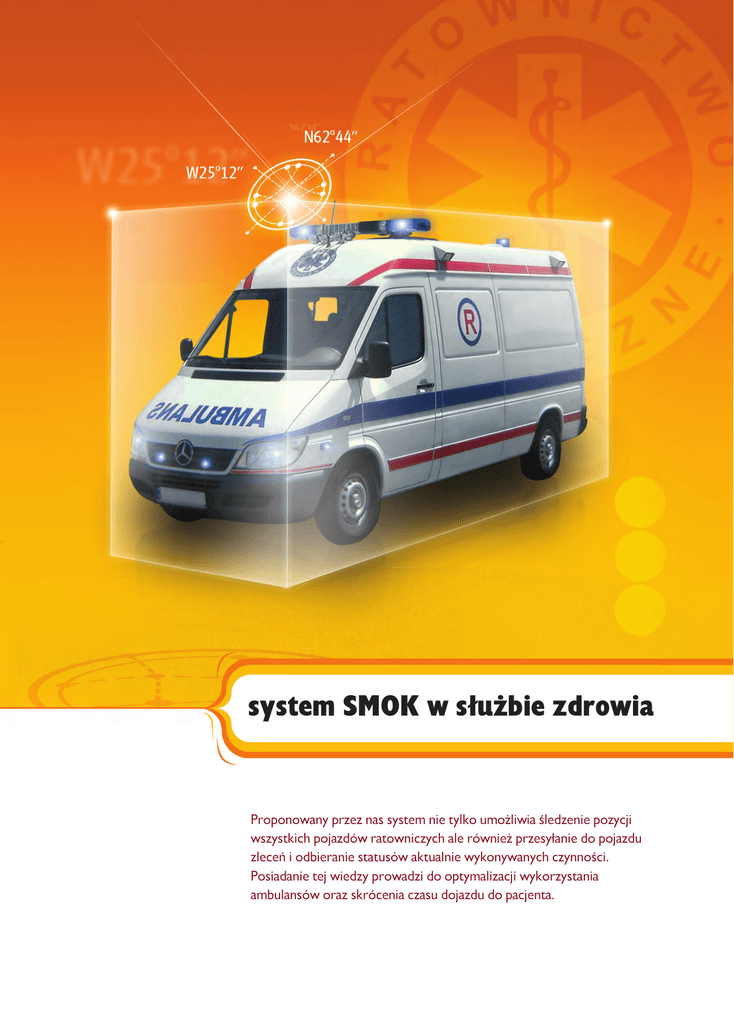 system SMOK w służbie zdrowia Proponowany przez nas system nie tylko umożliwia śledzenie pozycji wszystkich pojazdów ratowniczych ale również przesyłanie do pojazdu zleceń i odbieranie statusów aktualnie wykonywanych czynności. Posiadanie tej wiedzy prowadzi do optymalizacji wykorzystania ambulansów oraz skrócenia czasu dojazdu do pacjenta. System w SMOK w służbie zdrowia Czas dojazdu karetki do jakiegokolwiek wypadku często decyduje o życiu człowieka. Niezmiernie ważna jest więc bieżąca kontrola położenia oraz zadań wykonywanych przez ambulanse działające na określonym terenie. Często zdarza się, że z powodu złej koordynacji wyjazdów karetek i nieodpowiedniego zaplanowania tras przejazdów lub rozmieszczenia baz czas dojazdu do pacjenta niepotrzebnie się wydłuża a koszty eksploatacji rosną. Proponowany przez nas system nie tylko umożliwia śledzenie pozycji wszystkich pojazdów ratowniczych ale również przesyłanie do pojazdu zleceń i odbieranie statusów aktualnie wykonywanych czynności. Posiadanie tej wiedzy prowadzi do optymalizacji wykorzystania ambulansów oraz skrócenia czasu dojazdu do pacjenta. Po analizie występujących problemów i sprecyzowaniu potrzeb system lokalizacji pojazdów SMOK (wykorzystujący technologię GPS) w 2008 roku został dostosowany do spełniania wymagań zamawiającego i wdrożony na potrzeby Wielkopolskiego Urzędu Wojewódzkiego w Poznaniu w ponad stu ambulansach. Wdrożony system monitoruje ambulanse medyczne funkcjonujące w systemie Państwowego Ratownictwa Medycznego na obszarze województwa wielkopolskiego dając możliwość weryfikacji, zarządzania i kontroli jakości świadczonej usługi. W zależności od potrzeb i funkcjonujących na danym terenie procedur konfiguracja systemu jest indywidualnie dostosowywana. Poniżej zamieszczony jest opis systemu wdrożonego przez nas w Wielkopolsce. System składa się z następujących elementów: • Bazowej Stacji Monitorującej zawierającej: - Serwer bazowy z zainstalowanym oprogramowaniem umożliwiającym komunikacje z pojazdami oraz podłączenie 100 komputerów z zainstalowanym oprogramowaniem typu klient; - Cyfrowy plan województwa; • Oprogramowania typu klient zawierającego: - Program GPS Monitor do bieżącego zarządzania flotą - Program Rejestr GPS do tworzenia analiz i statystyk • Urządzeń pojazdowych zamontowanych w ambulansach: - Sterowników pojazdowych ET-GPS - GSM - Terminali statusów System charakteryzuje się następującymi cechami: możliwość bieżącego monitorowania • Zapewnia położenia pojazdów wraz z wyświetleniem aktualnego statusu każdego lokalizowanego ambulansu medycznego; • Umożliwia przekazywanie danych z pojazdów on-line do serwera bazowego poprzez sieć telefonii komórkowej GSM (z wykorzystaniem technologii GPRS); • Zapewnia możliwość tworzenia analiz i statystyk na podstawie danych przekazywanych w systemie; • System ma możliwość pracy zarówno na APN-ie prywatnym jak i na publicznym; • Mapy są zainstalowane na komputerach użytkownika systemu oraz na serwerze bazowym; • Urządzenia pojazdowe posiadają możliwość zdalnej wymiany oprogramowania umożliwiającą w przyszłości rozszerzenie funkcjonalności bez konieczności przeprowadzenia prac serwisowych na pojazdach i wymiany urządzeń; • Oprogramowanie jest modułem niezależnym tzn. właścicielem wszystkich urządzeń jak też licencji aplikacji i planu jest użytkownik systemu, z eksploatacją systemu nie wiążą się z żadne opłaty na rzecz dostawcy systemu bądź innych podmiotów np. okresowe opłaty za licencje, obowiązkowe przeglądy itp. Jedynymi opłatami związanymi z jego eksploatacją są opłaty na rzecz operatora sieci GSM za karty SIM zainstalowane w bazowym i pojazdowych modemach GSM; • Oprogramowanie ma możliwość przechowywania wszystkich danych historycznych z monitorowanych pojazdów w bazie SQL; • Urządzenia pojazdowe są, z poziomu dostarczonego oprogramowania serwera bazowego, zdalnie konfigurowane w zakresie np.: - trybu i częstotliwości zapisu danych w „czarnej skrzynce” tj. odległościowym i czasowym; - trybu i częstotliwości transmisji danych z urządzenia pojazdowego na bieżąco; - bazowego adresu IP, pod który mają być transmitowane dane; - konfiguracji parametrów pracy w sieci GSM; • Konfiguracja serwera umożliwia rozbudowę systemu w przyszłości tak, aby możliwym było monitorowanie większej ilości pojazdów i podłączenie kolejnych stanowisk obsługi systemu typu klient. System w SMOK w służbie zdrowia Funkcje oprogramowania: • Śledzenie i zarządzanie pojazdami w czasie rzeczywistym; • Bieżące kontrolowanie, gdzie w danej chwili znajdują się pojazdy, czy na czas docierają do miejsc przeznaczenia itp. • Wyświetlanie położenia, prędkości poruszania i aktualnego statusu pojazdu; • Wysyłanie zleceń; • Prezentacja graficzna na planie przebytej trasy; • Rysowanie na planie tras wzorcowych; • Przesyłanie informacji o czasie i miejscu załączenia i wyłączenia sygnałów uprzywilejowania; • Definiowanie kryteriów umożliwiających automatyczne informowanie dyspozytora o nieprawidłowościach; • Zaznaczenie obszarów w celu kontroli wjazdów i wyjazdów; • Rozliczanie pracy kierowców i pojazdów oraz sporządzanie raportów; • Tworzenie listy tras przejazdów określonych parametrem czasu, tj. dzień, godzina, minuta, pozwalających na wykonywanie indywidualnych analiz, rysowanie wykresów, obliczanie przebytej drogi, itp.; • Wykonywanie w formie szczegółowej zestawienia karty drogowej składającej się z miedzy innymi z następujących pozycji: - numeru pojazdu; - czasookresu raportu; • • • • - ilości przejechanych kilometrów; - łącznego czasu jazdy; - łącznego czasu postojów; - prędkość maksymalnej; Rozliczenie czasu pracy jest dokonywane zarówno dla pojedynczego pojazdu jak i dla grupy pojazdów (w formi