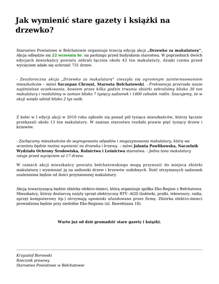 Jak wymienić stare gazety i książki na drzewko? Starostwo Powiatowe w Bełchatowie organizuje trzecią edycję akcji „Drzewko za makulaturę”. Akcja odbędzie się 22 września br. na parkingu przed budynkiem starostwa. W poprzednich dwóch edycjach mieszkańcy powiatu zebrali łącznie około 43 ton makulatury, dzięki czemu przed wycięciem udało się uchronić 731 drzew. - Zeszłoroczna akcja „Drzewko za makulaturę” cieszyła się ogromnym zainteresowaniem mieszkańców – mówi Szczepan Chrzęst, Starosta Bełchatowski. - Frekwencja przerosła nasze najśmielsze oczekiwania, bowiem przez kilka godzin trwania zbiórki zebraliśmy blisko 30 ton makulatury i rozdaliśmy w zamian blisko 7 tysięcy sadzonek i 1400 cebulek roślin. Szacujemy, że w akcji wzięło udział blisko 2 tys osób. Z kolei w I edycji akcji w 2010 roku zgłosiło się ponad pół tysiąca mieszkańców, którzy łącznie przekazali około 13 ton makulatury. W zamian starostwo rozdało prawie pięć tysięcy drzew i krzewów. - Zachęcamy mieszkańców do segregowania odpadów i magazynowania makulatury, którą we wrześniu będzie można wymienić na drzewka i krzewy. – mówi Jolanta Pawlikowska, Naczelnik Wydziału Ochrony Środowiska, Rolnictwa i Leśnictwa starostwa. - Jedna tona makulatury ratuje przed wycięciem aż 17 drzew. W ramach akcji mieszkańcy powiatu bełchatowskiego mogą przynosić do miejsca zbiórki makulaturę i wymieniać ją na sadzonki drzew i krzewów ozdobnych. Ilość otrzymanych sadzonek uzależniona będzie od ilości przyniesionej makulatury. Akcją towarzyszącą będzie zbiórka elektro-śmieci, którą organizuje spółka Eko-Region z Bełchatowa. Mieszkańcy, którzy dostarczą zużyty sprzęt elektryczny RTV -AGD (lodówki, pralki, telewizory, radia, sprzęt komputerowy itp.) otrzymają upominki ufundowane przez firmę. Zbiórka elektro-śmieci prowadzona będzie przy siedzibie Eko-Regionu (ul. Bawełniana 18). Warto już od dziś gromadzić stare gazety i książki. Krzysztof Borowski Rzecznik prasowy Starostwo Powiatowe w Bełchatowie