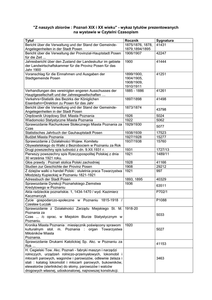 "Z naszych zbiorów : Poznań XIX i XX wieku" - wykaz tytułów prezentowanych na wystawie w Czytelni Czasopism Tytuł Bericht über die Verwaltung und der Stand der GemeindeAngelegenheiten in der Stadt Posen Bericht über die Verwaltung der Provinzial-Hauptstadt Posen für die Zeit ... Jahresbericht über den Zustand der Landeskultur im gebiete der Landwirtschaftskammer für die Provinz Posen für das Jahr 1900 Voranschlag für die Einnahmen und Ausgaben der Stadtgemeinde Posen Verhandlungen des vereinigten engeren Ausschusses der Hauptgesellschaft und der Jahresgesellschaften … Verkehrs=Statistik des Bezirks der Königlichen Eisenbahn=Direktion zu Posen für das Jahr Bericht über die Verwaltung und der Stand der GemeindeAngelegenheiten in der Stadt Posen Orędownik Urzędowy Stoł. Miasta Poznania Wiadomości Statystyczne Miasta Poznania Sprawozdanie Rachunkowe Stołecznego Miasta Poznania za Czas Statistisches Jahrbuch der Gauhauptstadt Posen Budżet Miasta Poznania Sprawozdanie z Działalności Wojew. Komitetu Obywatelskiego do Walki z Bezrobociem w Poznaniu za Rok Drugi powszechny spis ludności z dn. 9.XII.1931 r. Pierwszy powszechny spis Rzeczypospolitej Polskiej z dnia 30 września 1921 roku. Głos prawdy : Poznań stolica Polski zachodniej Studien zur Geschichte der Provinz Posen Z dziejów walki o handel Polski : stuletnia praca Towarzystwa Młodzieży Kupieckiej w Poznaniu 1821-1921 Adressbuch der Stadt Posen Sprawozdanie Dyrekcji Poznańskiego Ziemstwa Kredytowego w Poznaniu Akta radzieckie poznańskie. 1, 1434-1470 / wyd. Kazimierz Kaczmarczyk Życie gospodarczo-społeczne w Poznaniu 1815-1918 / Czesław Łuczak Sprawozdanie z Działalności Zarządu Miejskiego St. M. Poznania za Czas ... /c oprac. w Miejskim Biurze Statystycznym w Poznaniu. Kronika Miasta Poznania : miesięcznik poświęcony sprawom kulturalnym stoł. m. Poznania : organ Towarzystwa Miłośników Miasta Poznania. Sprawozdanie Drukarni Katolickiej Sp. Akc. w Poznaniu za Rok ... H. Cegielski Tow. Akc. Poznań - fabryki maszyn i narzędzi rolniczych, urządzeń rolniczo-przemysłowych, lokomobil i młocarń parowych, wagonów i parowozów, odlewnie żelaza i stali : katalog lokomobil i młocarń parowych, bukowników, elewatorów (stertników) do słomy, parowozów i walców drogowych własnej, udoskonalonej, najnowszej konstrukcji. Rocznik 1875/1876, 1878, 1879,1894/1895 1906/1907 Sygnatura 41431 1900 41444 1899/1900, 1904/1905, 1908/1909, 1910/1911 1885 - 1886 41251 1897/1898 41498 1873/1874 42247 41261 43798 1926 1922 1929/1930 5024 5062 1938/1939 1927/1928 1937/1938 17523 15277 15760 1931 1921 1727/13 1489/11 1928 1908 1921 41166 29212 997 1893, 1895 1936 40329 5077 63511 P702/1 P1088 1918-20 5033 1920 5027 41153 3463 Dziennik Zarządzeń Dyrekcji Okręgu Poczt i Telegrafów w Poznaniu. Jak powstał Związek Towarzystw Kupieckich w Poznaniu : jak wyglądał u nas handel i przemysł przed pięćdziesięciu laty / Bolesław Kasprowicz 5769 41887 Spis Abonentów Sieci Telefonicznych Dyrekcji Okręgu Poczt i Telegrafów w Poznaniu na ... R. / Ministerstwo Poczt i Telegrafów - Adressbuch der Stadt Posen. Geschäfts-Bericht : ultimo Juni ... / Posener Pferde-Eisenbahn-Gesellschaft. /1884 i 1909 43020 1884 i 1909 Dampfkessel-Überwachungs-Verein für die Provinz Posen 1907 i 1913 mit dem Sitze in Posen : ... Geschäftsbericht ... . 43004 41744 Geschäfts-Abschluss der Vesta : Lebensversicherungs-Bank auf Gegenseitigkeit zu Posen per .... 41308 Amtsblatt der Königlichen Regierung zu Posen. 40936 Przewodnik ilustrowany po mieście Poznaniu : ze szkicem historycznym i planem miasta / T. K. Wieczorkiewicz. 20114 KSIĘGA pamiątkowa miasta Poznania : dziesięć lat pracy Polskiego Zarządu Stołecznego Miasta Poznania 70271 Dyr. Bilans ... / "Goplana" Poznańska Fabryka Czekolady Tow. Akc. 41171