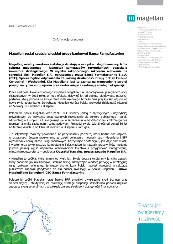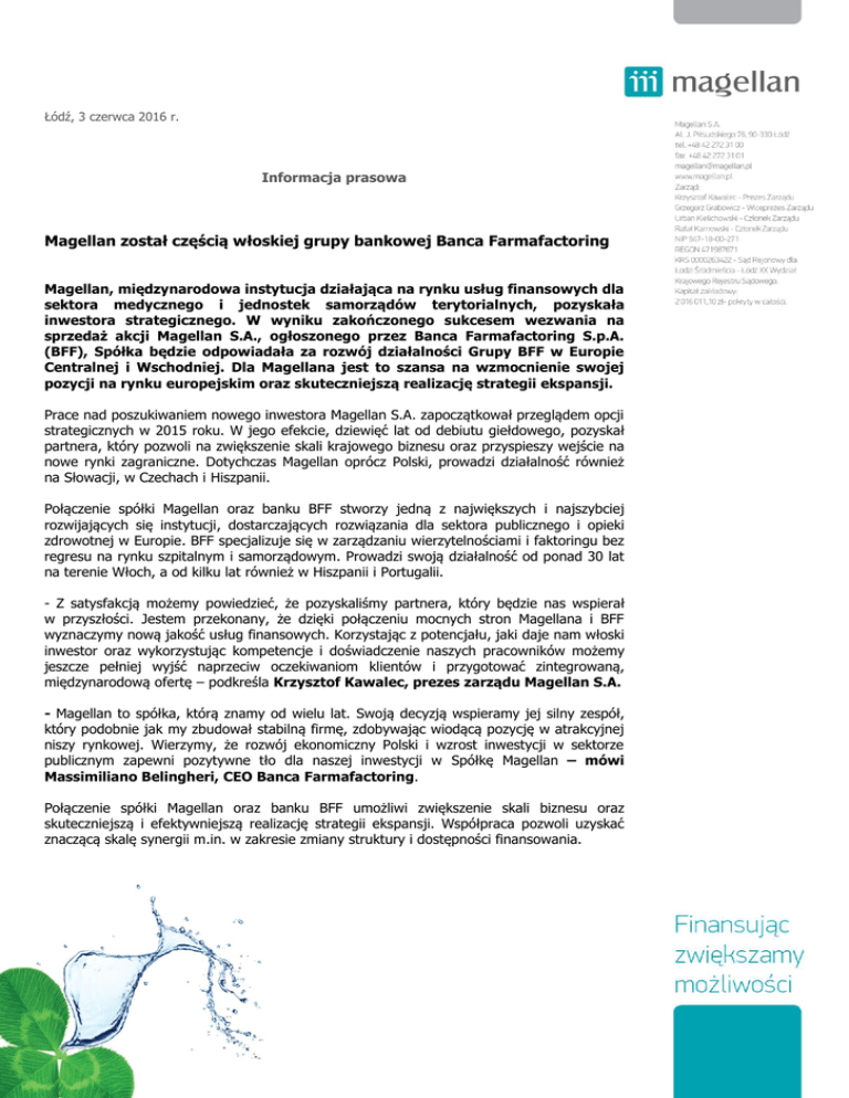 Łódź, 3 czerwca 2016 r. Informacja prasowa Magellan został częścią włoskiej grupy bankowej Banca Farmafactoring Magellan, międzynarodowa instytucja działająca na rynku usług finansowych dla sektora medycznego i jednostek samorządów terytorialnych, pozyskała inwestora strategicznego. W wyniku zakończonego sukcesem wezwania na sprzedaż akcji Magellan S.A., ogłoszonego przez Banca Farmafactoring S.p.A. (BFF), Spółka będzie odpowiadała za rozwój działalności Grupy BFF w Europie Centralnej i Wschodniej. Dla Magellana jest to szansa na wzmocnienie swojej pozycji na rynku europejskim oraz skuteczniejszą realizację strategii ekspansji. Prace nad poszukiwaniem nowego inwestora Magellan S.A. zapoczątkował przeglądem opcji strategicznych w 2015 roku. W jego efekcie, dziewięć lat od debiutu giełdowego, pozyskał partnera, który pozwoli na zwiększenie skali krajowego biznesu oraz przyspieszy wejście na nowe rynki zagraniczne. Dotychczas Magellan oprócz Polski, prowadzi działalność również na Słowacji, w Czechach i Hiszpanii. Połączenie spółki Magellan oraz banku BFF stworzy jedną z największych i najszybciej rozwijających się instytucji, dostarczających rozwiązania dla sektora publicznego i opieki zdrowotnej w Europie. BFF specjalizuje się w zarządzaniu wierzytelnościami i faktoringu bez regresu na rynku szpitalnym i samorządowym. Prowadzi swoją działalność od ponad 30 lat na terenie Włoch, a od kilku lat również w Hiszpanii i Portugalii. - Z satysfakcją możemy powiedzieć, że pozyskaliśmy partnera, który będzie nas wspierał w przyszłości. Jestem przekonany, że dzięki połączeniu mocnych stron Magellana i BFF wyznaczymy nową jakość usług finansowych. Korzystając z potencjału, jaki daje nam włoski inwestor oraz wykorzystując kompetencje i doświadczenie naszych pracowników możemy jeszcze pełniej wyjść naprzeciw oczekiwaniom klientów i przygotować zintegrowaną, międzynarodową ofertę – podkreśla Krzysztof Kawalec, prezes zarządu Magellan S.A. - Magellan to spółka, którą znamy od wielu lat. Swoją decyzją wspieramy jej silny zespół, który podobnie jak my zbudował stabilną firmę, zdobywając wiodącą pozycję w atrakcyjnej niszy rynkowej. Wierzymy, że rozwój ekonomiczny Polski i wzrost inwestycji w sektorze publicznym zapewni pozytywne tło dla naszej inwestycji w Spółkę Magellan – mówi Massimiliano Belingheri, CEO Banca Farmafactoring. Połączenie spółki Magellan oraz banku BFF umożliwi zwiększenie skali biznesu oraz skuteczniejszą i efektywniejszą realizację strategii ekspansji. Współpraca pozwoli uzyskać znaczącą skalę synergii m.in. w zakresie zmiany struktury i dostępności finansowania. O Grupie Magellan Grupa Magellan dostarcza zindywidualizowane usługi finansowe, które umożliwiają optymalne i efektywne zarządzanie finansami przez podmioty działające na rynku medycznym i jednostek samorządów terytorialnych. Przez ponad 18 lat działalności udzieliła 9,1 mld zł finansowania. Aktywnie współpracuje z ponad 500 podmiotami na rynku medycznym. Magellan S.A. prowadzi również działalność na terenie Czech i Słowacji poprzez spółki zależne - Magellan Česká republika s.r.o. z siedzibą w Pradze i Magellan Central Europe s.r.o. z siedzibą w Bratysławie. Do Grupy Kapitałowej Magellan należy również Oddział Korporacyjny w Hiszpanii z siedzibą w Barcelonie. W czerwcu 2010 założona została spółka zależna MEDFinance S.A., która zajmuje się finansowaniem inwestycji w sektorze ochrony zdrowia w Polsce. Magellan S.A. jest notowany na GPW od 1 października 2007 r. Więcej informacji: www.magellansa.pl O Grupie Banca Farmafactoring Grupa BFF to niezależny włoski bank, specjalizujący się w obszarze zarządzania wierzytelnościami i faktoringu należności na rynku opieki medycznej i sektora samorządowego w Europie Południowej (Włochy, Hiszpania, Portugalia). W 2015 roku Grupa BFF zarządzała wierzytelnościami o łącznej wartości 6,286 mln Euro i osiągnęła zysk brutto w wysokości 96.3 mln Euro. Bank BFF został założony w 1985 w Mediolanie, a obecnie ma swoje biura w Rzymie, Madrycie i Barcelonie. Więcej informacji: www.bancafarmafactoring.it Więcej informacji udziela: Paulina Szwed-Dobrzyńska, Magellan S.A., tel. +48 42 272 32 37, kom. +48 609 294 634, [email protected] Sabrina Ragone, Barabino&Partners, tel. +39 02 72023535, kom.+39 338 2519534, [email protected] Elena Bacis, Barabino&Partners, tel. +39 02 72023535, kom. +39 329 0742079, [email protected]