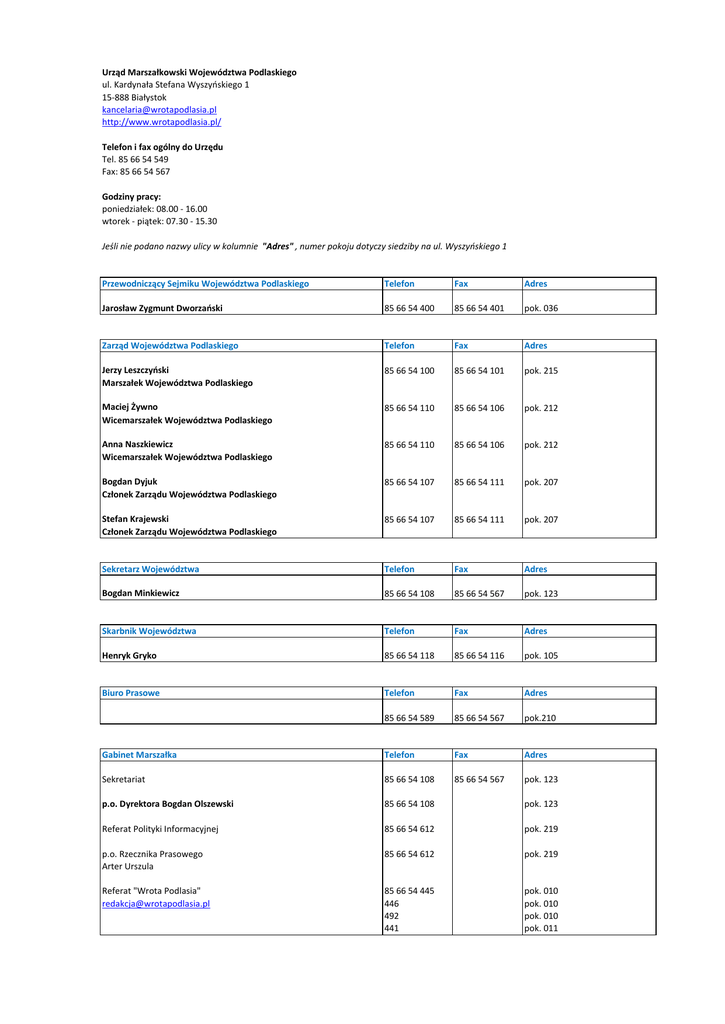Urząd Marszałkowski Województwa Podlaskiego ul. Kardynała Stefana Wyszyńskiego 1 15-888 Białystok [email protected] http://www.wrotapodlasia.pl/ Telefon i fax ogólny do Urzędu Tel. 85 66 54 549 Fax: 85 66 54 567 Godziny pracy: poniedziałek: 08.00 - 16.00 wtorek - piątek: 07.30 - 15.30 Jeśli nie podano nazwy ulicy w kolumnie "Adres" , numer pokoju dotyczy siedziby na ul. Wyszyńskiego 1 Przewodniczący Sejmiku Województwa Podlaskiego Telefon Fax Adres Jarosław Zygmunt Dworzański 85 66 54 400 85 66 54 401 pok. 036 Zarząd Województwa Podlaskiego Telefon Fax Adres Jerzy Leszczyński Marszałek Województwa Podlaskiego 85 66 54 100 85 66 54 101 pok. 215 Maciej Żywno Wicemarszałek Województwa Podlaskiego 85 66 54 110 85 66 54 106 pok. 212 Anna Naszkiewicz Wicemarszałek Województwa Podlaskiego 85 66 54 110 85 66 54 106 pok. 212 Bogdan Dyjuk Członek Zarządu Województwa Podlaskiego 85 66 54 107 85 66 54 111 pok. 207 Stefan Krajewski Członek Zarządu Województwa Podlaskiego 85 66 54 107 85 66 54 111 pok. 207 Sekretarz Województwa Telefon Fax Adres Bogdan Minkiewicz 85 66 54 108 85 66 54 567 pok. 123 Skarbnik Województwa Telefon Fax Adres Henryk Gryko 85 66 54 118 85 66 54 116 pok. 105 Biuro Prasowe Telefon Fax Adres 85 66 54 589 85 66 54 567 pok.210 Gabinet Marszałka Telefon Fax Adres Sekretariat 85 66 54 108 85 66 54 567 pok. 123 p.o. Dyrektora Bogdan Olszewski 85 66 54 108 pok. 123 Referat Polityki Informacyjnej 85 66 54 612 pok. 219 p.o. Rzecznika Prasowego Arter Urszula 85 66 54 612 pok. 219 Referat "Wrota Podlasia" [email protected] 85 66 54 445 446 492 441 pok. 010 pok. 010 pok. 010 pok. 011 Biuro Sejmiku Województwa Podlaskiego Telefon Fax Adres Sekretariat 85 66 54 400 85 66 54 401 pok. 032 Dyrektor Bogumiła Karniewicz 85 66 54 400 pok. 032 Biuro Sejmiku Województwa Podlaskiego 85 66 54 408 407 406 405 pok. 037 pok. 037 pok. 034 pok. 034 Biuro Audytu Wewnętrznego Telefon Fax Adres Dyrektor Piotr Trochimowicz 85 66 54 505 85 66 54 633 ul. Św. Rocha 13/15, pok. 3 Biuro Audytu Wewnętrznego 85 66 54 630 Biuro Zamówień Publicznych i Inwestycji Telefon Fax Adres Sekretariat 85 66 54 461 85 66 54 635 ul. Św. Rocha 13/15 pok. 5 Dyrektor Biura Łoziński Roman 85 66 54 461 ul. Św. Rocha 13/15 pok. 5 Referat Realizacji Inwestycji 85 66 54 621 629 624 ul. Św. Rocha 13/15 pok. 7 ul. Św. Rocha 13/15 pok. 7 ul. Św. Rocha 13/15 pok. 1 Referat Rozliczeń 626 636 ul. Św. Rocha 13/15 pok. 1 ul. Św. Rocha 13/15 pok. 11 Referat ds. projektu Trasy rowerowe 85 66 54 634 ul. Św. Rocha 13/15, pok. 11 Referat Zamówień Publicznych 85 66 54 551 421 642 pok. 616 pok. 616 Biuro Kontroli Finansowej Telefon Fax Adres Dyrektor Barbara Wójcik 85 66 54 638 Biuro Kontroli Finansowej 85 66 54 625 85 66 54 625 ul. Św. Rocha 13/15, pok. 3 Biuro Prawne Telefon Fax Adres ul. Św. Rocha 13/15, pok. 10 Dyrektor Zadykowicz Wojciech z-ca Dyrektora Klimowicz Jacek 85 66 54 570 572 574 pok. 614 pok. 613 pok. 613 Biuro Prawne 85 66 54 333 ul. Poleska 89, pok. 306 ul. Poleska 89, pok. 14 Biuro Prawne 85 66 54 271 704 ul. Kleeberga 20, pok 1A ul. Kleeberga 20, pok 1A Departament Edukacji, Sportu i Turystyki Telefon Fax Adres Sekretariat 85 66 54 171 85 66 54 481 pok. 314 Dyrektor Andruk Bartłomiej 85 66 54 171 pok. 314 Referat Sportu i Turystyki 85 66 54 485 484 489 pok. 317 pok. 317 pok. 317 488 483 486 pok. 311 pok. 311 pok. 311 Referat Edukacji 85 66 54 536 535 pok. 324 pok. 324 Samodzielne Stanowisko pracy ds. Pozyskiwania Środków Pozabudżetowych i Rozliczeń 85 66 54 483 pok. 311 Samodzielne Stanowisko pracy ds. Pozyskiwania Środków Pozabudżetowych i Rozliczeń (stypendia dla uzdolnionych uczniów) 85 66 54 641 pok. 321 513 pok. 321 Samodzielne Stanowisko pracy ds. Pozyskiwania Środków Pozabudżetowych i Rozliczeń (stypendia doktoranckie) 85 66 54 699 188 109 pok. 316 pok. 316 pok. 316 Departament Europejskiego Funduszu Społecznego Telefon Fax Adres Sekretariat 85 66 54 260 85 66 54 201 ul. Poleska 89, pok. 213 Dyrektor Elżbieta Barbara Romańczuk 85 66 54 260 85 66 54 201 ul. Poleska 89, pok. 212 z-ca Dyrektora Bogdan Mantur 85 66 54 260 85 66 54 201 ul. Poleska 89, pok. 214 z-ca Dyrektora Małgorzata Kukor-Kołodko 85 66 54 260 85 66 54 201 ul. Poleska 89, Referat Finansów i Monitorowania EFS 85 66 54 284 211 268 278 294 279 85 66 54 284 ul. Poleska 89, pok. 220 ul. Poleska 89, pok. 220 ul. Poleska 89, pok. 220 ul. Poleska 89, pok. 223 ul. Poleska 89, pok. 223 ul. Poleska 89, pok. 223 Referat Kontroli Systemowych i Projektów Konkursowych w ramach oddolnych inicjatyw oraz Priorytetu VI i VIII PO KL 85 66 54 221 85 66 54 221 ul. Poleska 89, pok. 012 214 247 232 237 ul. Poleska 89, pok. 011 ul. Poleska 89, pok. 011 ul. Poleska 89, pok. 010 ul. Poleska 89, pok. 010 Referat Wdrażania Działań PO KL Wspierających Rozwój Wykształcenia 85 66 54 209 i Kompetencji 231 235 244 255 275 285 245 85 66 54 220 85 66 54 254 85 66 54 289 ul. Poleska 89, pok. 115 ul. Poleska 89, pok. 124 ul. Poleska 89, pok. 123 ul. Poleska 89, pok. 124 ul. Poleska 89, pok. 123 ul. Poleska 89, pok. 116 ul. Poleska 89, pok. 116 ul. Poleska 89, pok. 124 ul. Poleska 89, pok. 112 Referat Wdrażania Działań PO KL Wspierajacych Integrację Społeczną 251 258 259 281 283 288 273 Referat Wdrażania Działań PO KL Wspierających Promocje 85 66 54 286 przedsiębiorczości, Samozatrudnienie, Transfer Wiedzy oraz Inicjatywy Oddolne 246 261 296 ul. Poleska 89, pok. 113 ul. Poleska 89, pok. 113 ul. Poleska 89, pok. 111 ul. Poleska 89, pok. 111 ul. Poleska 89, pok. 114 ul. Poleska 89, pok. 114 ul. Poleska 89, pok. 112 85 66 54 282 ul. Poleska 89, pok. 121 ul. Poleska 89, pok. 120 ul. Poleska 89, pok. 121 ul. Poleska 89, pok. 122 Referat Kontroli Projektów Konkursowych w ramach priorytetu VII i IX 85 66 54 267 PO KL 297 265 269 274 85 66 54 274 Referat Koordynacji i Wdrażania PO KL 85 66 54 242 219 253 295 85 66 54 242 ul. Poleska 89, pok. 221 ul. Poleska 89, pok. 221 ul. Poleska 89, pok. 222 ul. Poleska 89, 